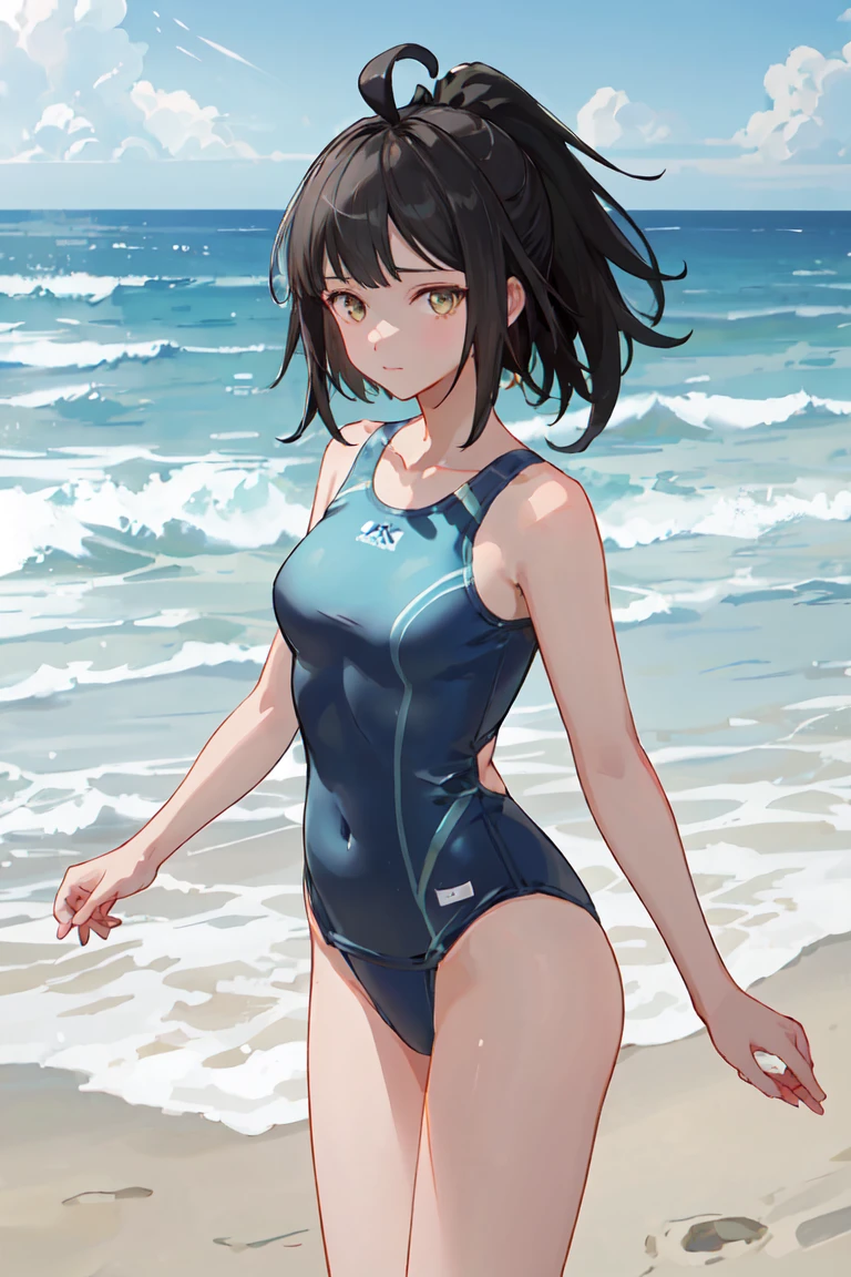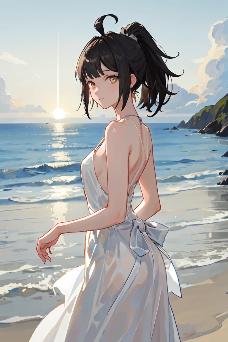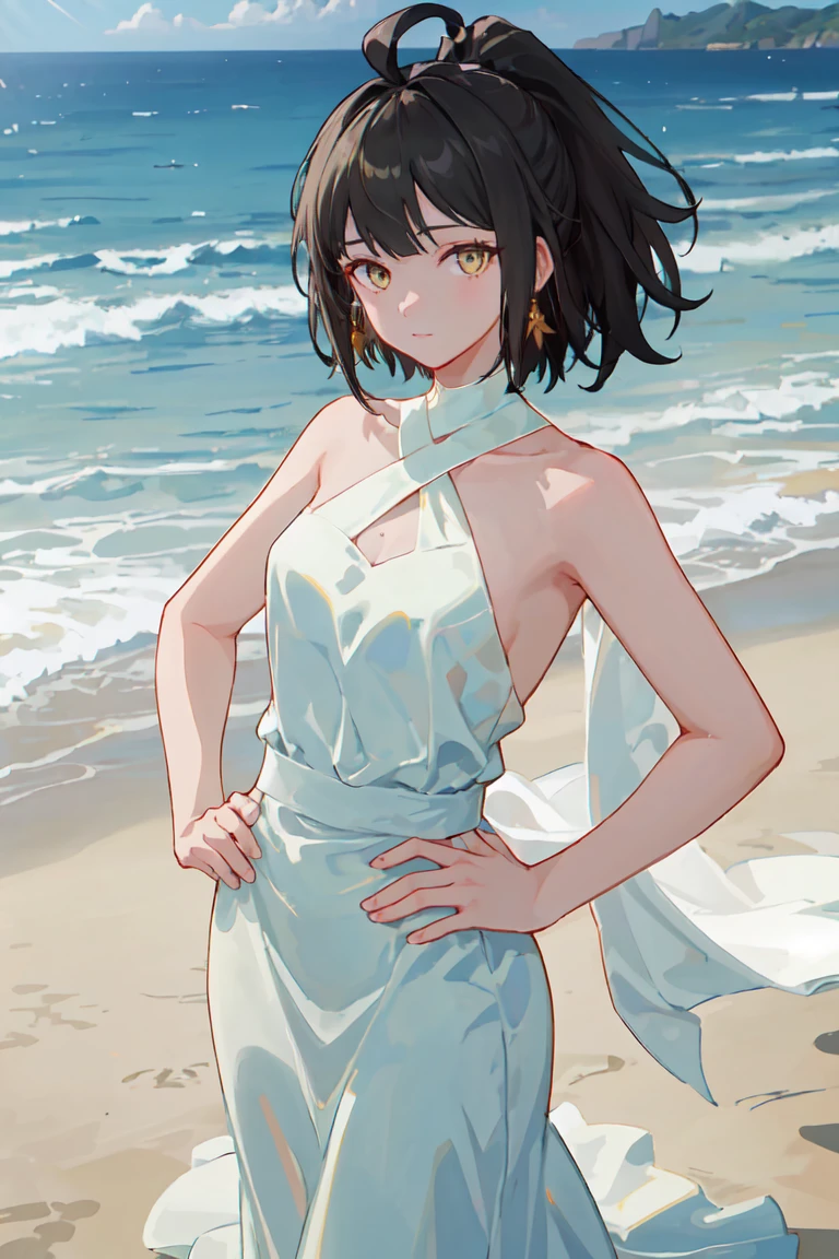 SIRIS, aqua_short dress, short sleeves, cross-laced_sandals, black_bracelet, black_choker, black_hair, ponytail, ahoge, yellow_eyes