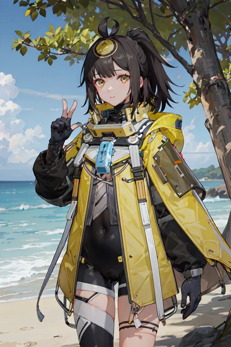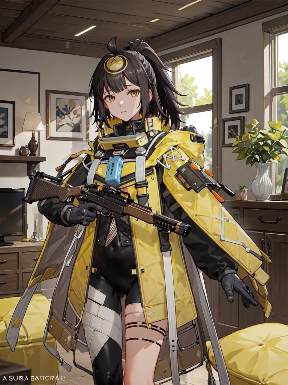 SIRIS, yellow_tactical_jacket, bodysuit_under_clothes, black_gloves, uneven_legwear, thigh_strap, hair_ornament, black_boots, black_hair, ponytail, ahoge, yellow_eyes,