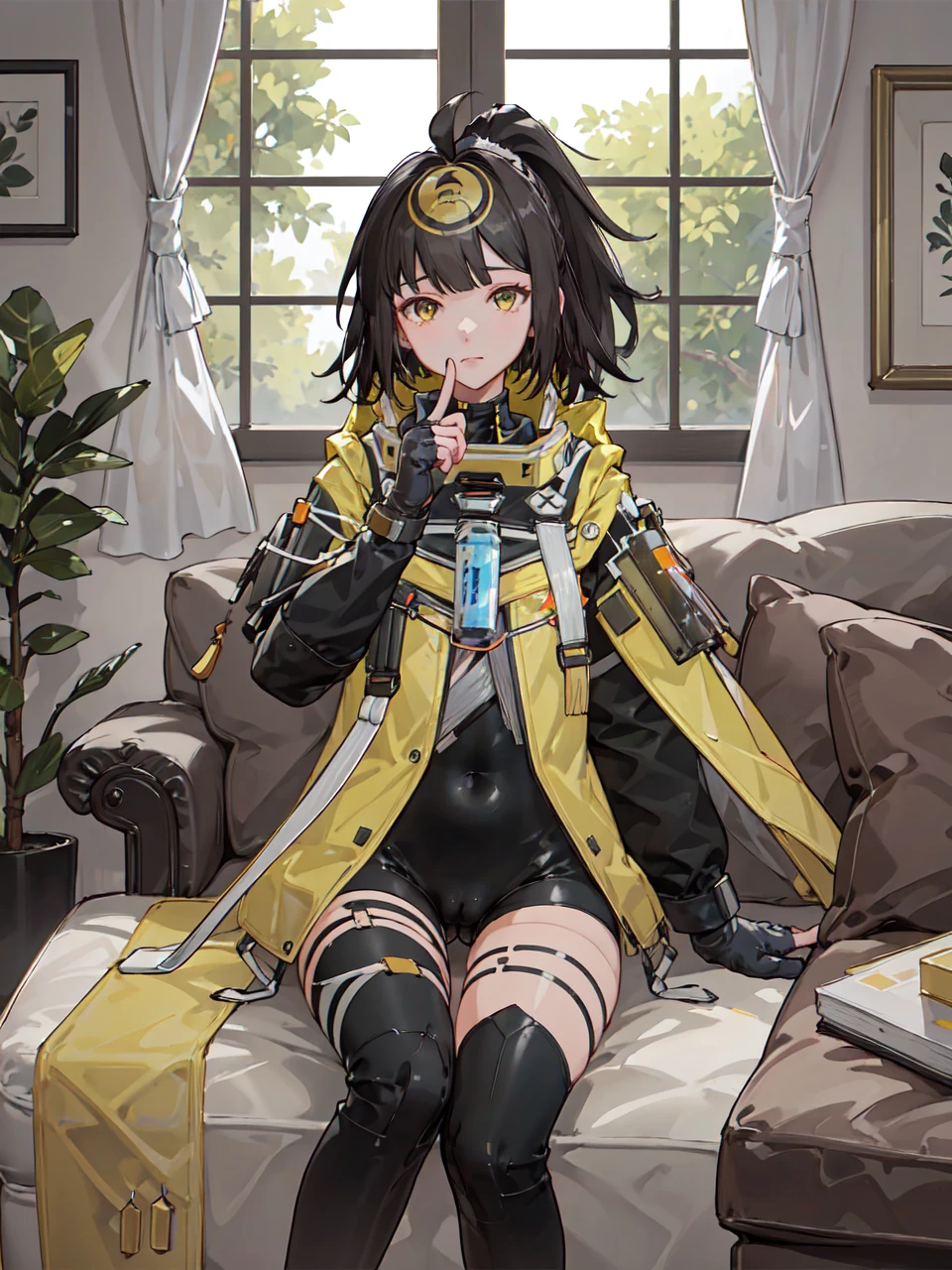 【yellow_tactical_jacket, bodysuit_under_clothes, black_gloves, uneven_legwear, thigh_strap, hair_ornament, 】