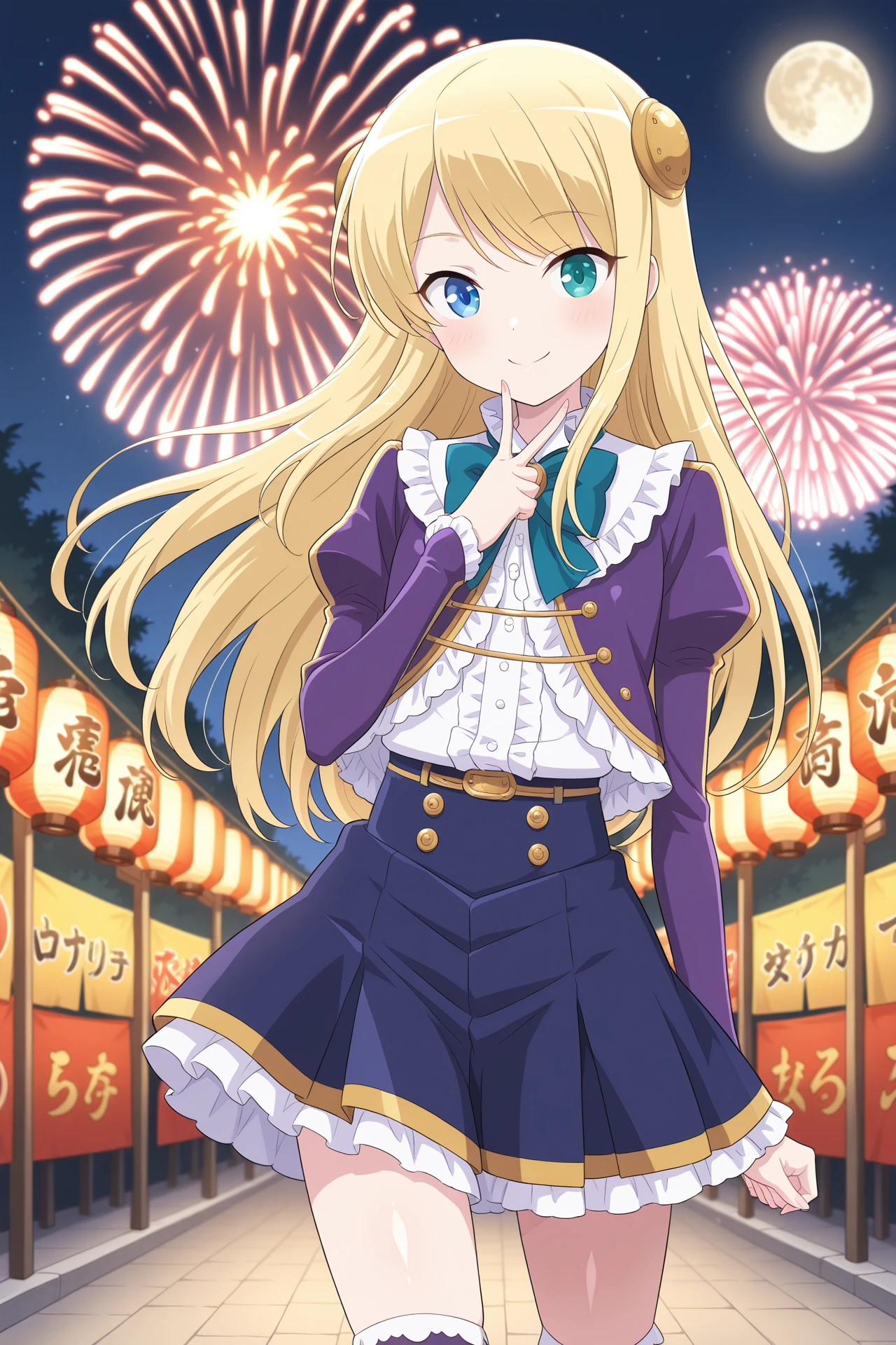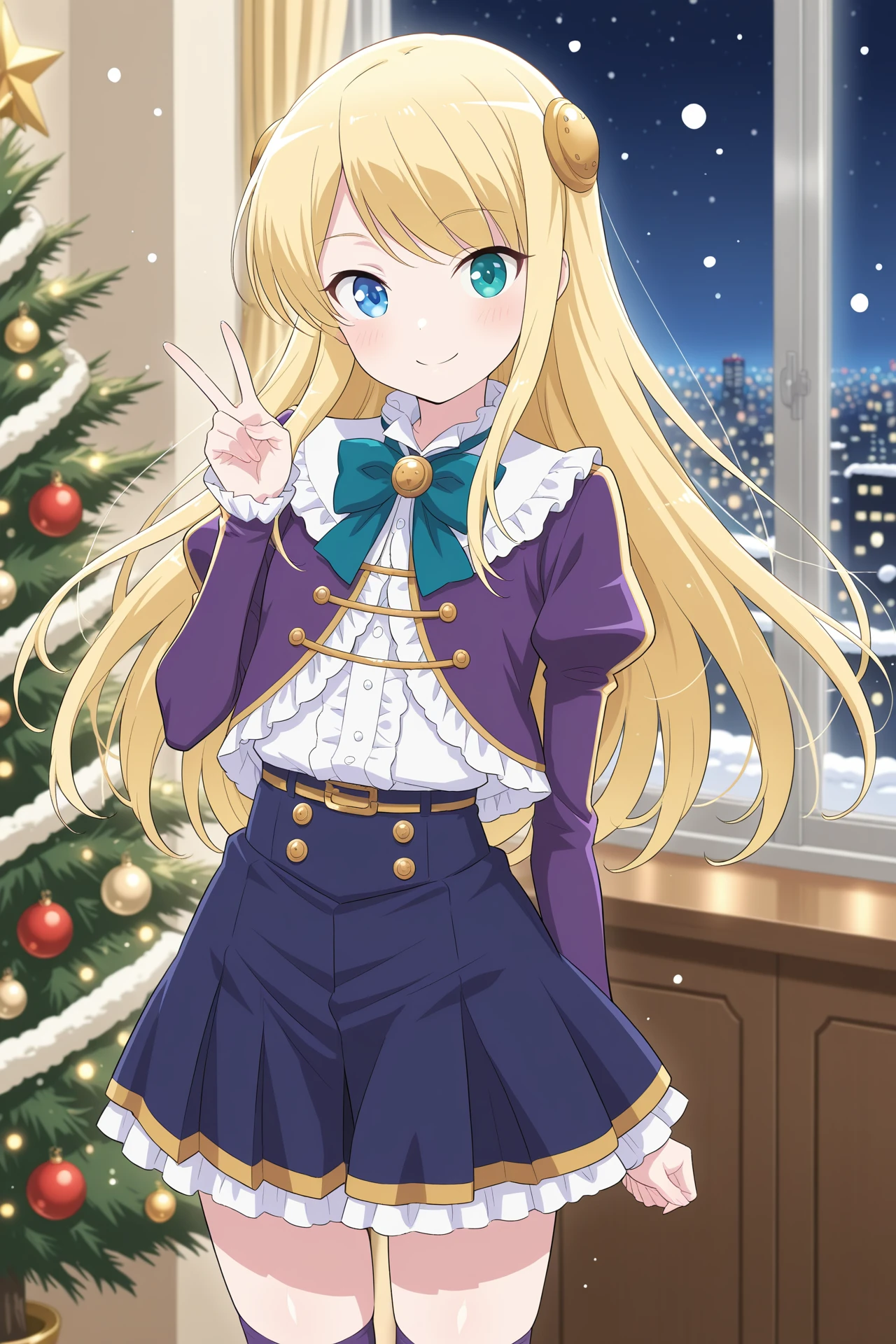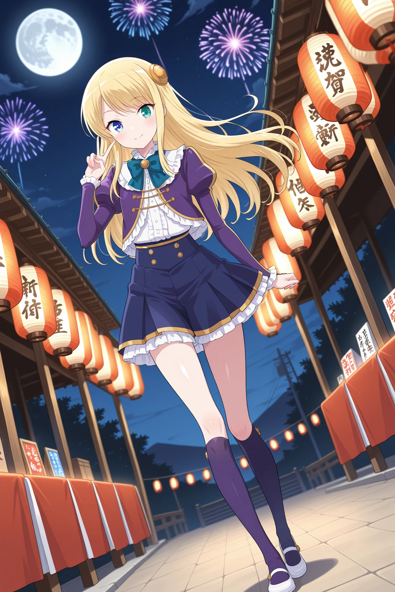 purple dress, purple jacket, long sleeves, puffy sleeves, juliet sleeves, bowtie, white shirt, frills, blue skirt, pleated skirt, purple thighhighs, orver-kneehighs, white footwearDescription