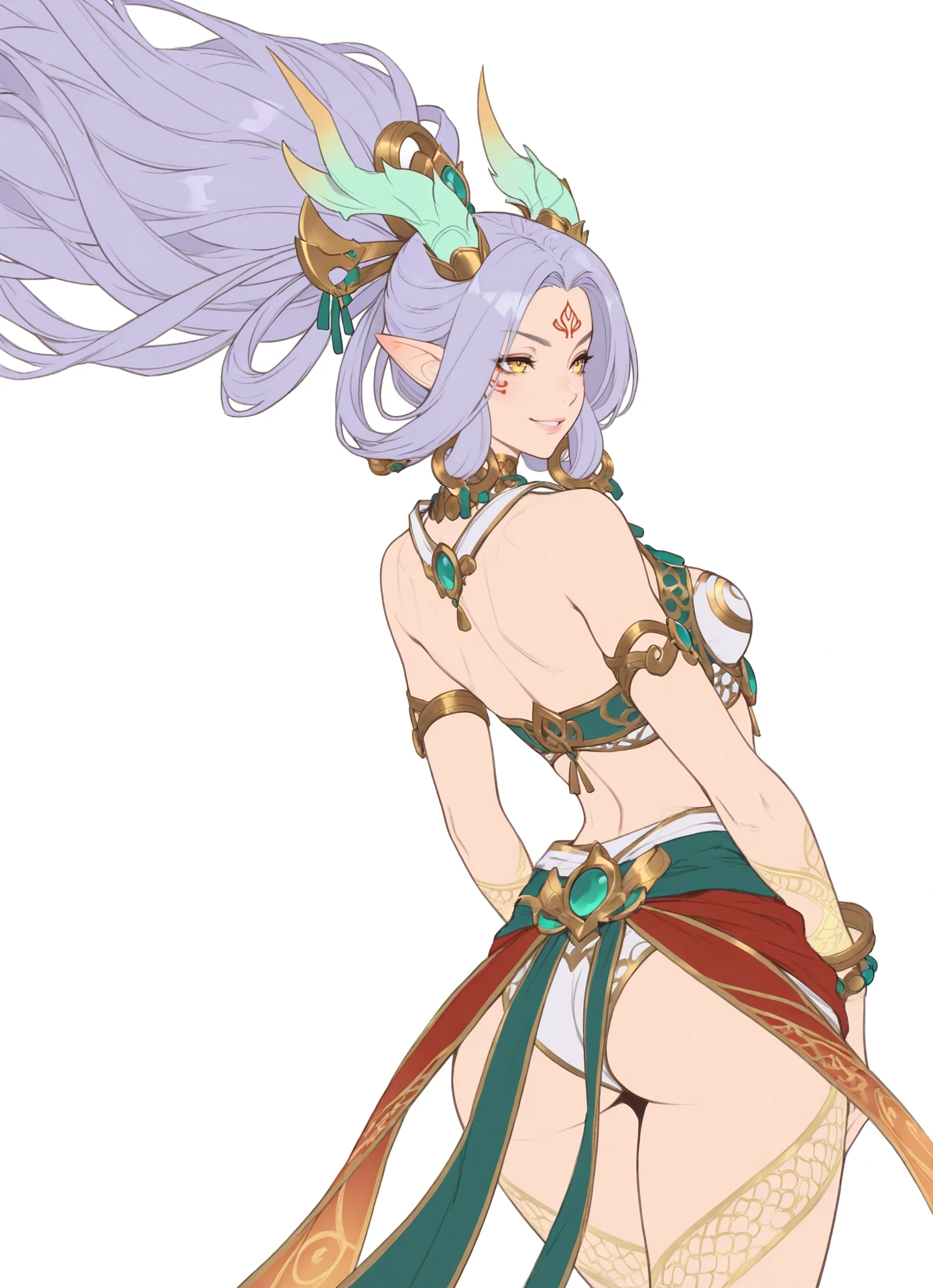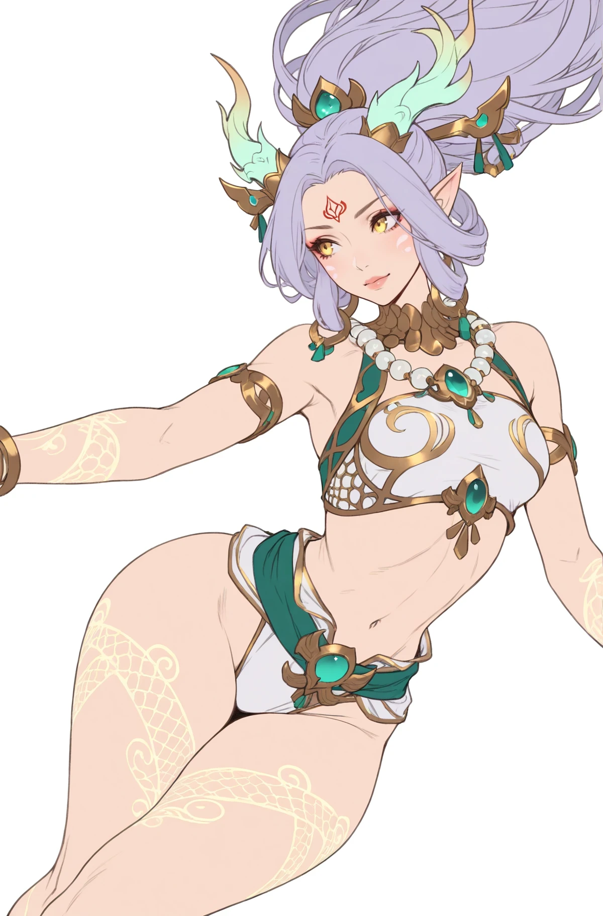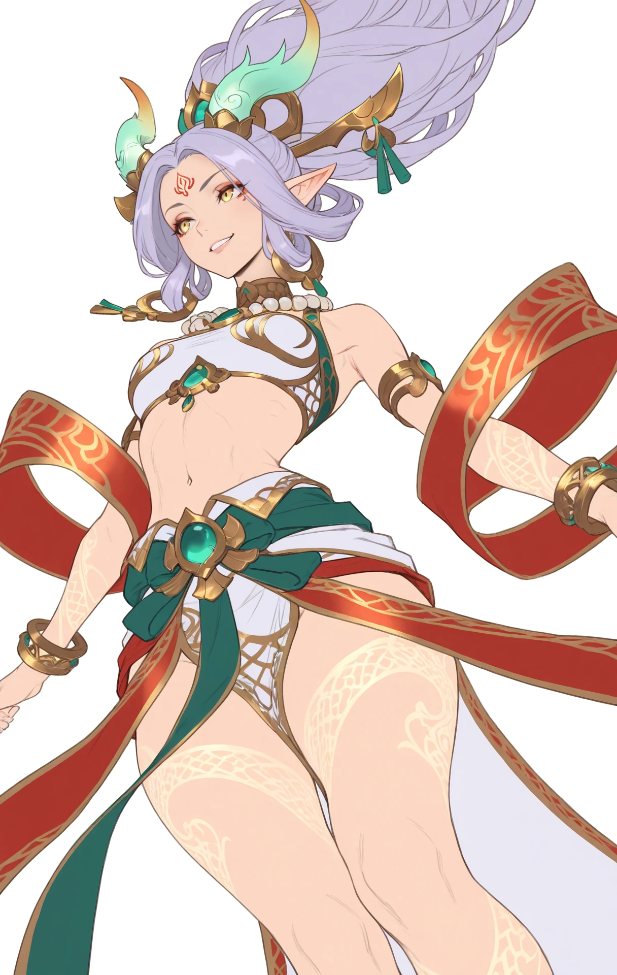 Heaven_Janna,slim body,yellow eyes,long lavender hair,flowing hair,wind-blown hair,pointed ears,curved horns,ornamental horns,forehead marking,ornate bra top,white and gold top,shoulder ornaments,patterned thigh-high stockings,green sash,gold silk ribbon,(golden ribbon skirt:1.4),