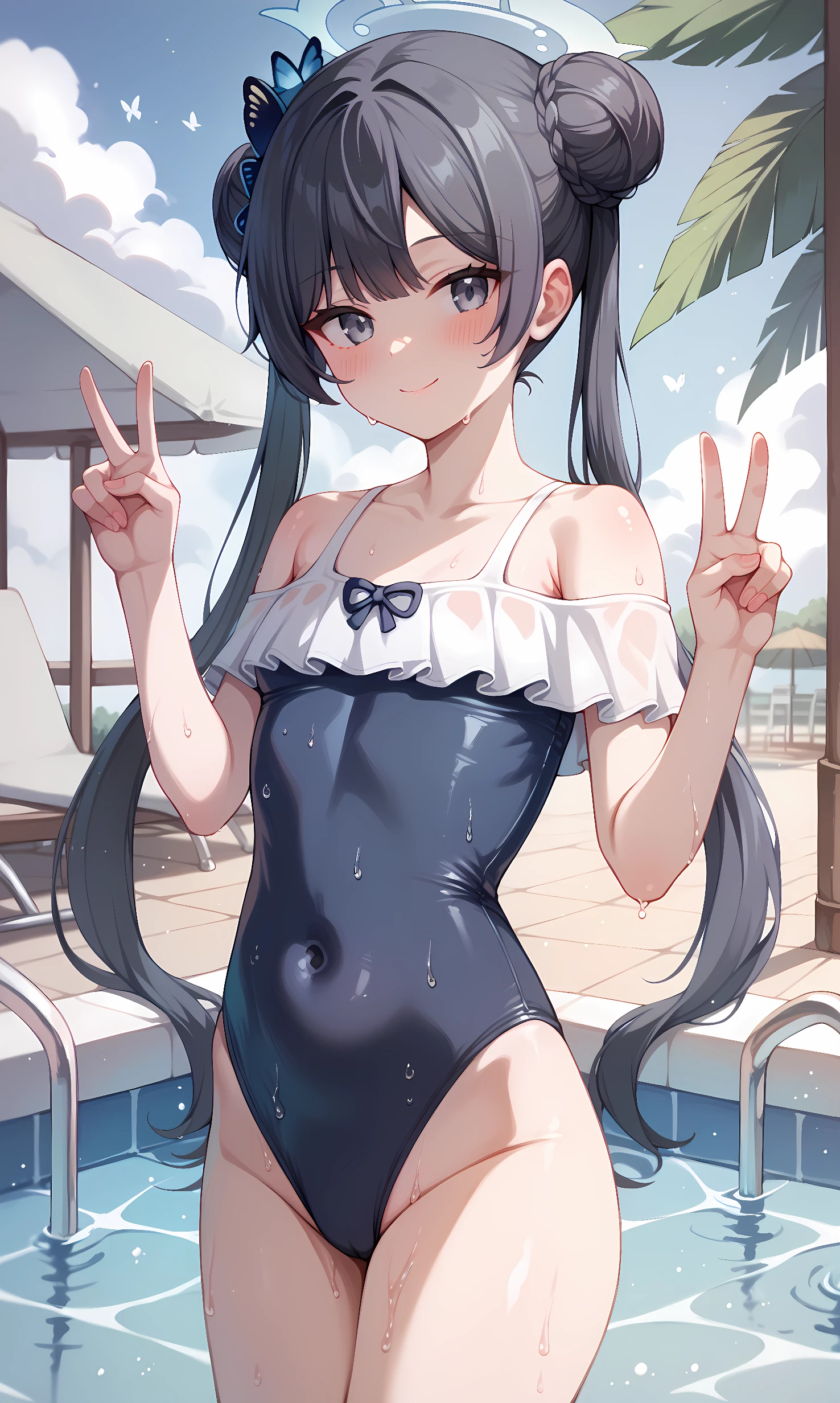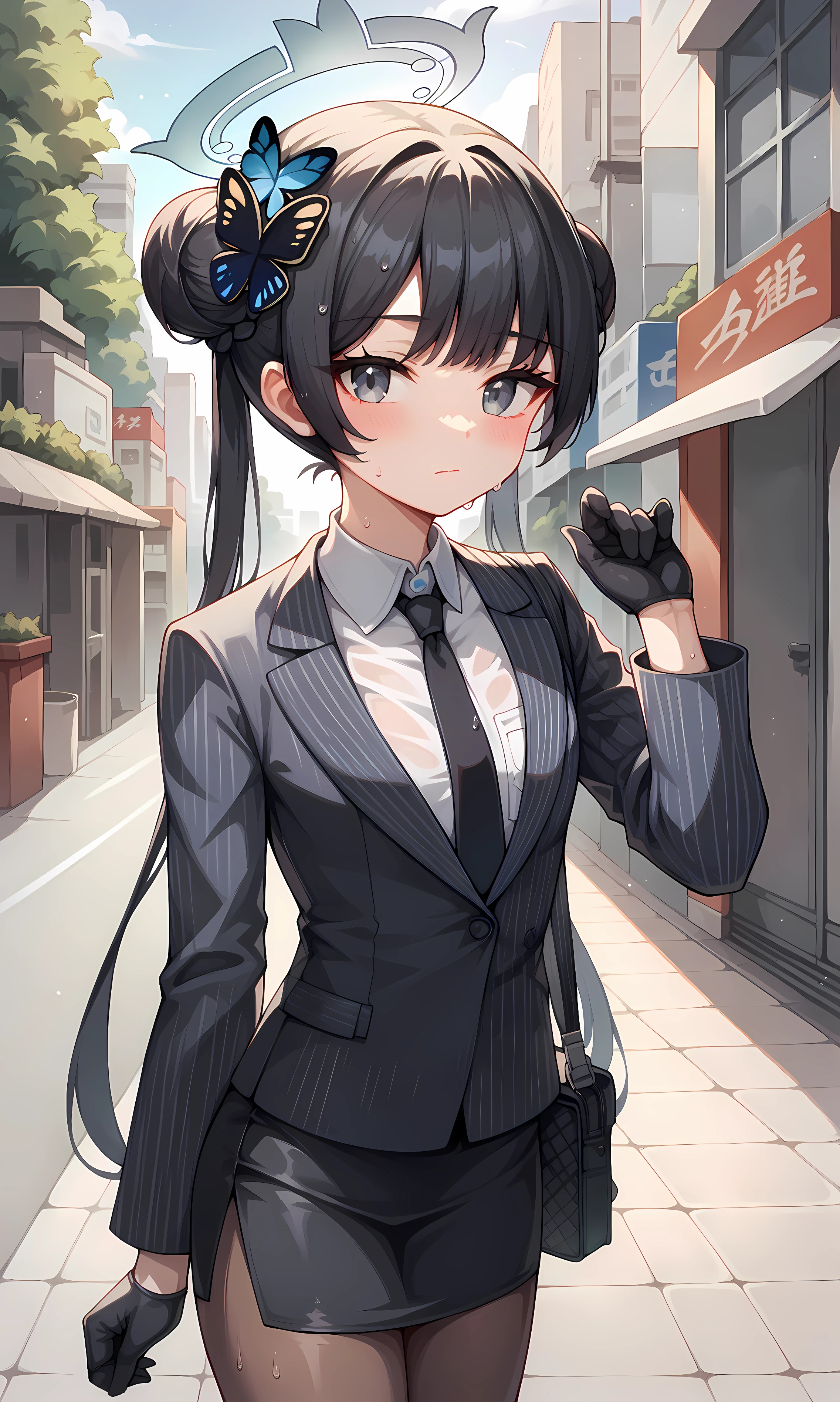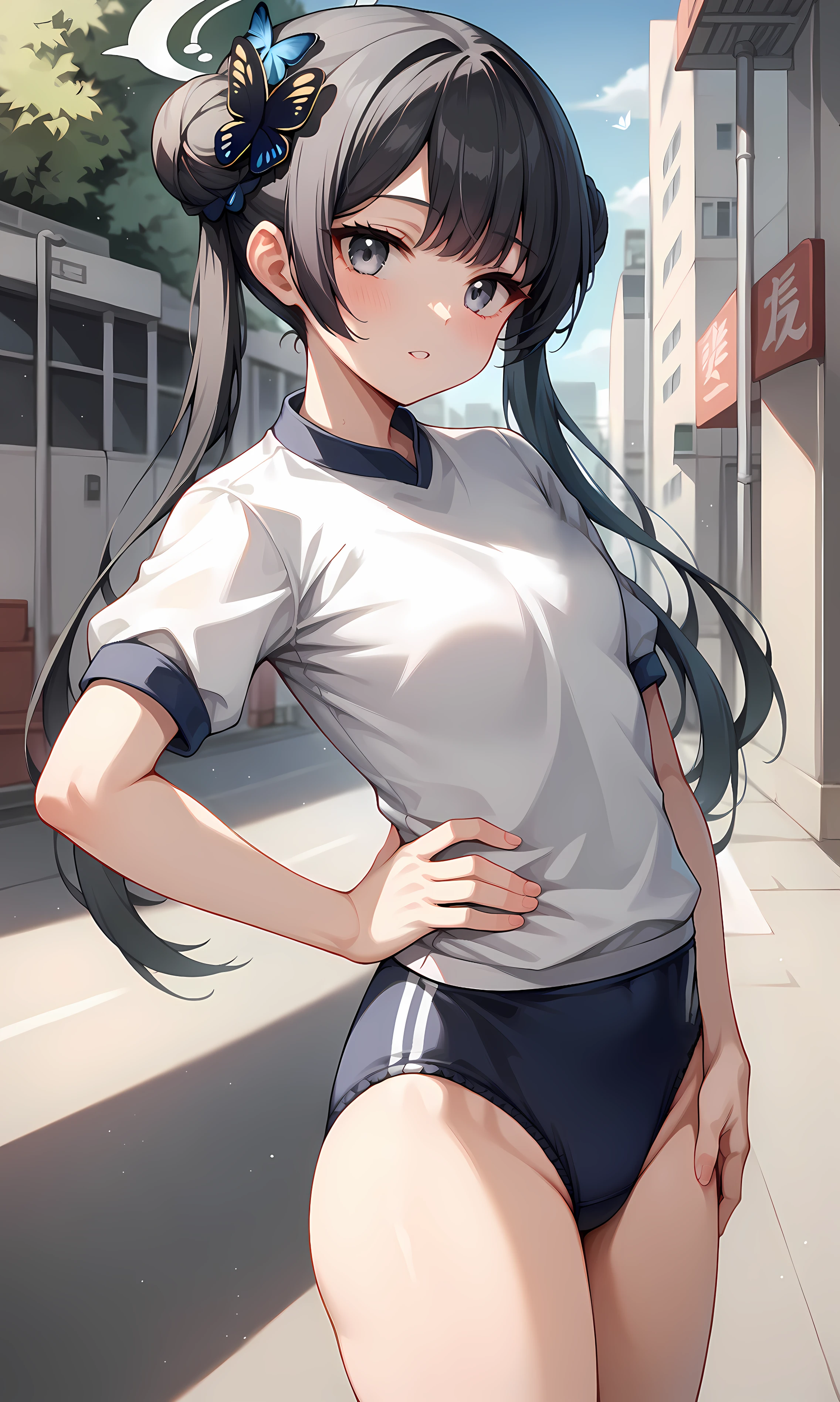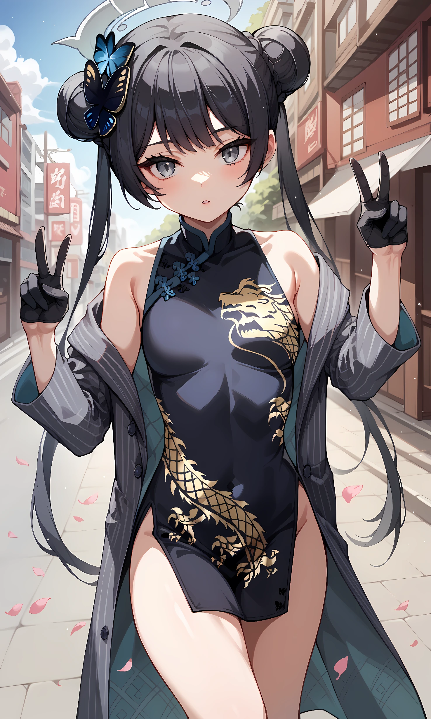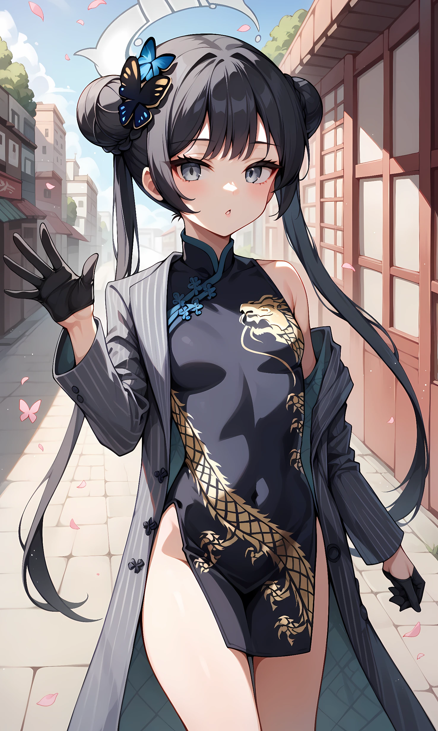 kisaki, grey eyes, black hair, hair bun, double bun, twintails, butterfly hair ornament, halo