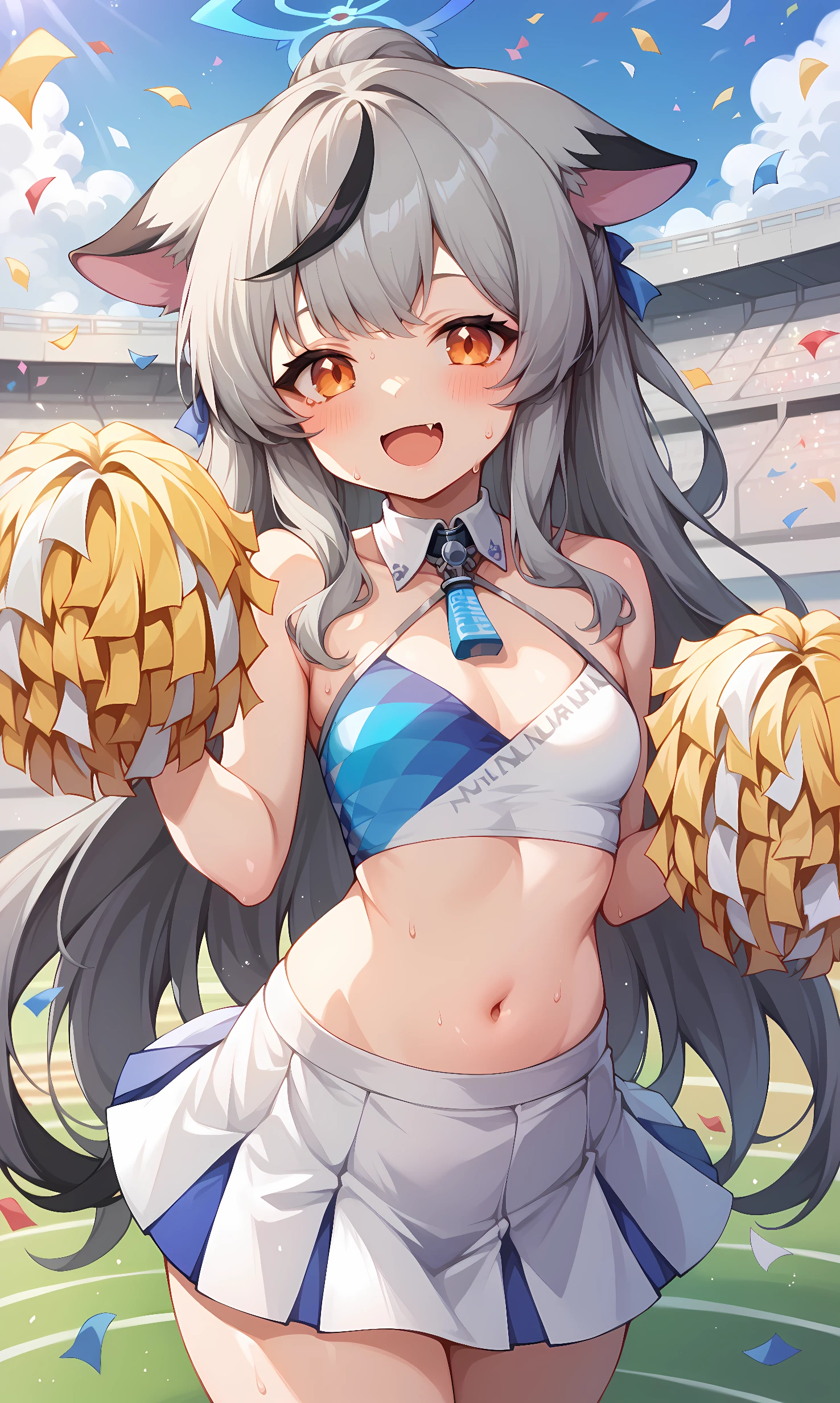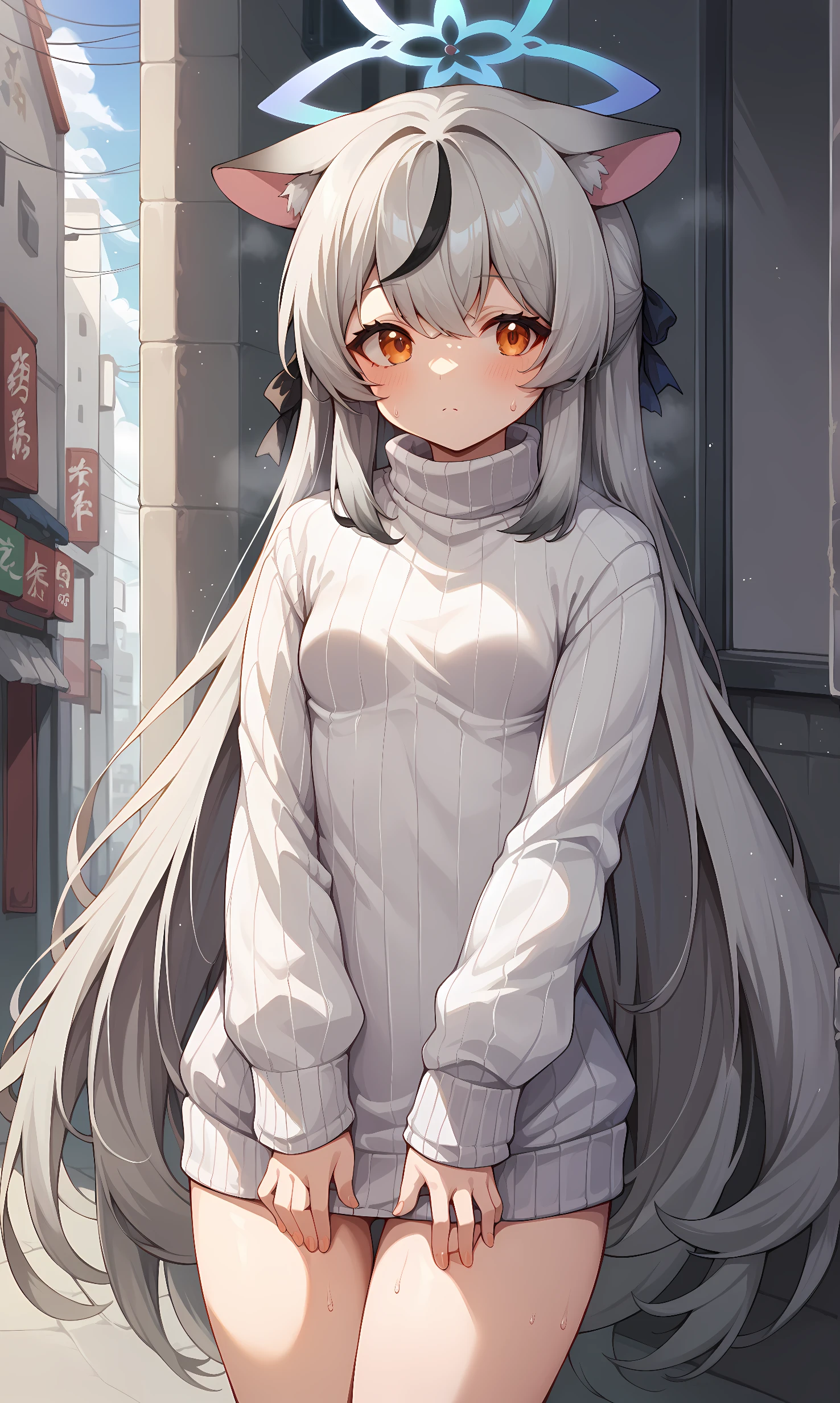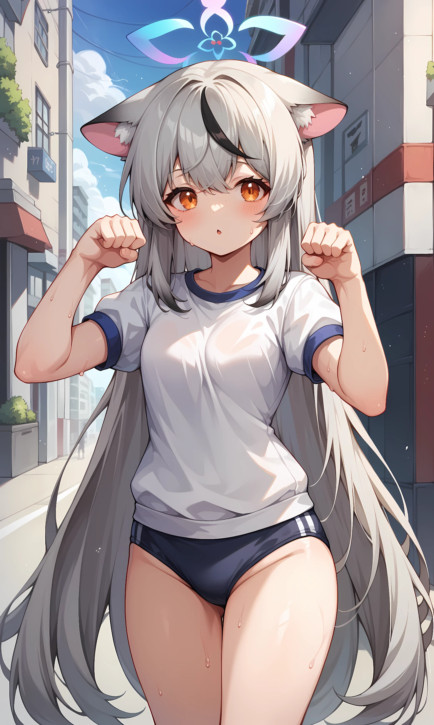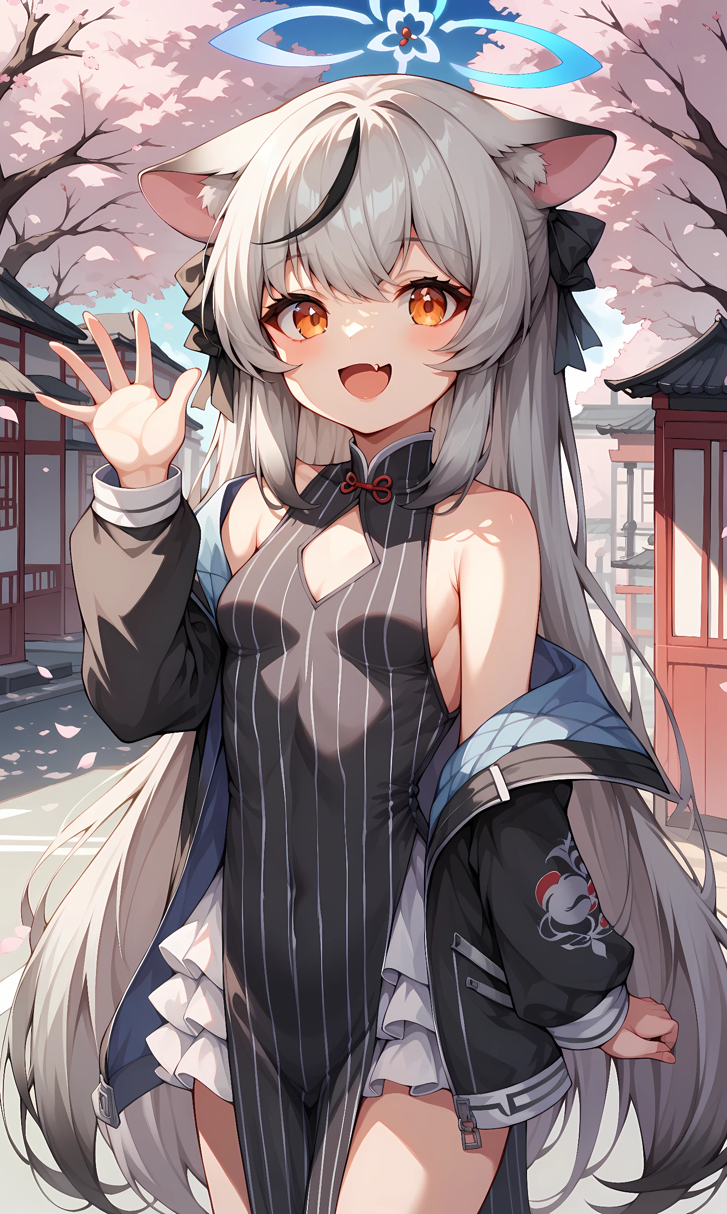 appearance: kokona, orange eyes, grey hair, very long hair, streaked hair, animal ears, halo