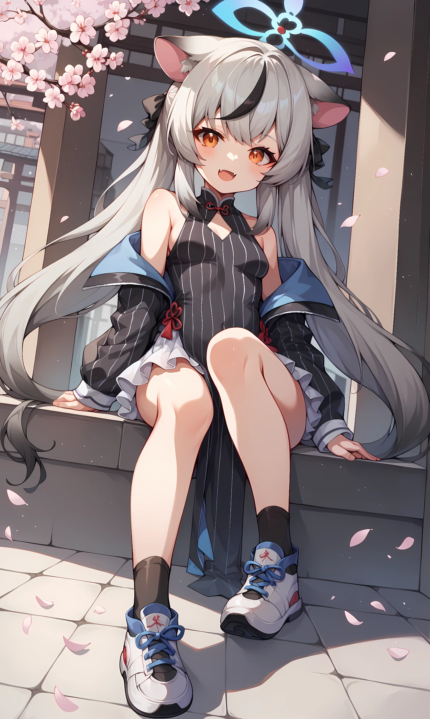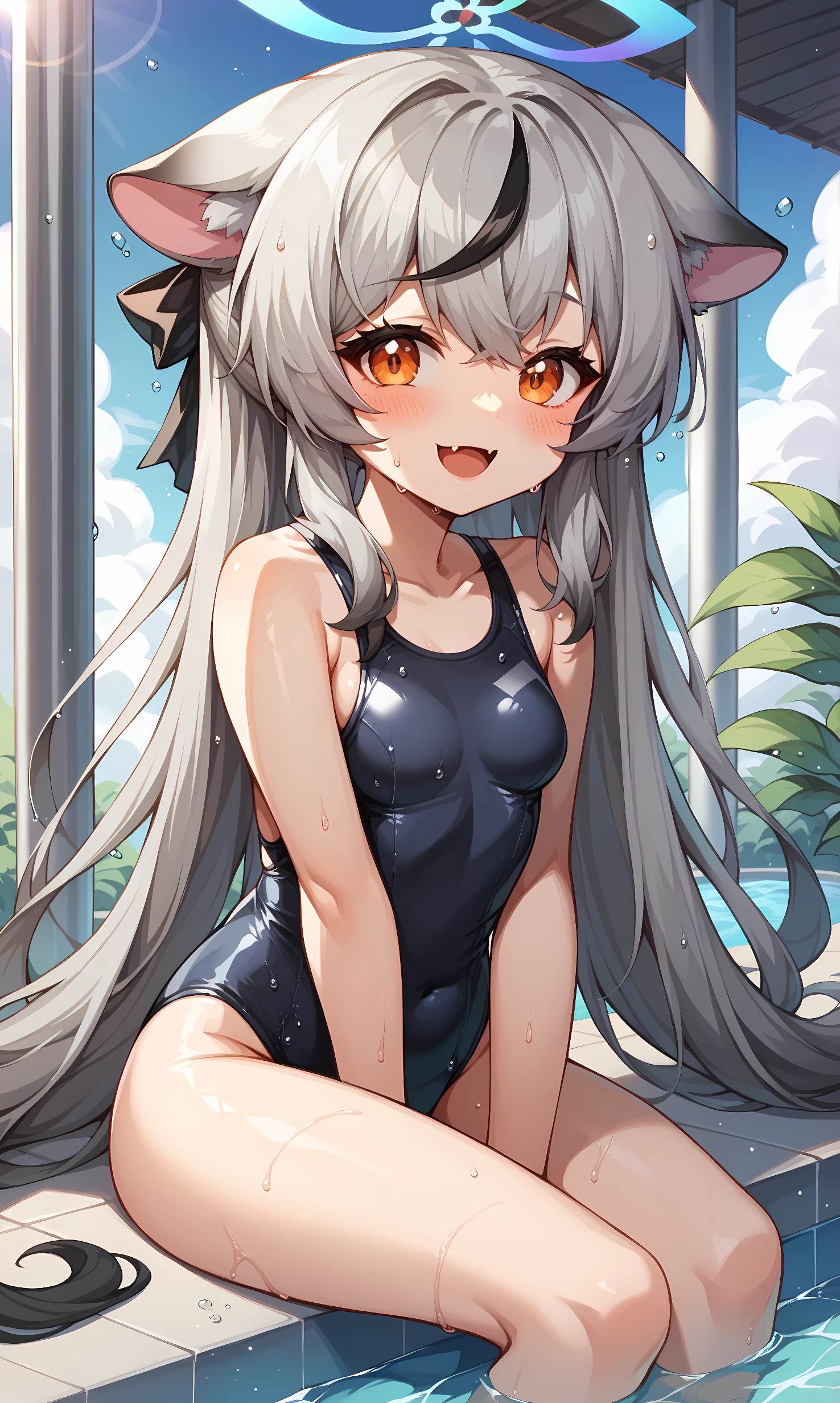 kokona, orange eyes, grey hair, very long hair, streaked hair, animal ears, halo