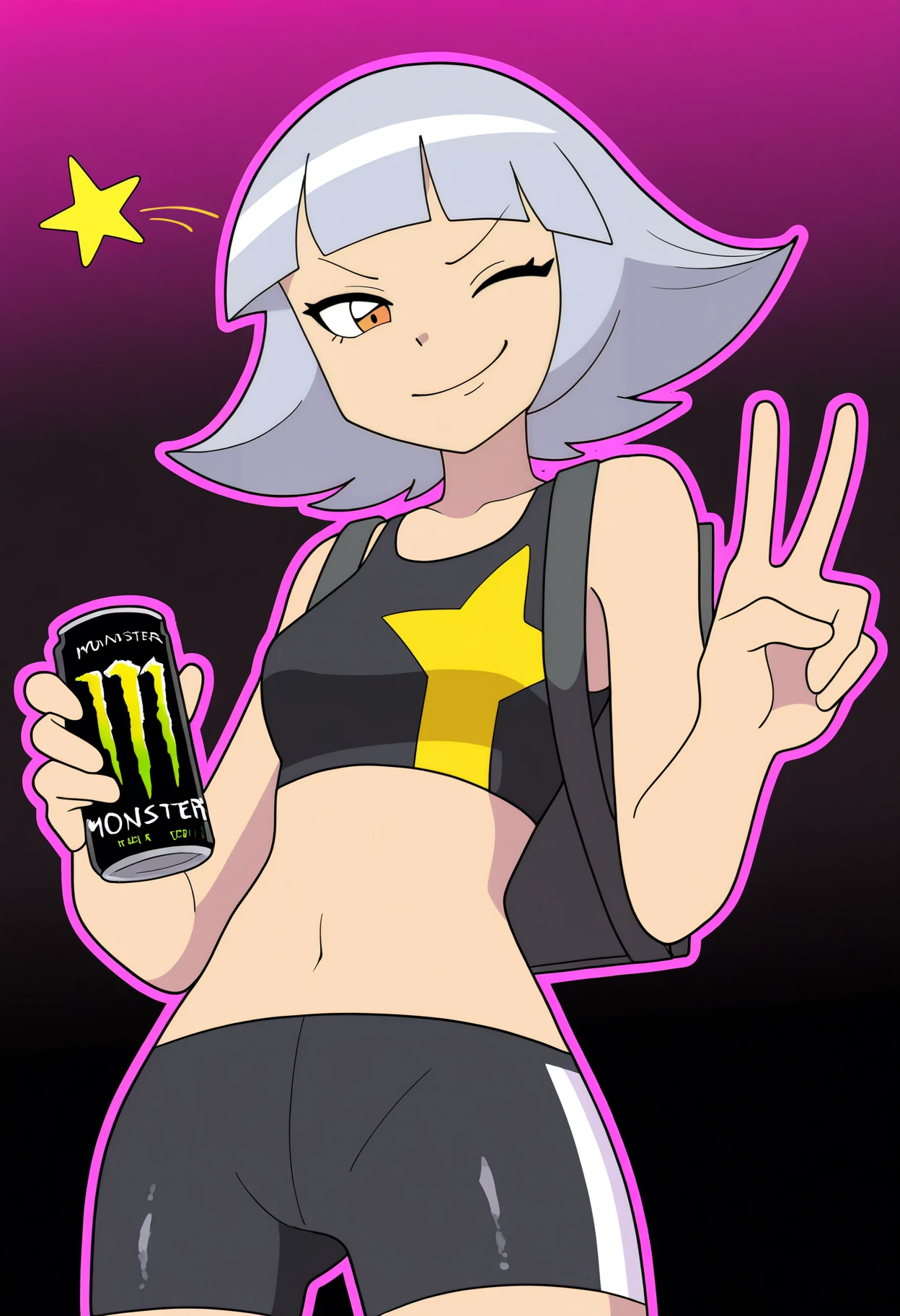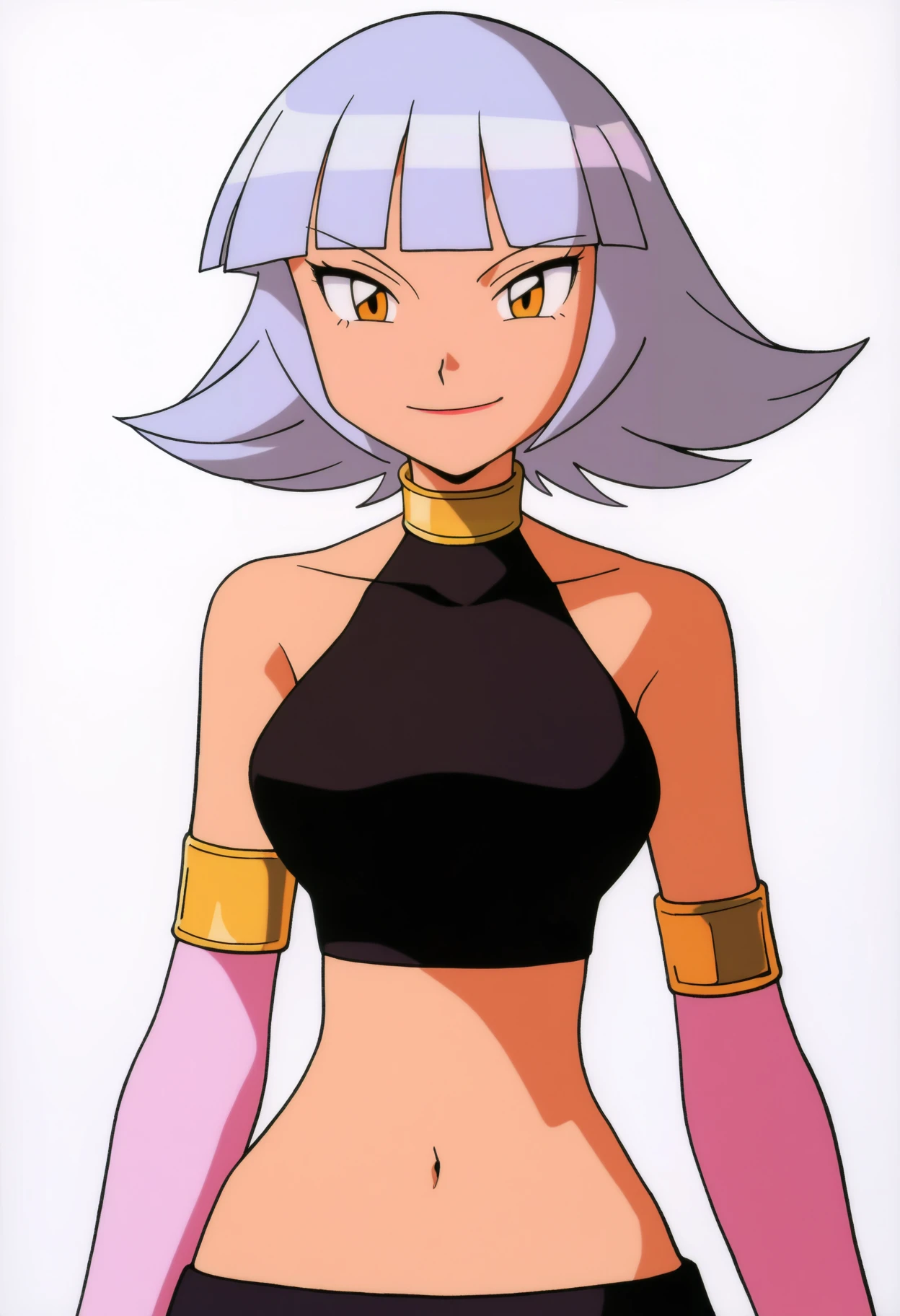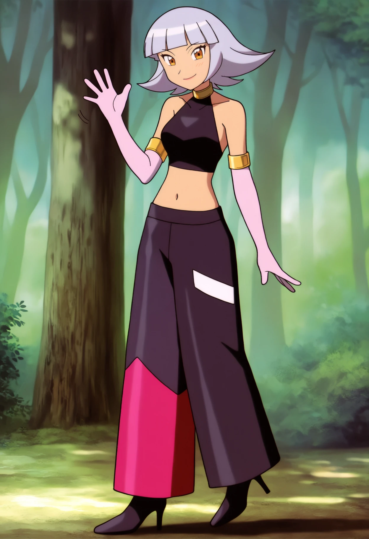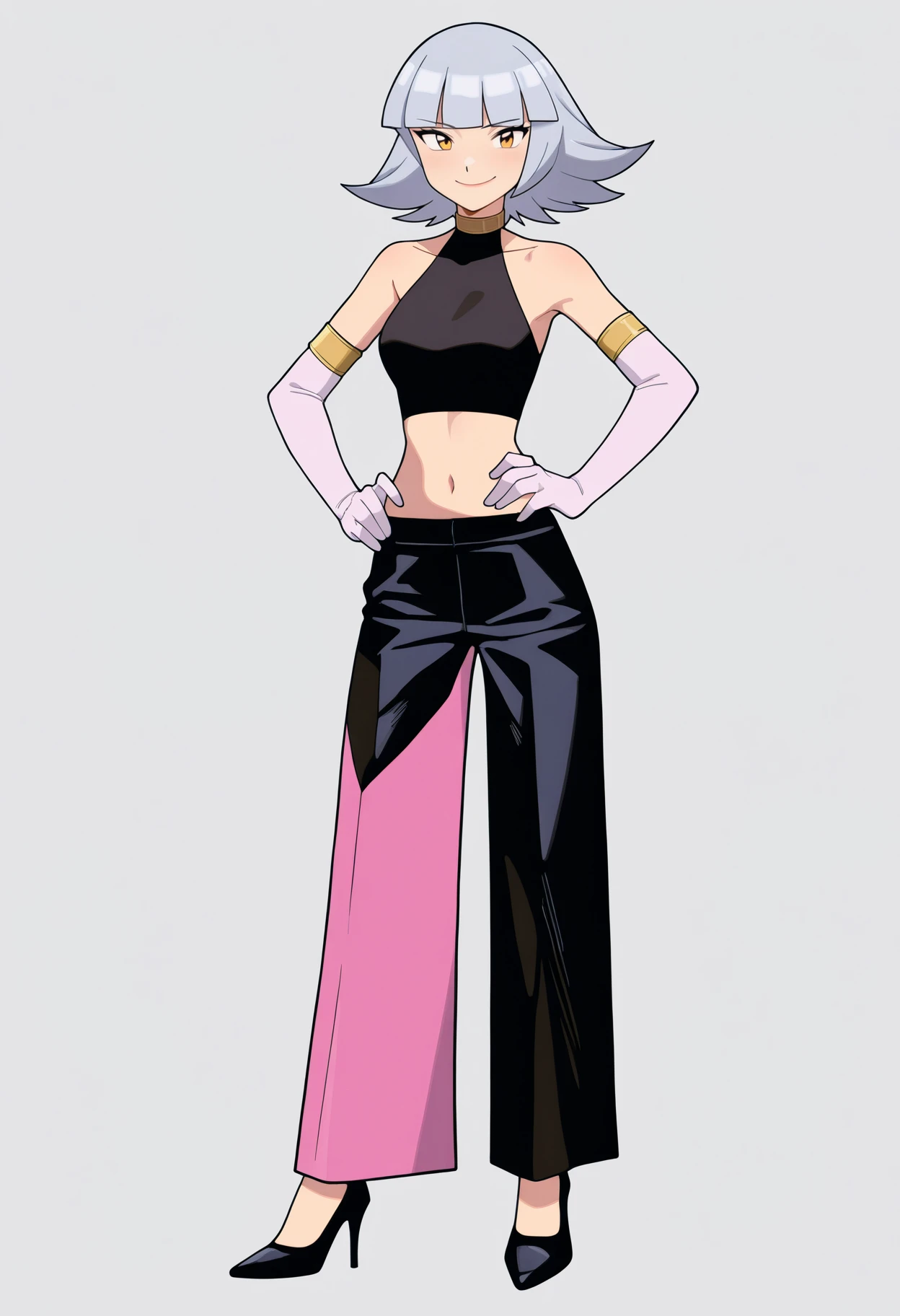Basic outfit prompts : crop top, navel, midriff, pink elbow gloves, collarbone, black high heels, bare shoulders, black pants, sleeveless