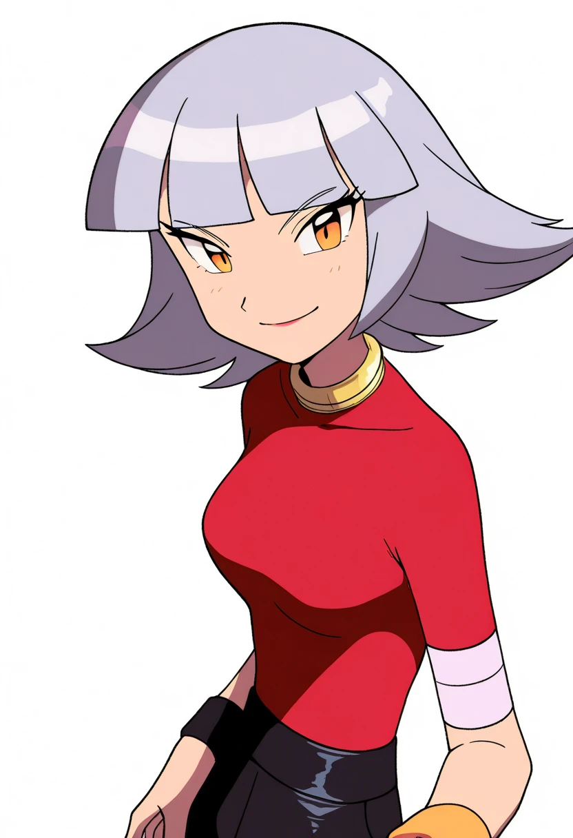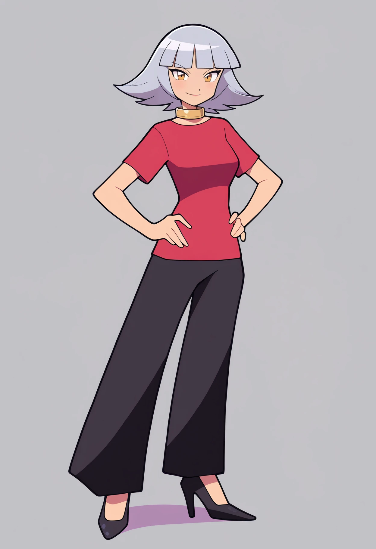 Red shirt outfit prompts : red shirt, short sleeves, black pants, neck ring, black high heels