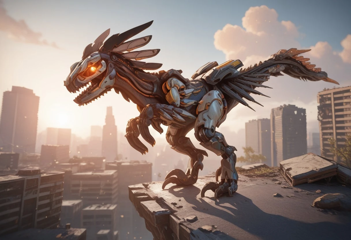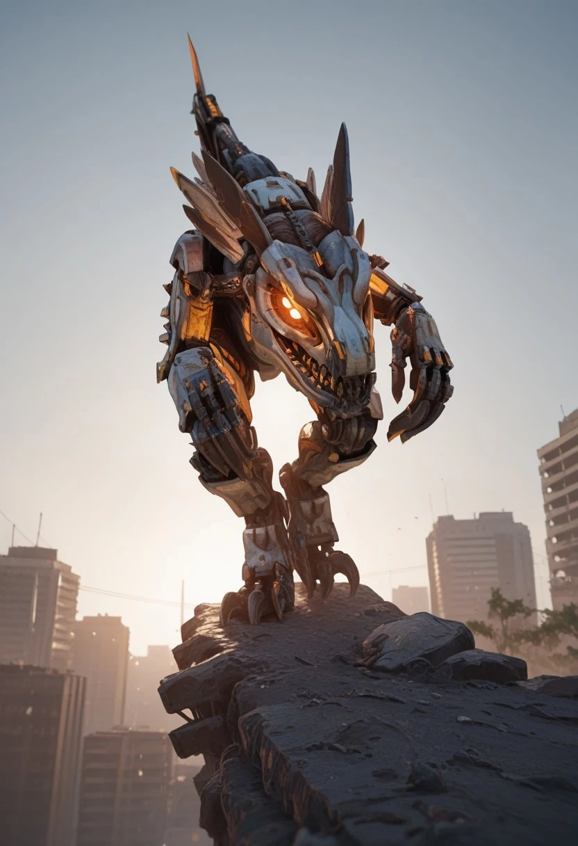 clawstrider, robot dinosaur, glowing eyes, claws, spikes on head, spikes on tail, leg raptor