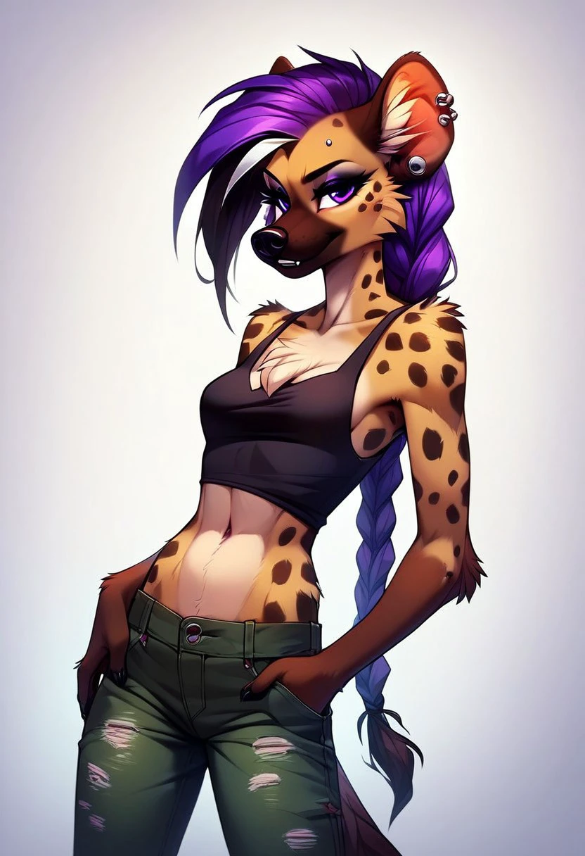 She's an anthro spotted hyena (no pseudo-P yet) with purple hair and some piercings.