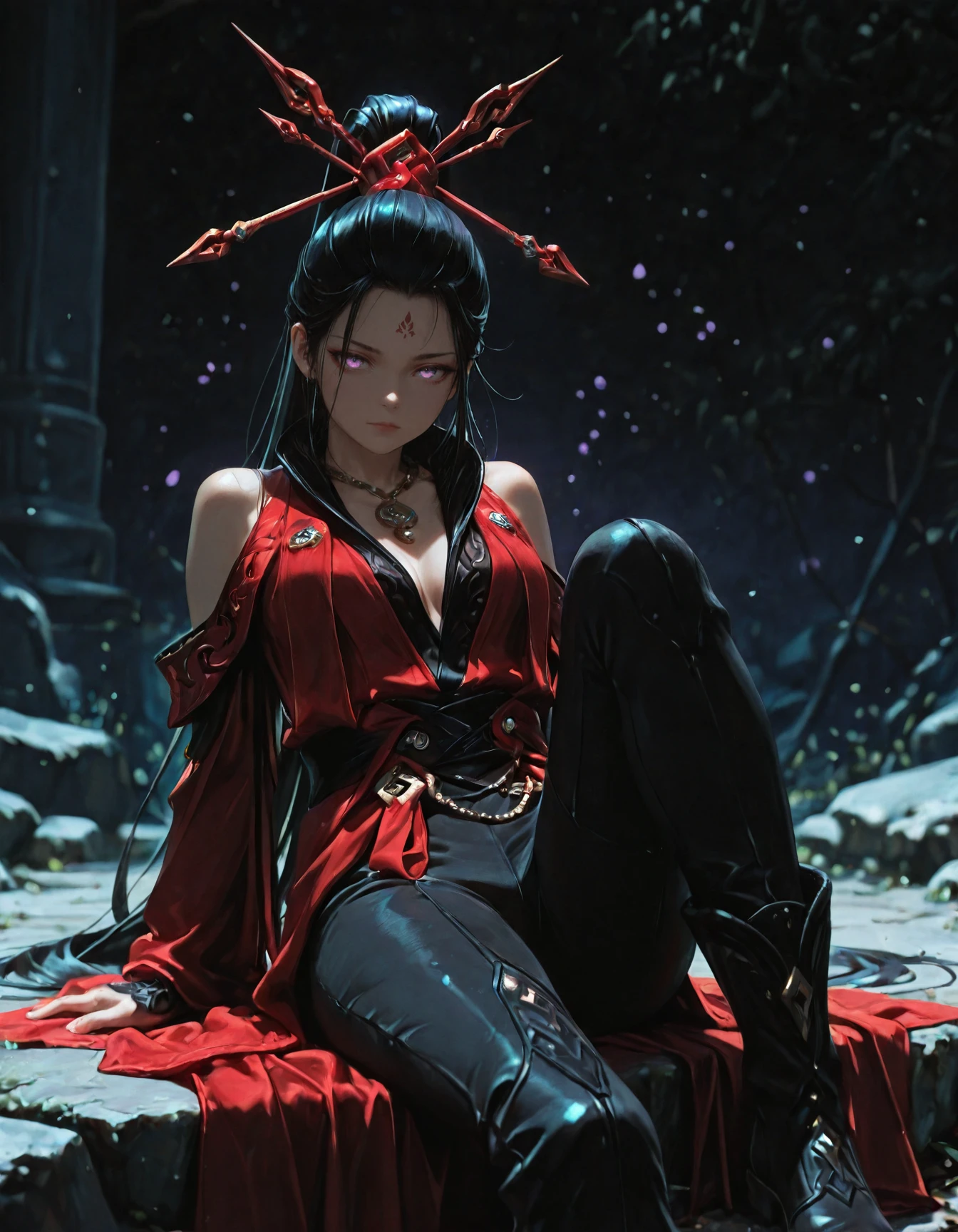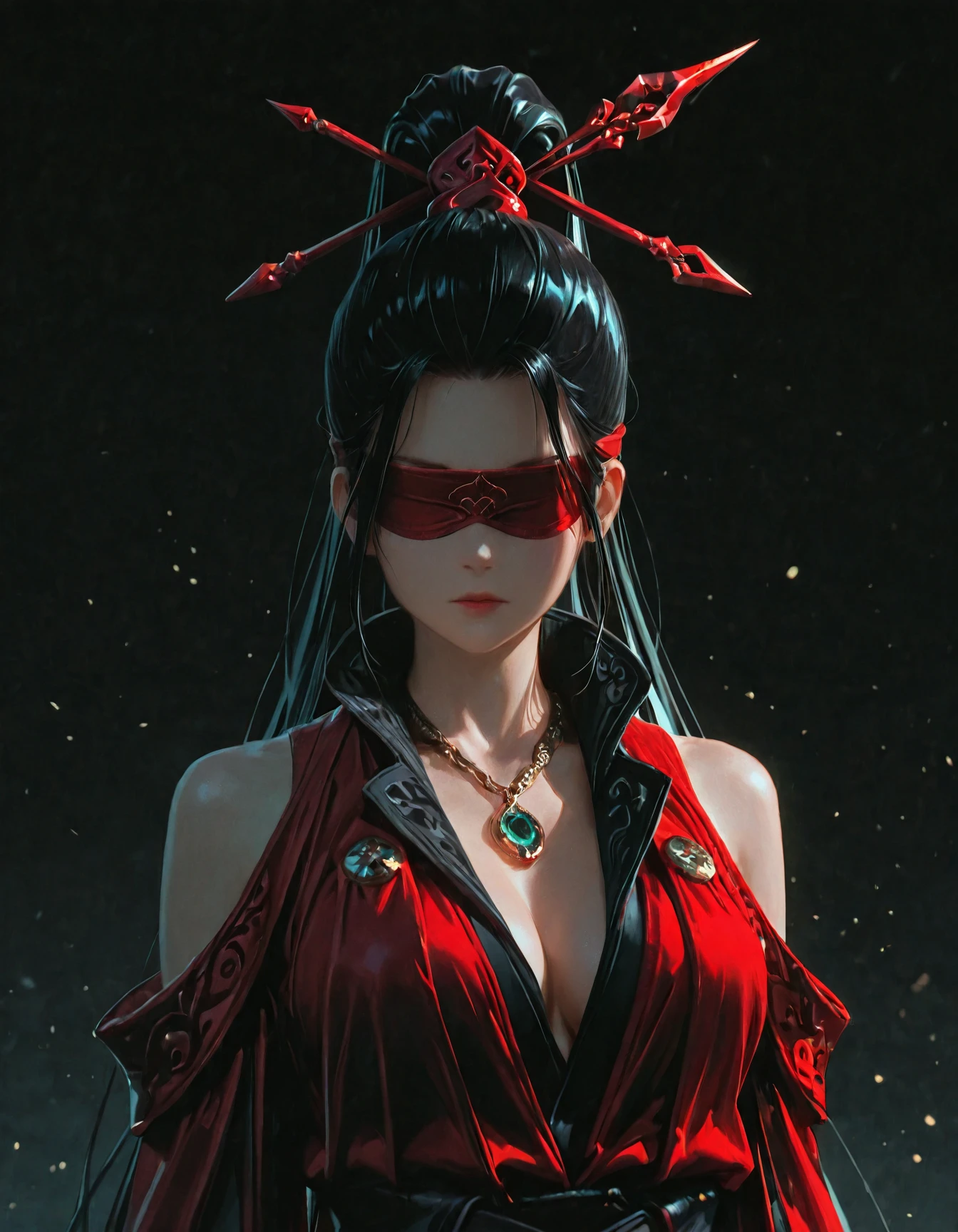 vip3r_ning, 1girl, black hair, very long hair, high ponytail, blindfold, red robe, bare shoulders, hair ornament, necklace, boots