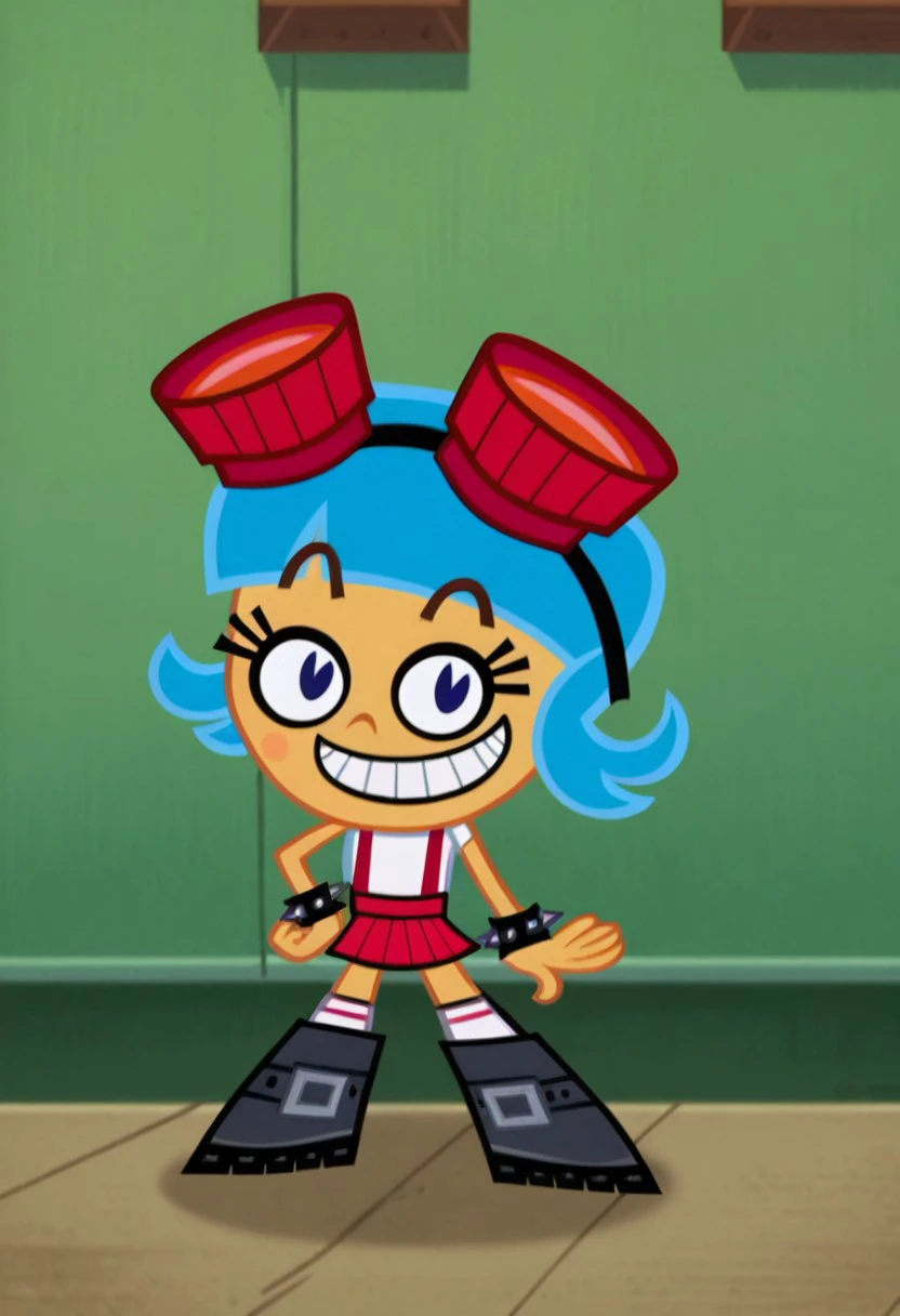 frida suarez, blue hair, goggles on head, white shirt, suspenders, red skirt, spiked bracelet