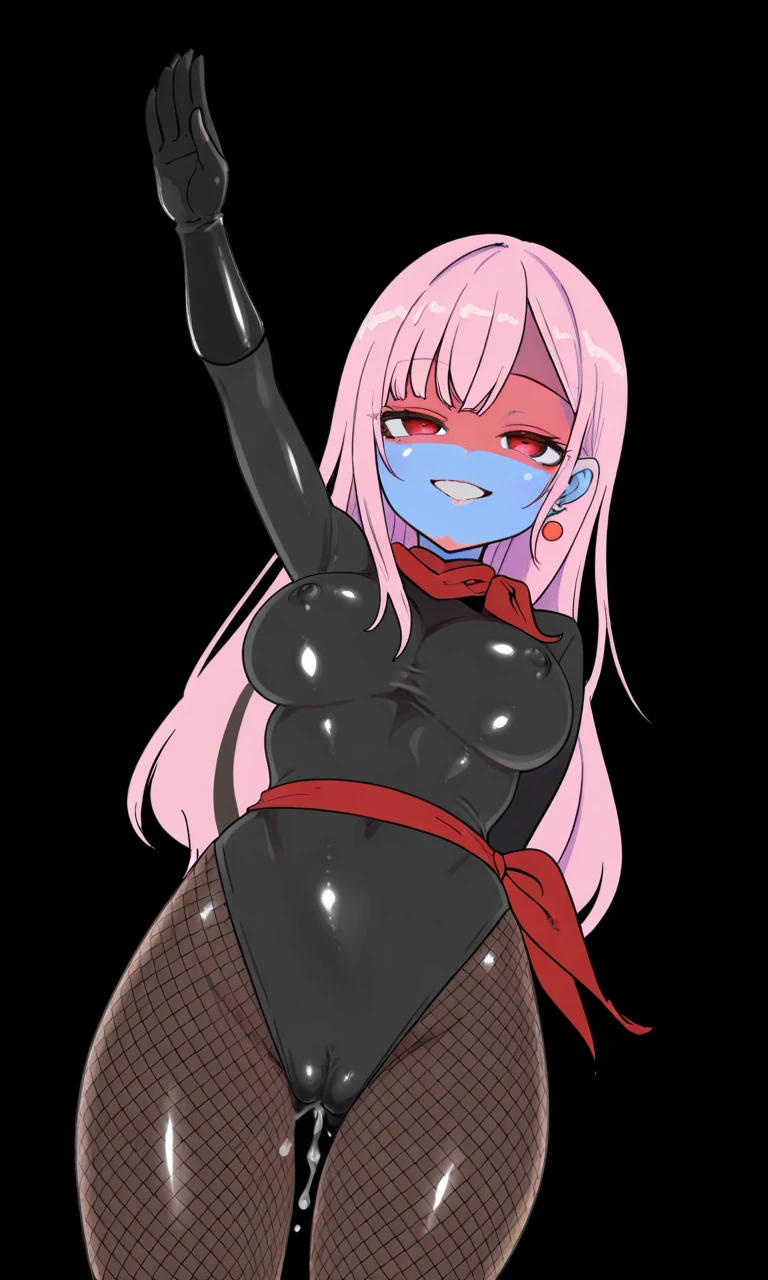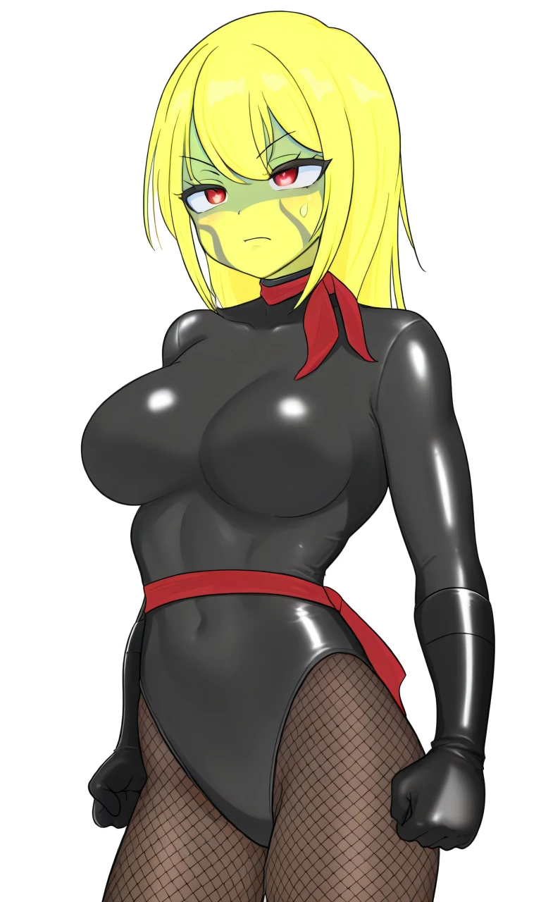 shocker, colored skin, black leotard, latex elbow gloves, brown fishnet pantyhose