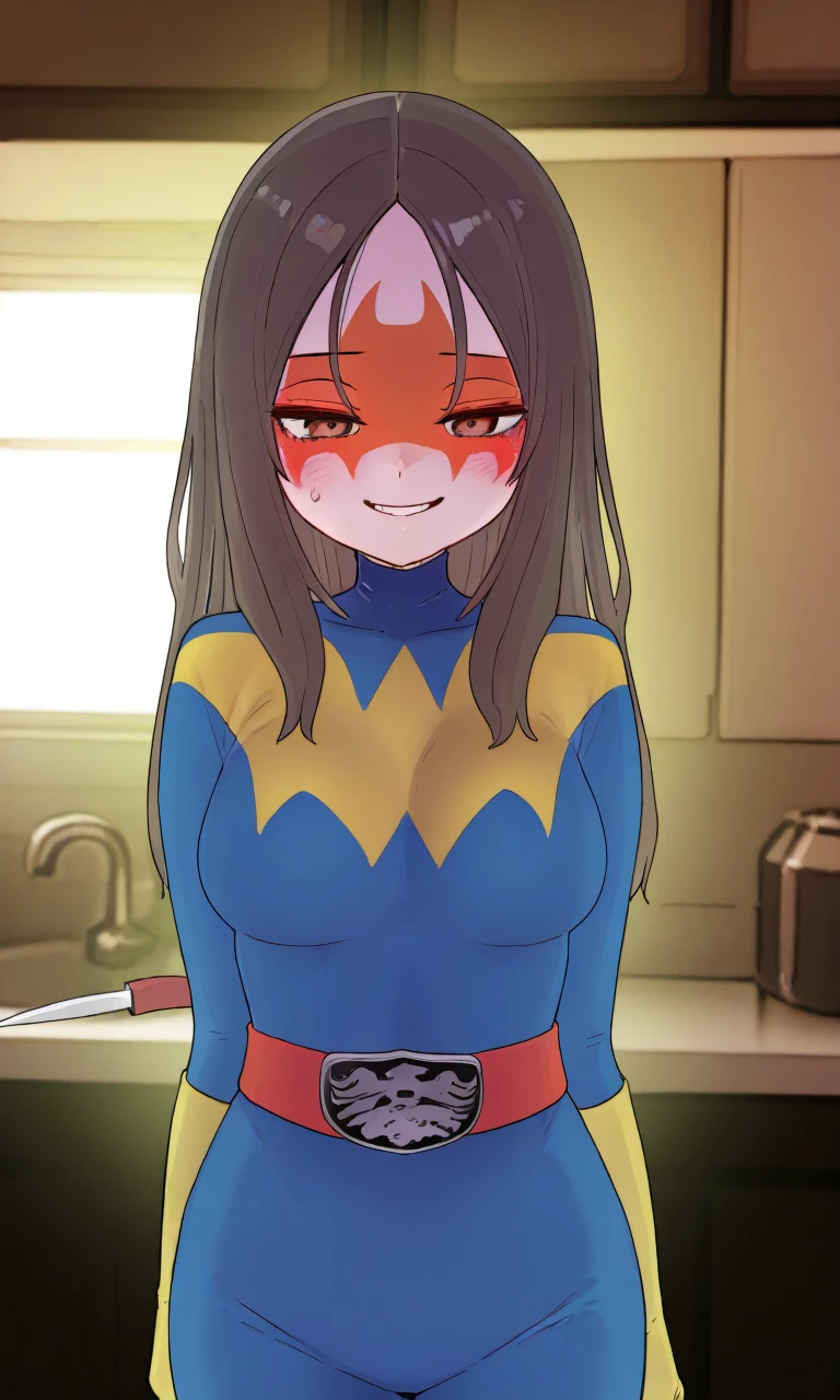 red shocker, colored skin, shocker belt, latex elbow gloves, red shocker bodysuit