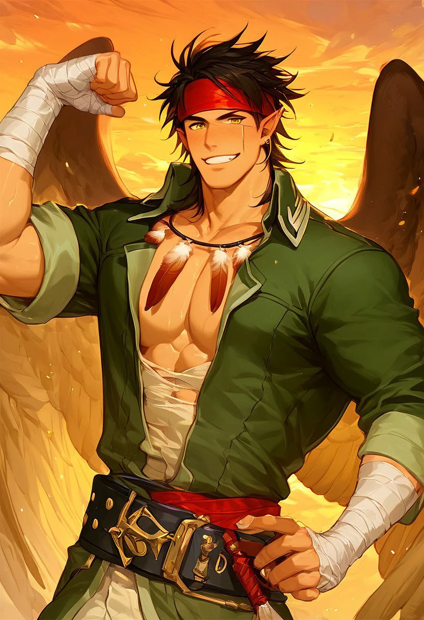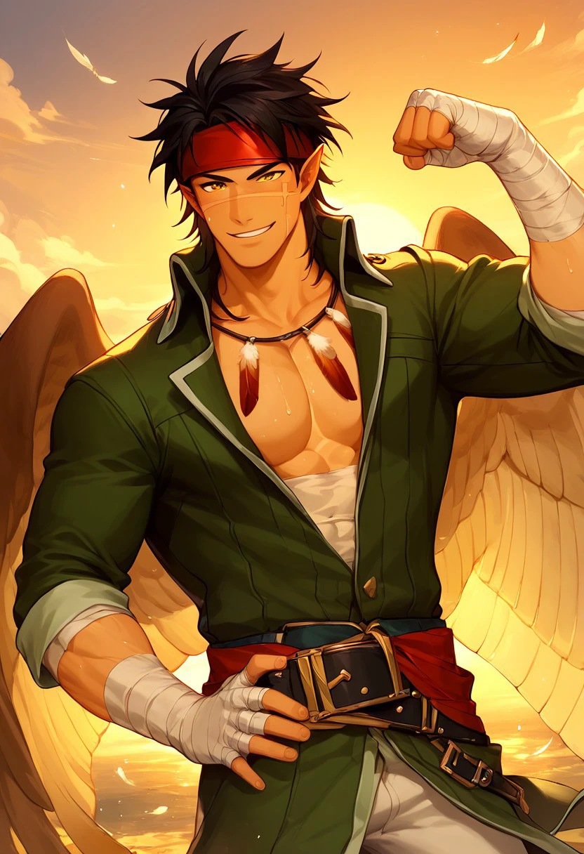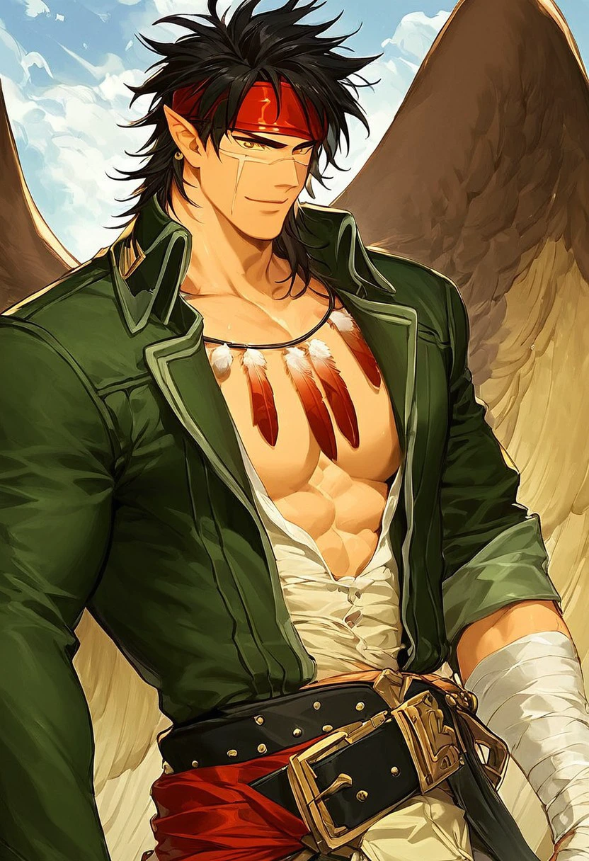 normal outfit: TibarnFE, black hair, yellow eyes, pointy ears, scar on face, black hair, red headband, feathered wings, green jacket, open jacket, belt, white pants, boots, feather necklace, bandages