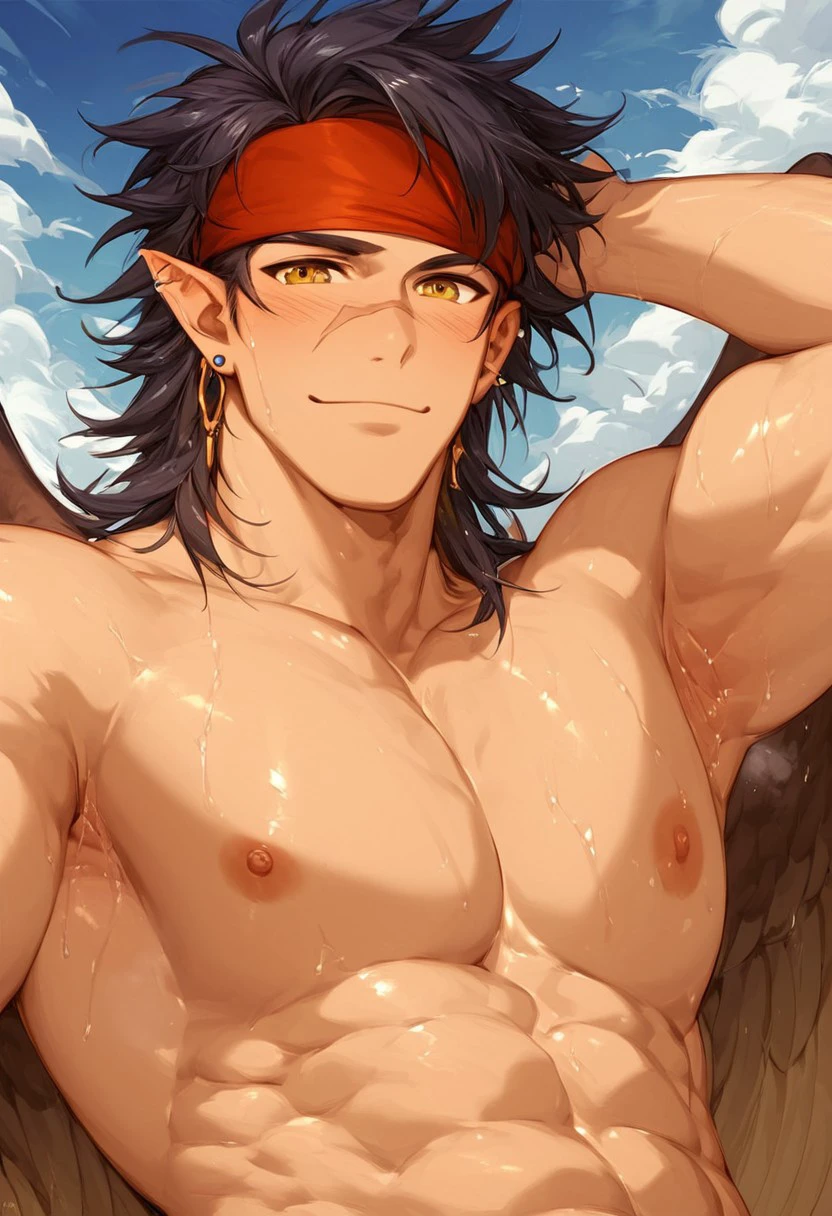 TibarnFE, black hair, yellow eyes, pointy ears, scar on face, black hair, red headband, earrings, feathered wings