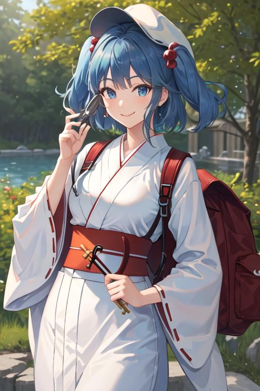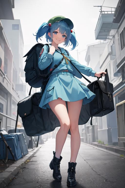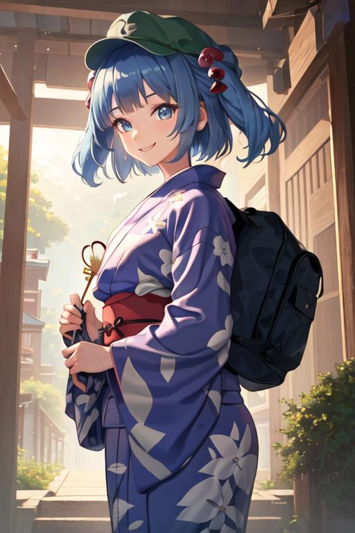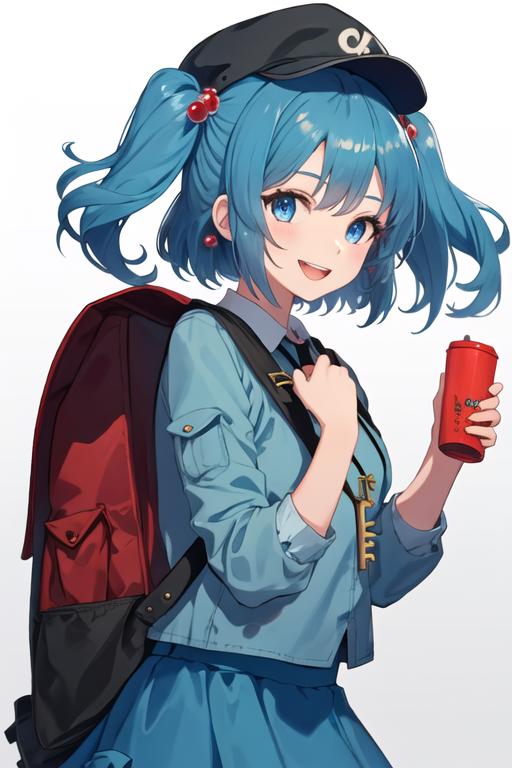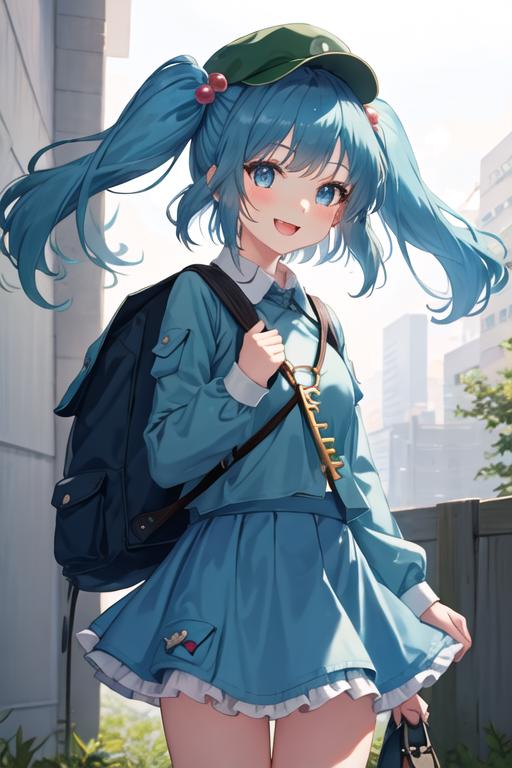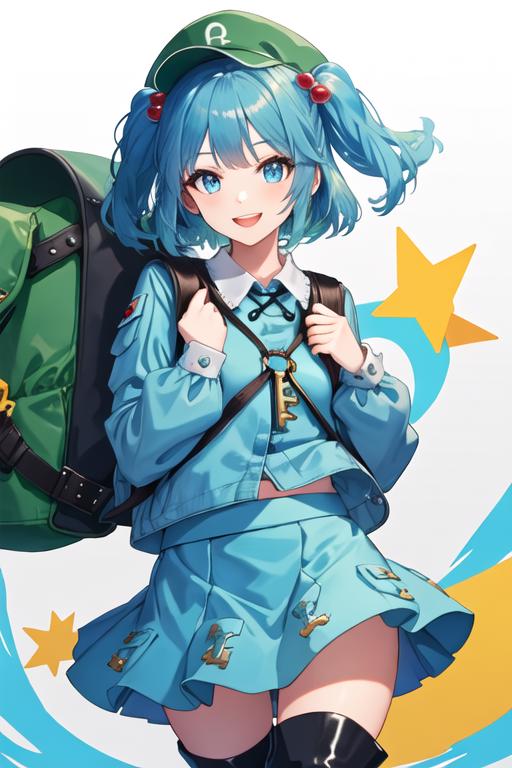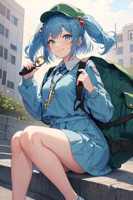 The trigger word is kawashiro_nitori_touhou, and the recommended tags are best quality, masterpiece, highres, solo, {kawashiro_nitori_touhou:1.15}, blue_hair, hair_ornament, hair_bobbles, two_side_up, blue_eyes, hat, short_hair, key, smile, bag, backpack.