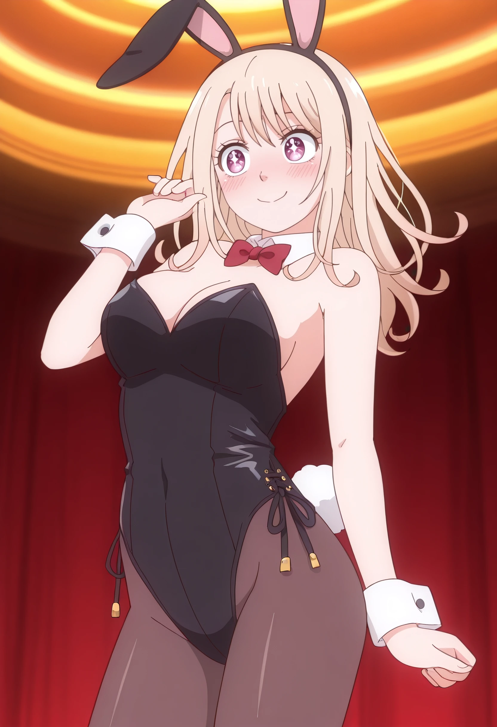 MonaBunny, playboy bunny, detached collar, leotard, strapless leotard, strapless, black leotard, wrist cuffs, rabbit ears, rabbit tail, animal ears, fake animal ears, pantyhose, tail, bow, bowtie, red bow, red bowtie, fake tail, cleavage, bare shoulders, backless leotard, black pantyhose, hairband, side-tie leotard, curly hair, flipped hair,