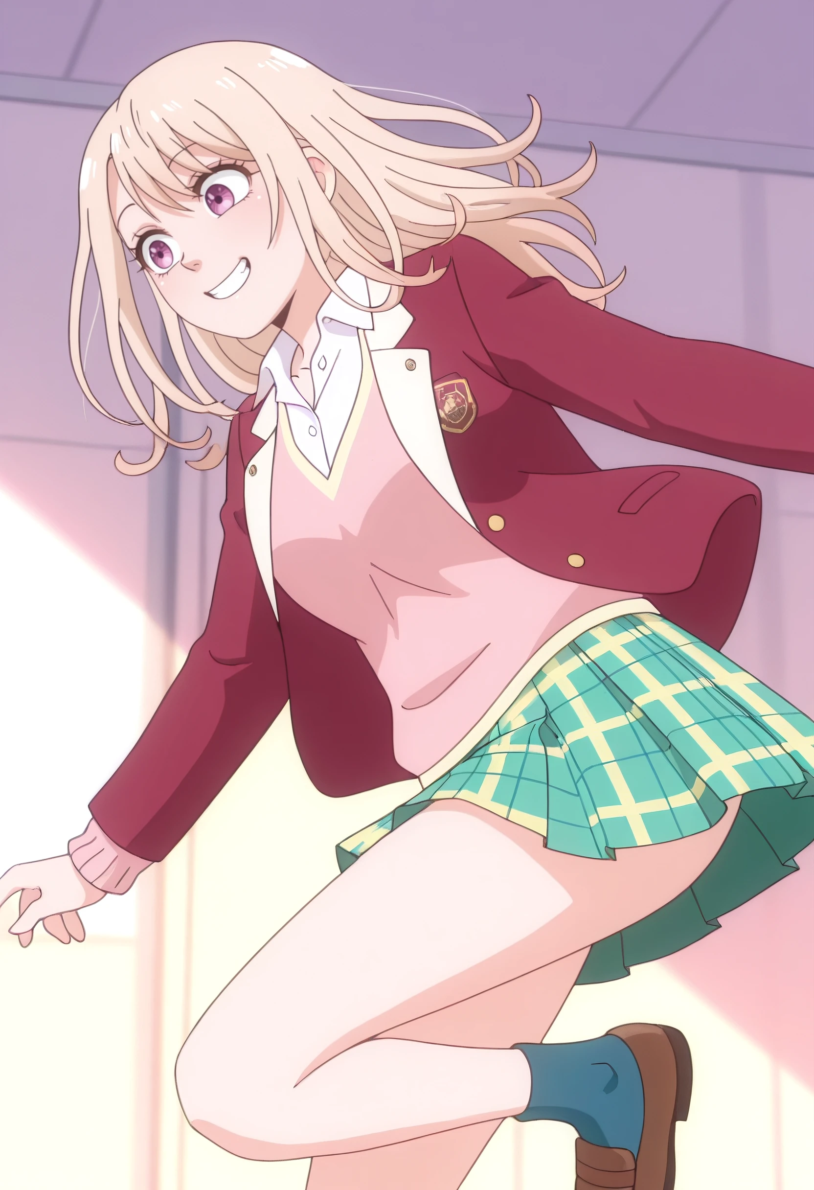 MonaSchoolC, school uniform, shirt, jacket, white shirt, collared shirt, blazer, cardigan, red jacket, long sleeves, pink cardigan, sweater, dress shirt, open clothes, sweater vest, skirt, open jacket, plaid clothes, plaid skirt, pleated skirt, green skirt, pink sweater, pink sweater vest, vest, pink vest, miniskirt, open collar, socks, shoes, blue socks, brown footwear,