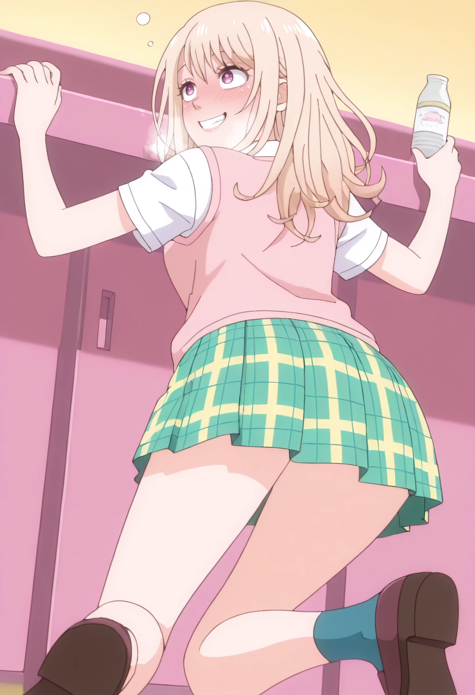 MonaSchoolD, shirt, school uniform, white shirt, sweater vest, collared shirt, vest, pink sweater vest, skirt, short sleeves, plaid skirt, pleated skirt, plaid clothes, green skirt, miniskirt, pink vest, pink cardigan, dress shirt, cardigan, socks, shoes, sweater, blue socks, loafers,