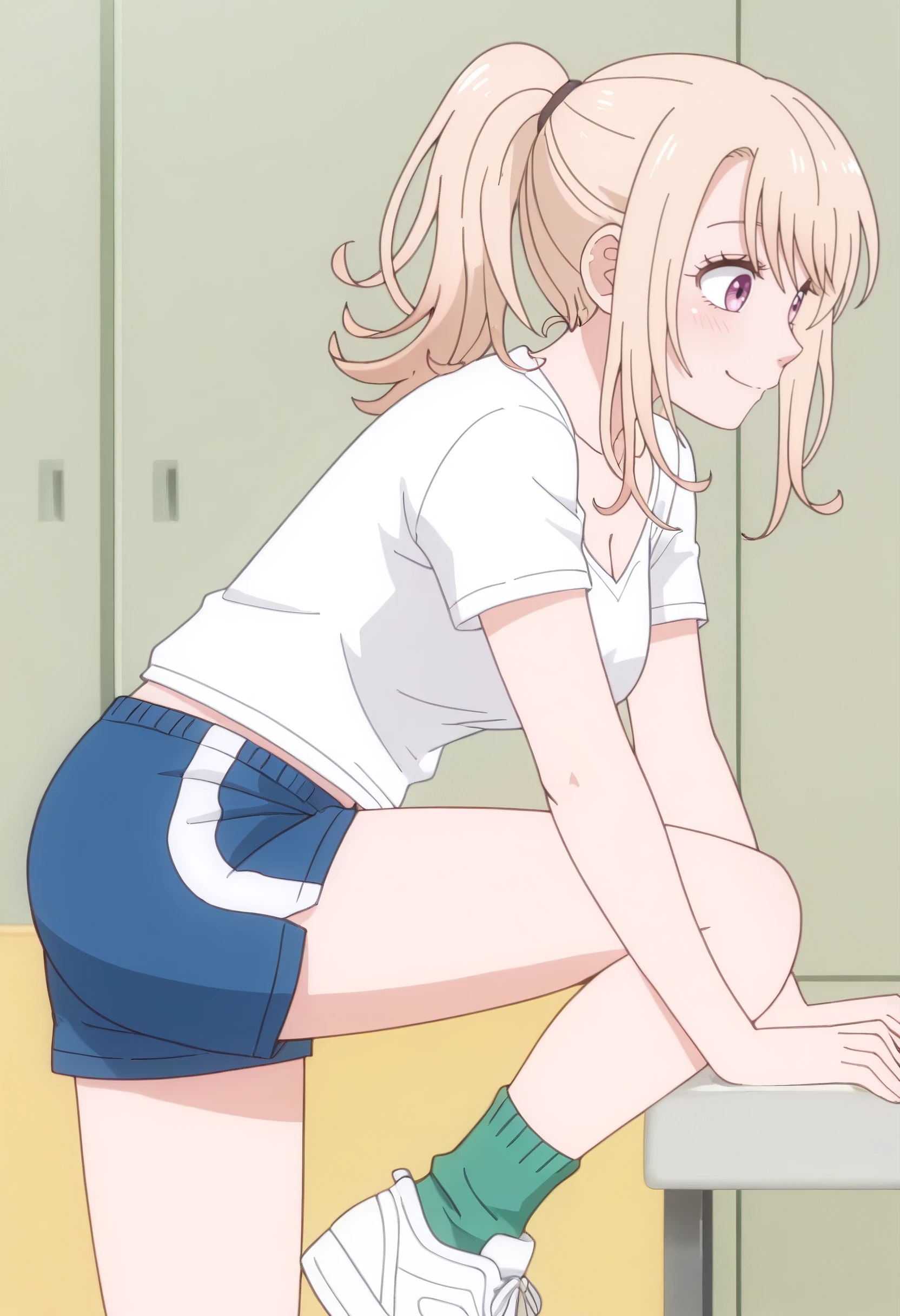 MonaGym, shirt, white shirt, t-shirt, ponytail, short sleeves, gym uniform, shorts, blue shorts, gym shorts, sidelocks, gym shirt, sportswear, high ponytail, socks, shoes, sneakers, white footwear, short ponytail, short shorts, green socks, midriff peek, cleavage,