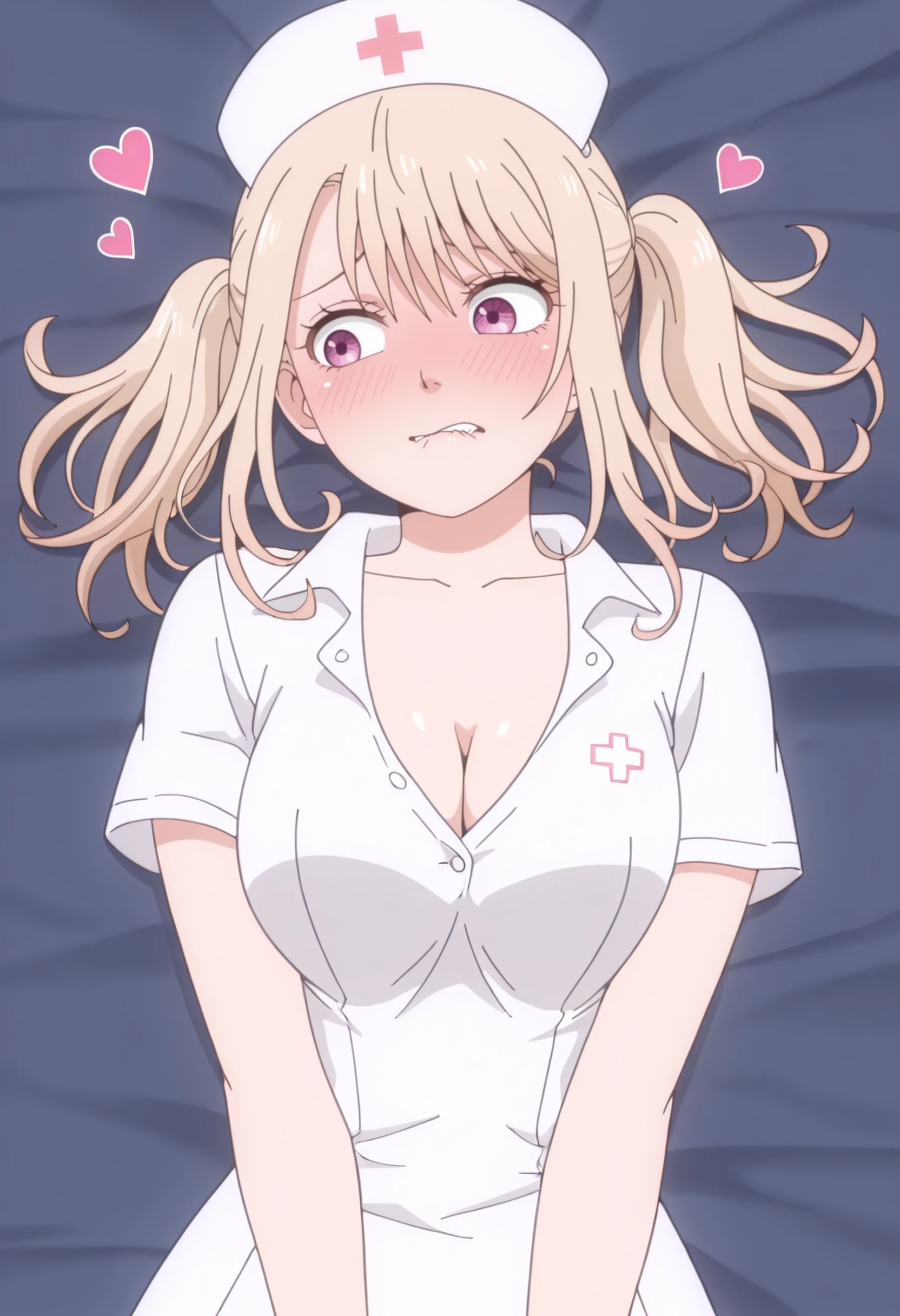 MonaNurse, short sleeves, twintails, heart, short twintails, shirt, nurse, nurse cap, hat, cleavage, short hair, white shirt, dress, ponytail, collared shirt, dress shirt, white headwear, white dress, collared dress,