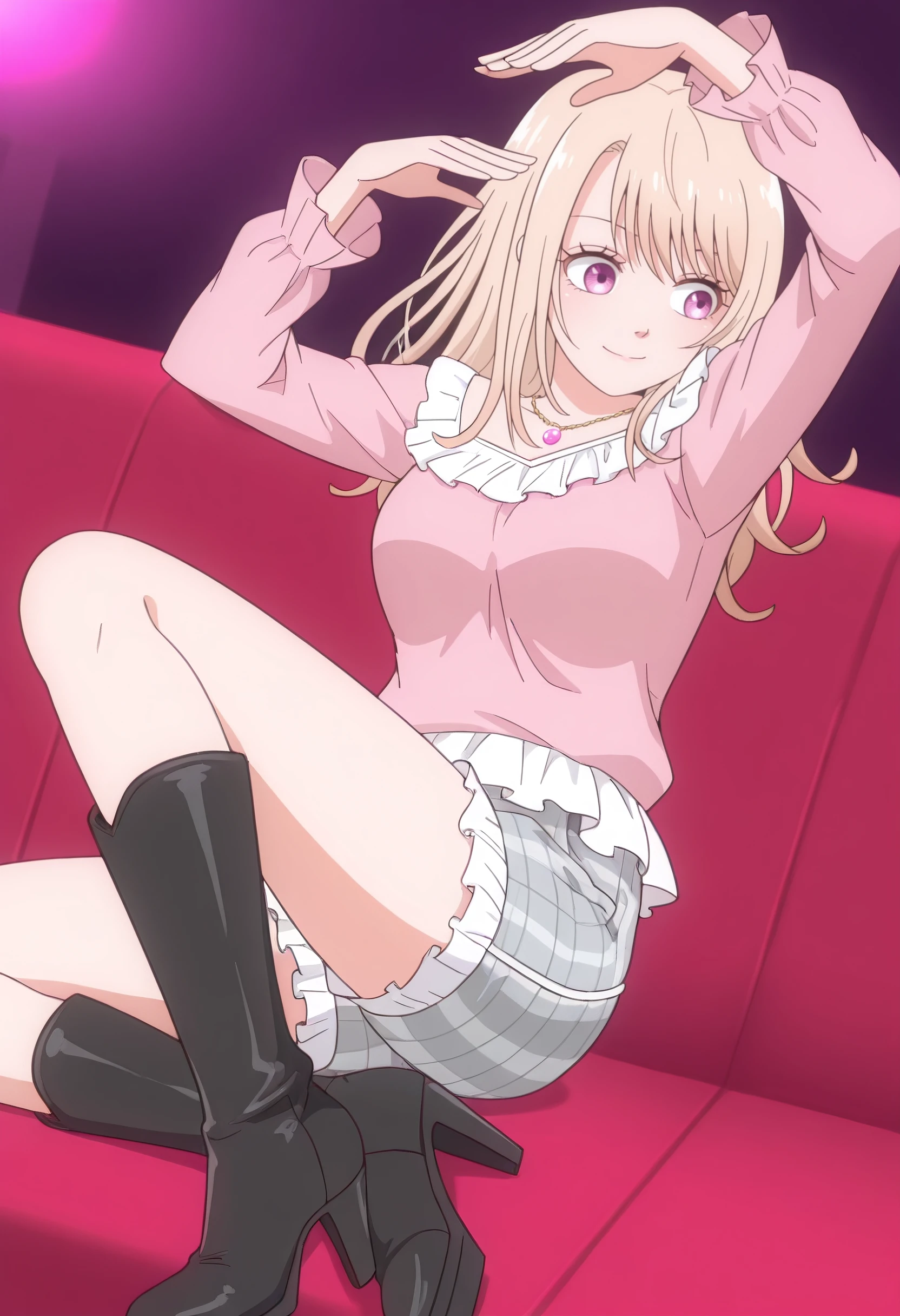 MonaFrilled, pink shirt, shirt, long sleeves, jewelry, necklace, shorts, frills, black footwear, boots, high heels, high heel boots, knee boots, frilled shorts, plaid clothes, grey shorts,