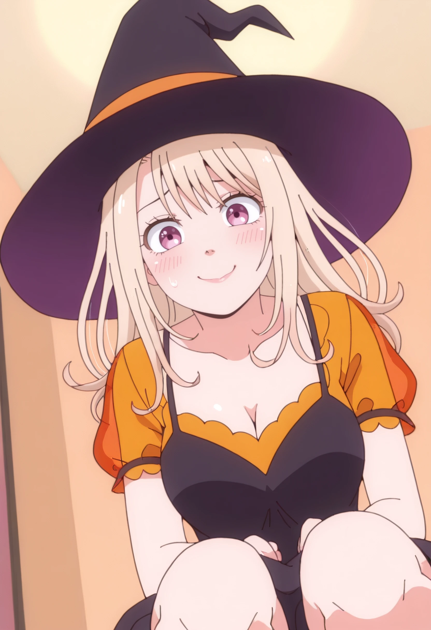 MonaHalloween, dress, hat, short sleeves, witch hat, black dress, black hat, witch, puffy sleeves, cleavage, puffy short sleeves, see-through clothes, halloween costume, shirt, sleeveless dress, see-through sleeves, spaghetti strap, orange sleeves, pinafore dress, orange shirt,