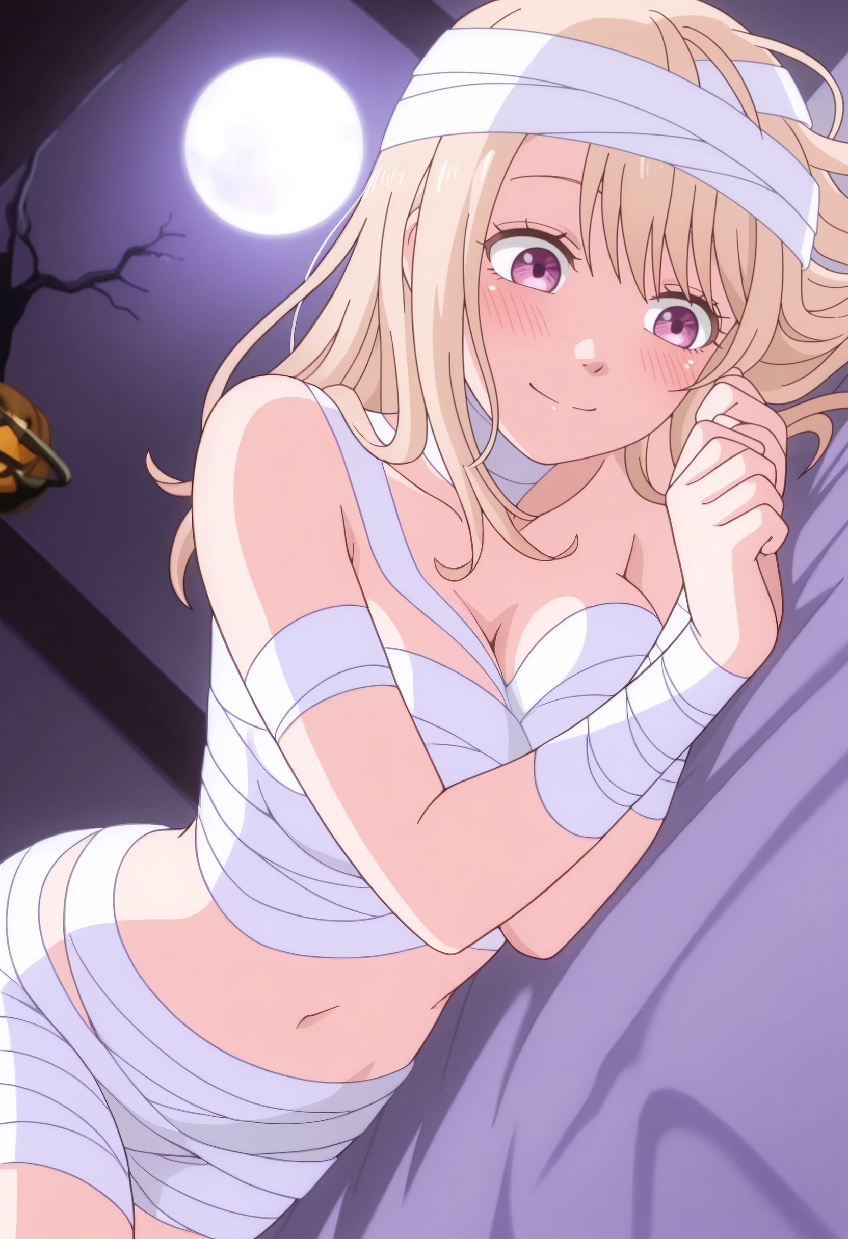 MonaBandage, bandages, naked bandage, mummy costume, bandaged chest, bandaged arm, bandaged head, navel, cleavage, sarashi, halloween costume, midriff,