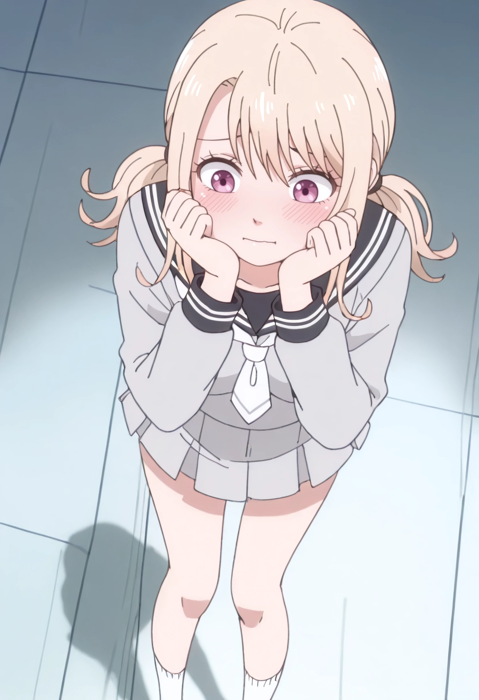 MonaSchoolA, school uniform, serafuku, sailor collar, shirt, white neckerchief, neckerchief, long sleeves, grey serafuku, skirt, pleated skirt, twintails, black sailor collar, low twintails, white necktie, grey skirt, socks, white socks, kneehighs, miniskirt, short twintails, grey shirt,