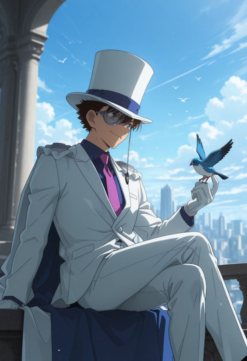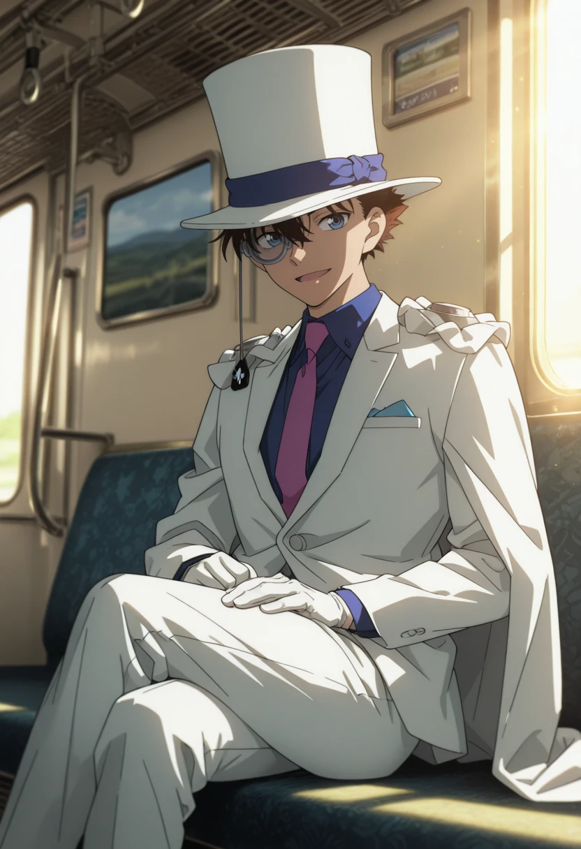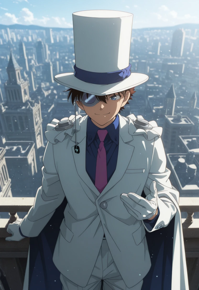 kaitokid,blue eyes,brown hair,monocle,top hat,cape,suit,formal,white suit,necktie,white gloves