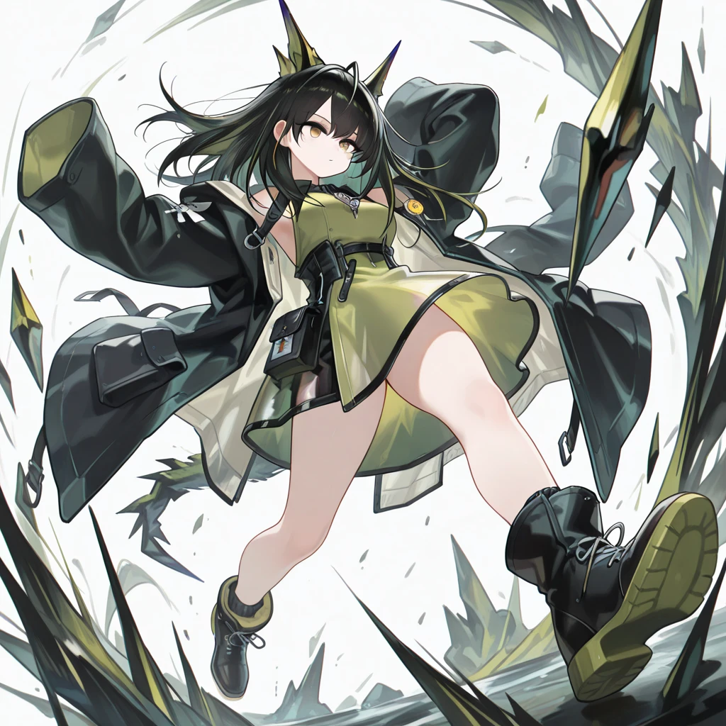 服装:black coat,open coat,green dress,black boots,ankle boots,