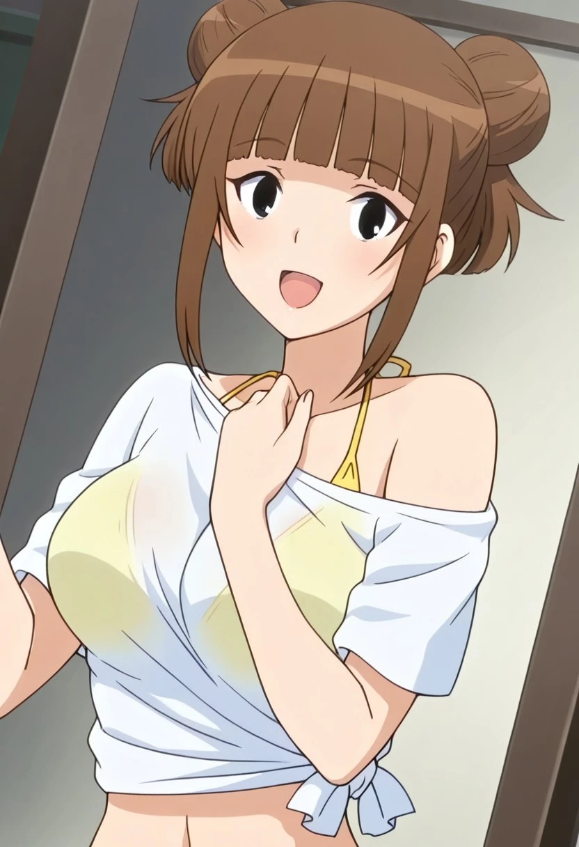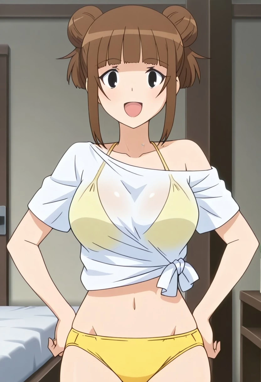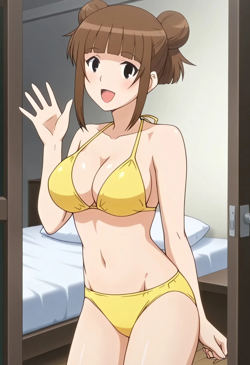 tomoko ishida joshikousei no koshitsuki anime style, double bun, blunt bangs, sidelocks, short hair, brown hair, black eyes, large breasts,