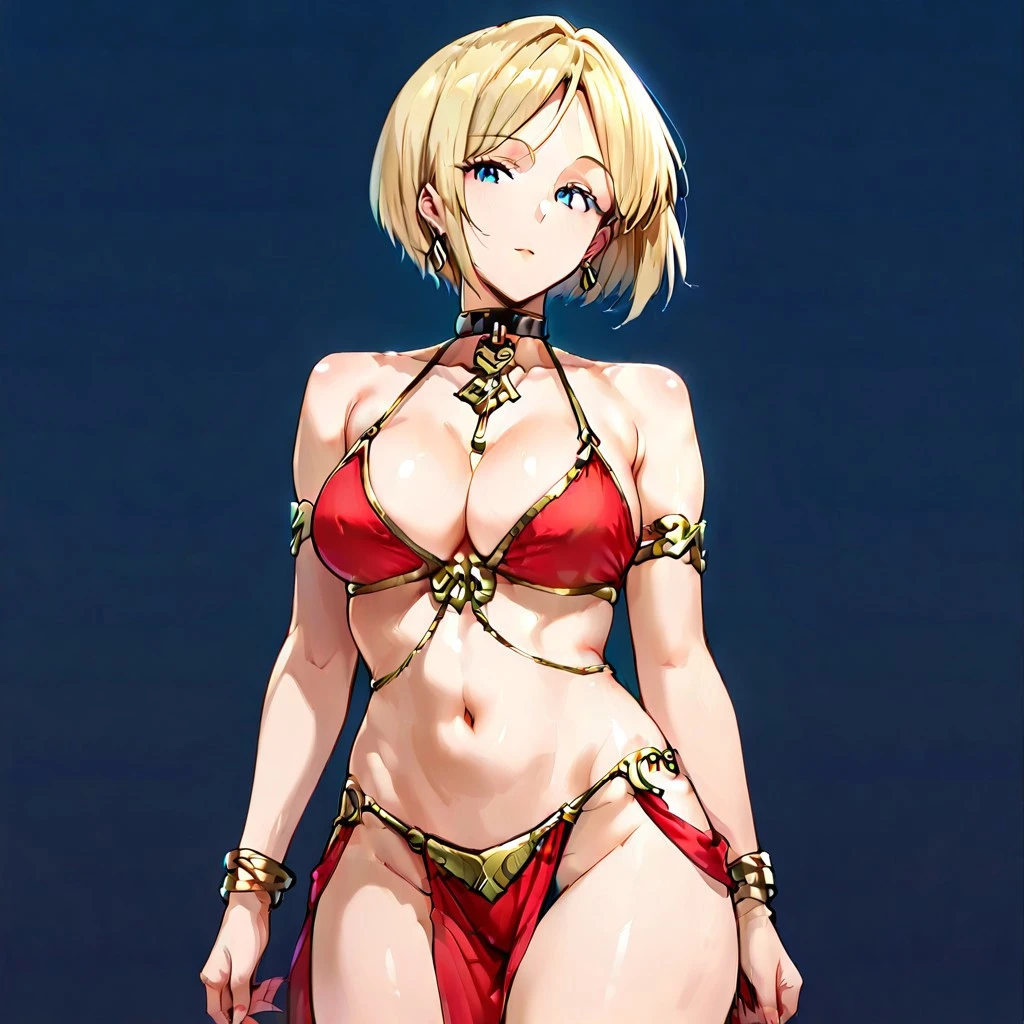kaho, blonde hair, short hair, 1girl, breasts, underwear, jewelry, panties, dress, blonde hair, red dress, blue eyes, solo, earrings, large breasts, bracelet, navel, black panties, short dress