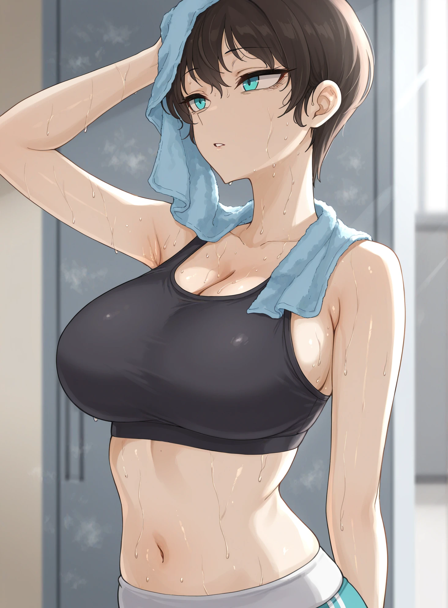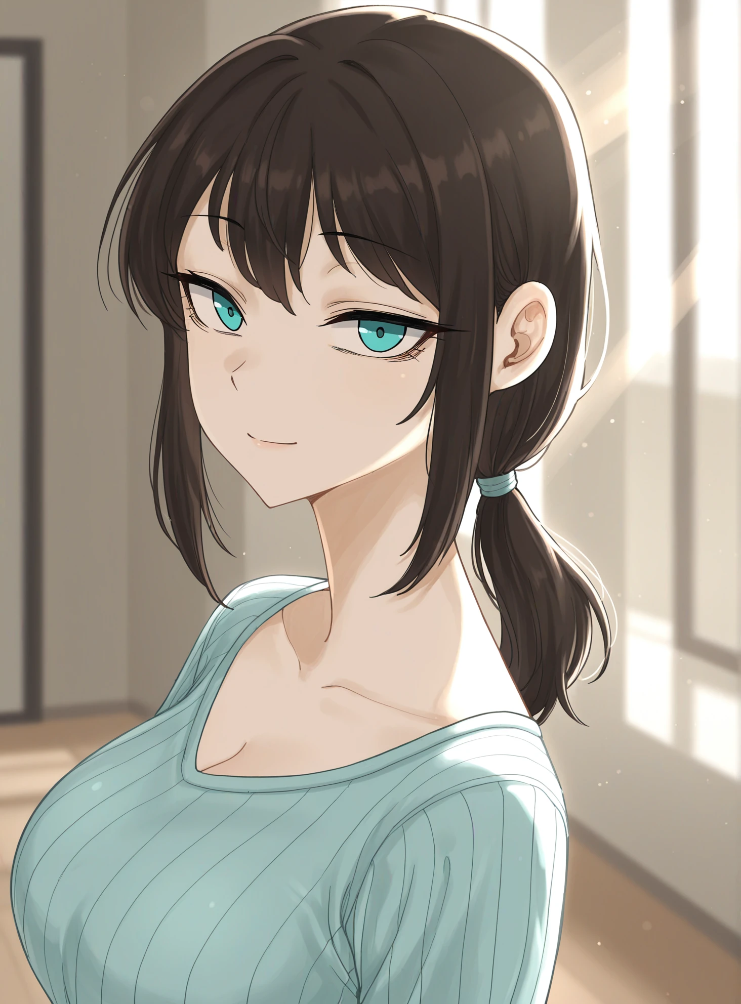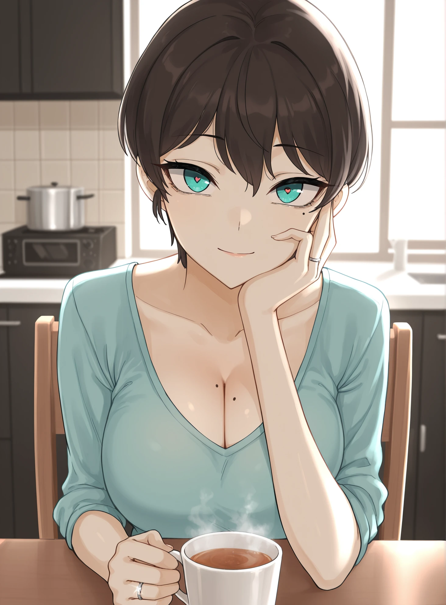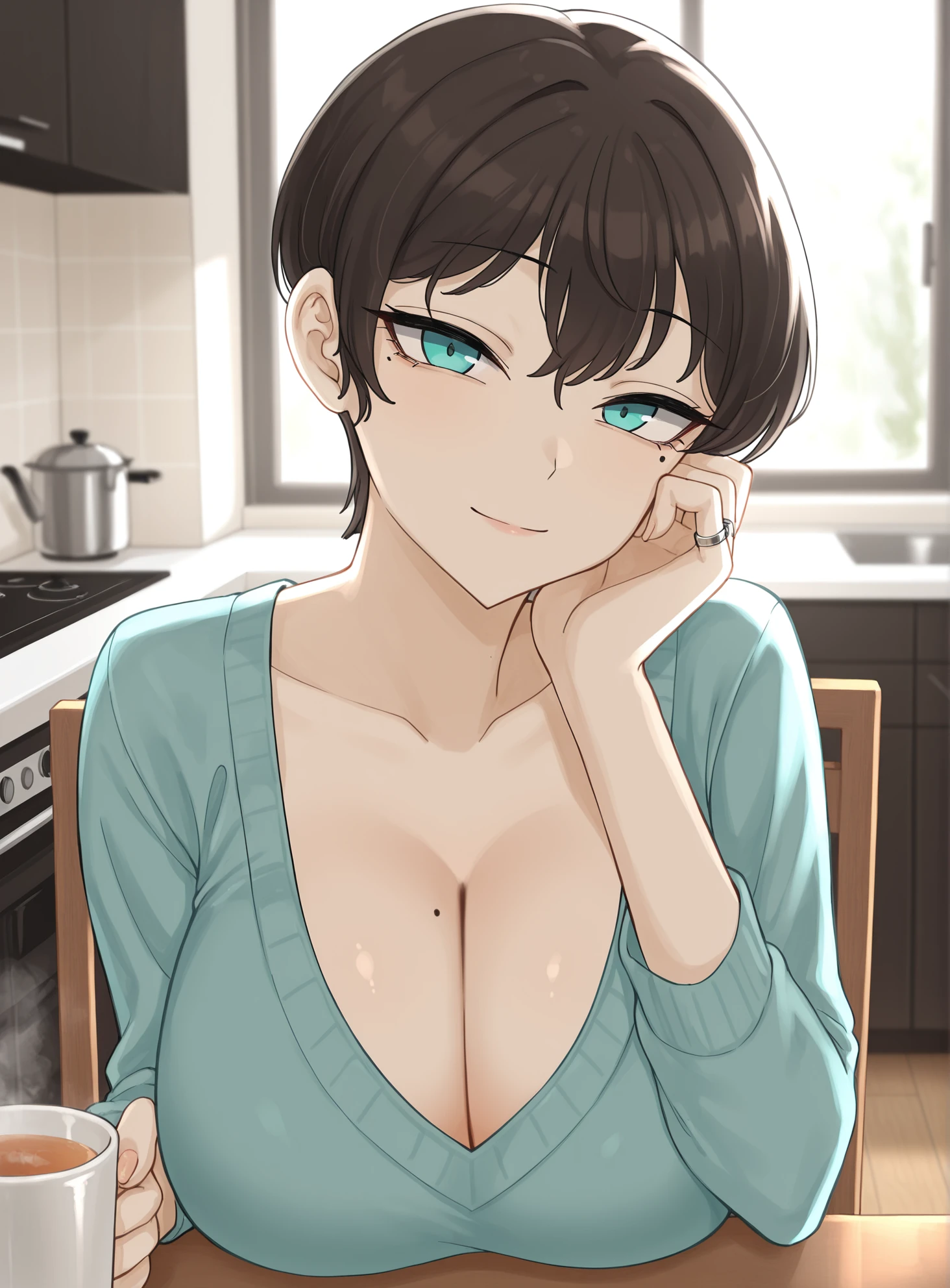masterpiece,best quality,amazing quality, womanyuj, milf,aqua eyes,brown hair,mole