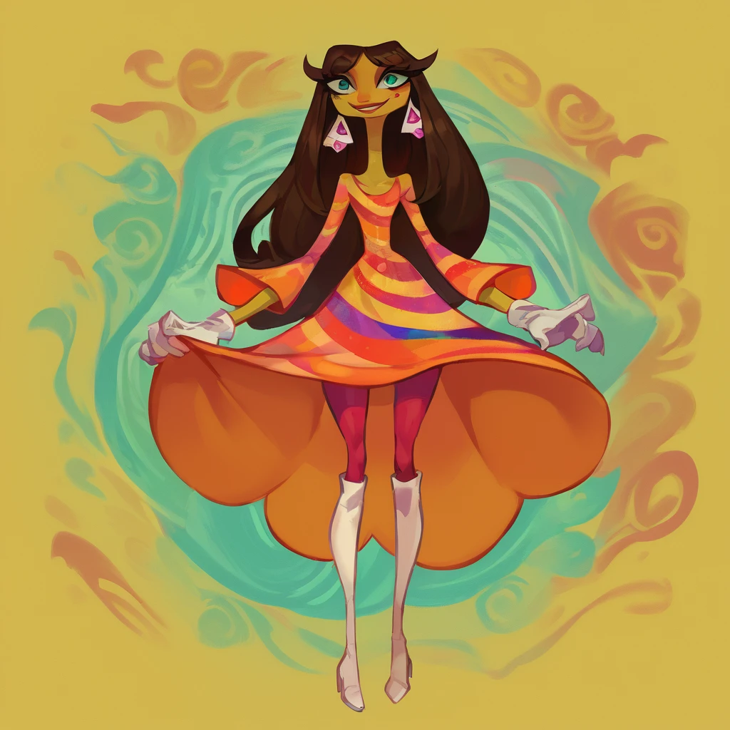 Default outfit: default outfit, multicolored dress, jewelry, earrings, high heels, gloves, white gloves, boots, white footwear, knee boots, striped, red pantyhose, pantyhose