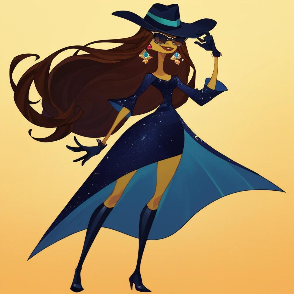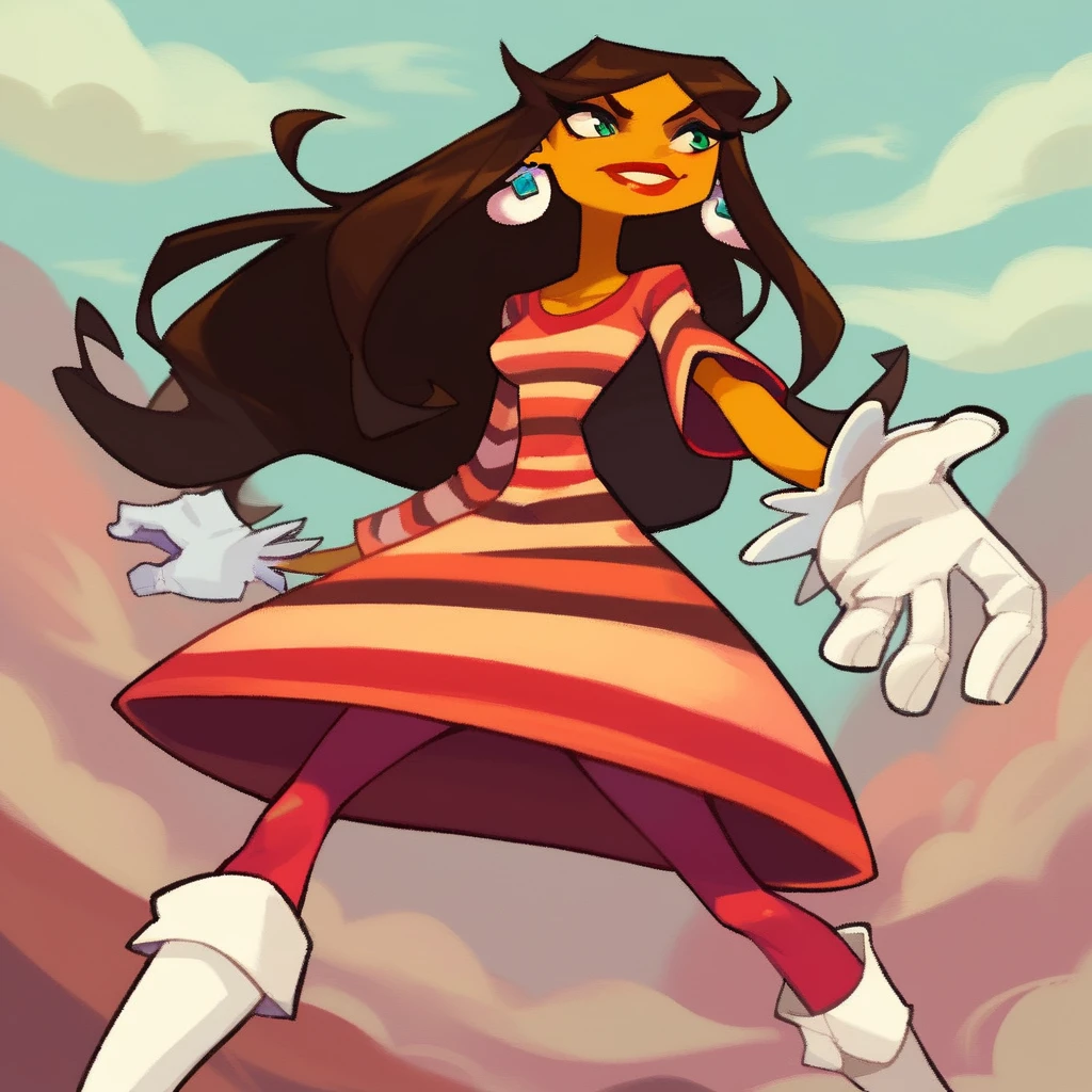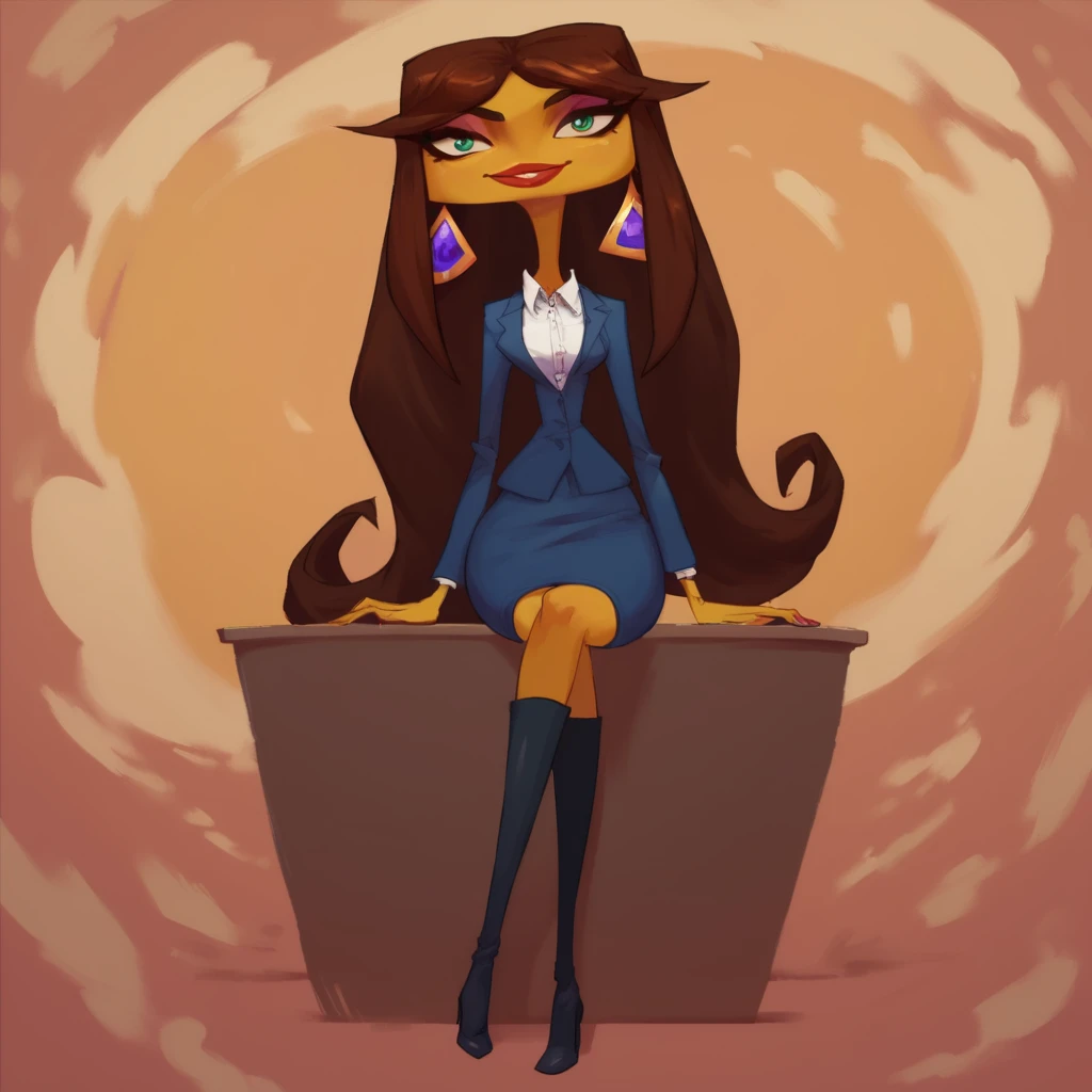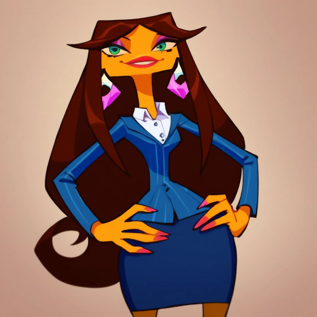 Other useful keywords: long hair, very long hair, brown hair, makeup, lipstick, dark-skinned female, yellow skin, earrings, jewelry