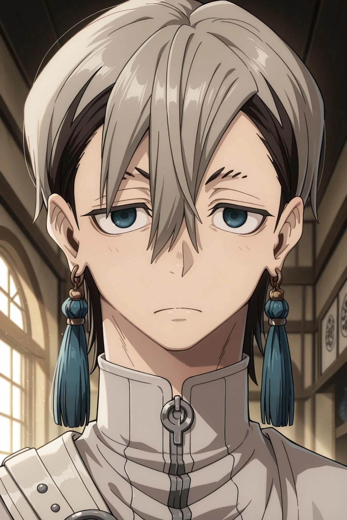 Zanka, zanka nifuji, grey hair, two-tone hair, black hair, blue eyes, hair between eyes, short hair, tassel earringsOption:
