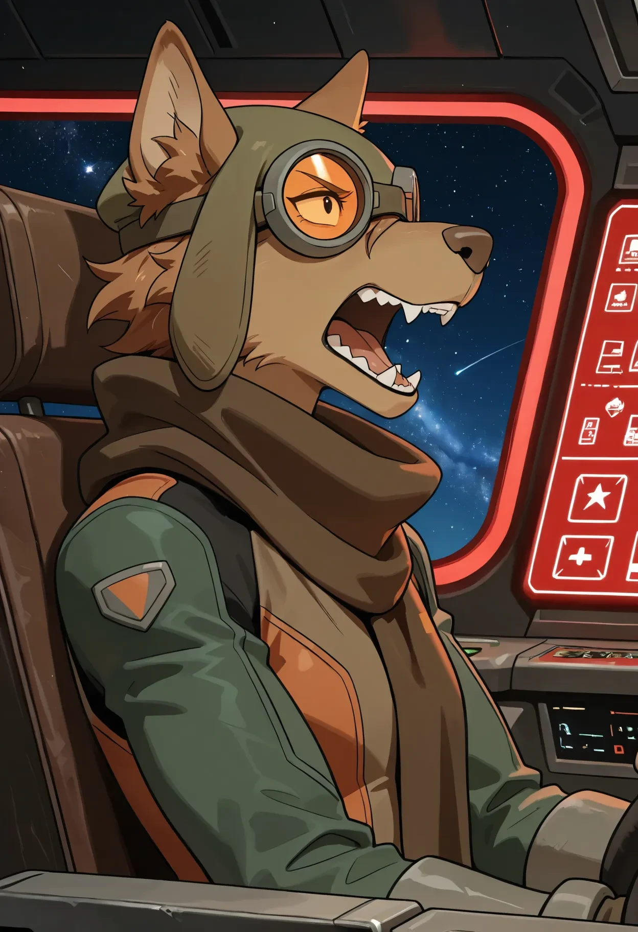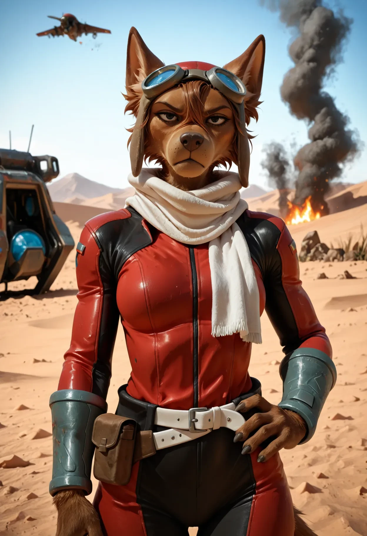 goggles, goggles on head, blue lenses, aviator cap, green cap, brown scarf, flight suit, green and orange suit, brown belt, pouch,