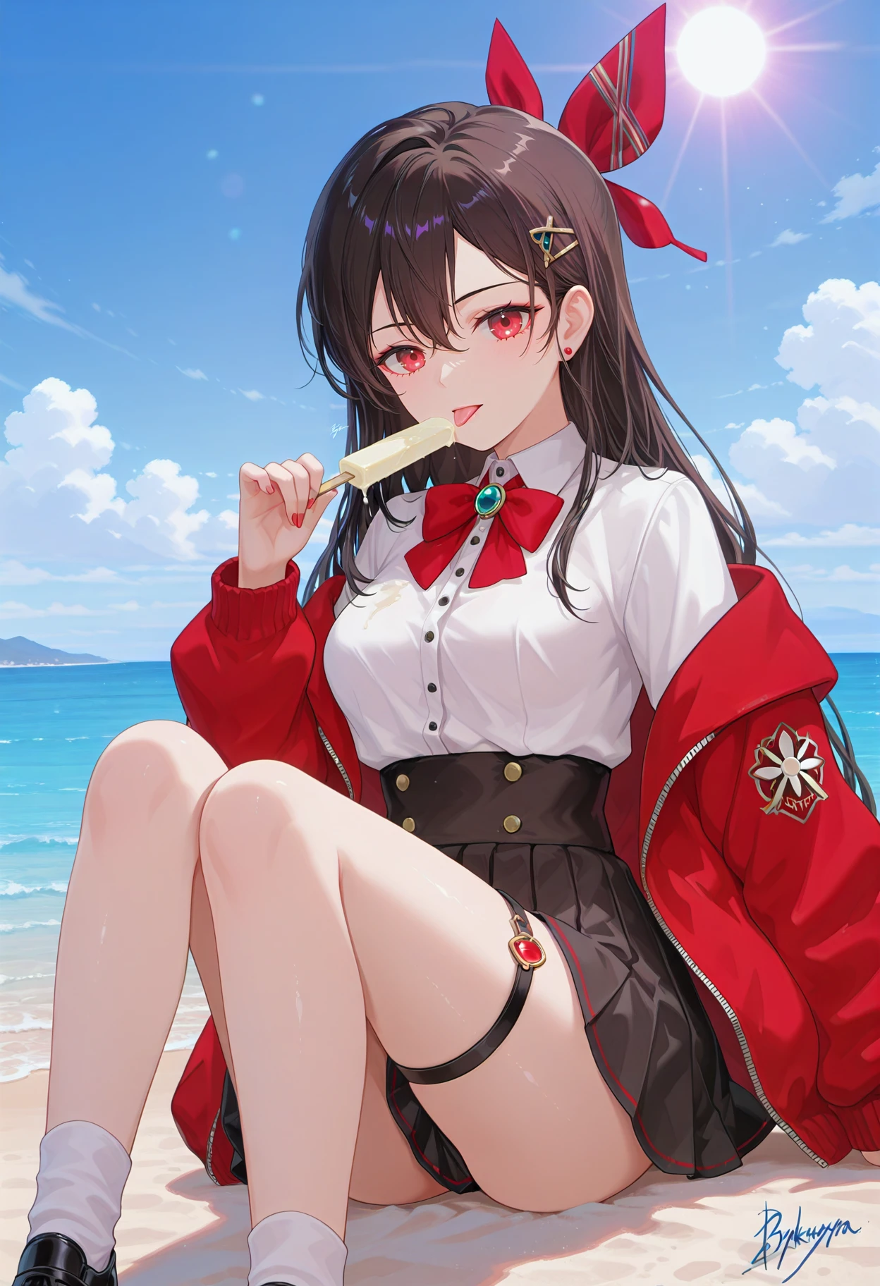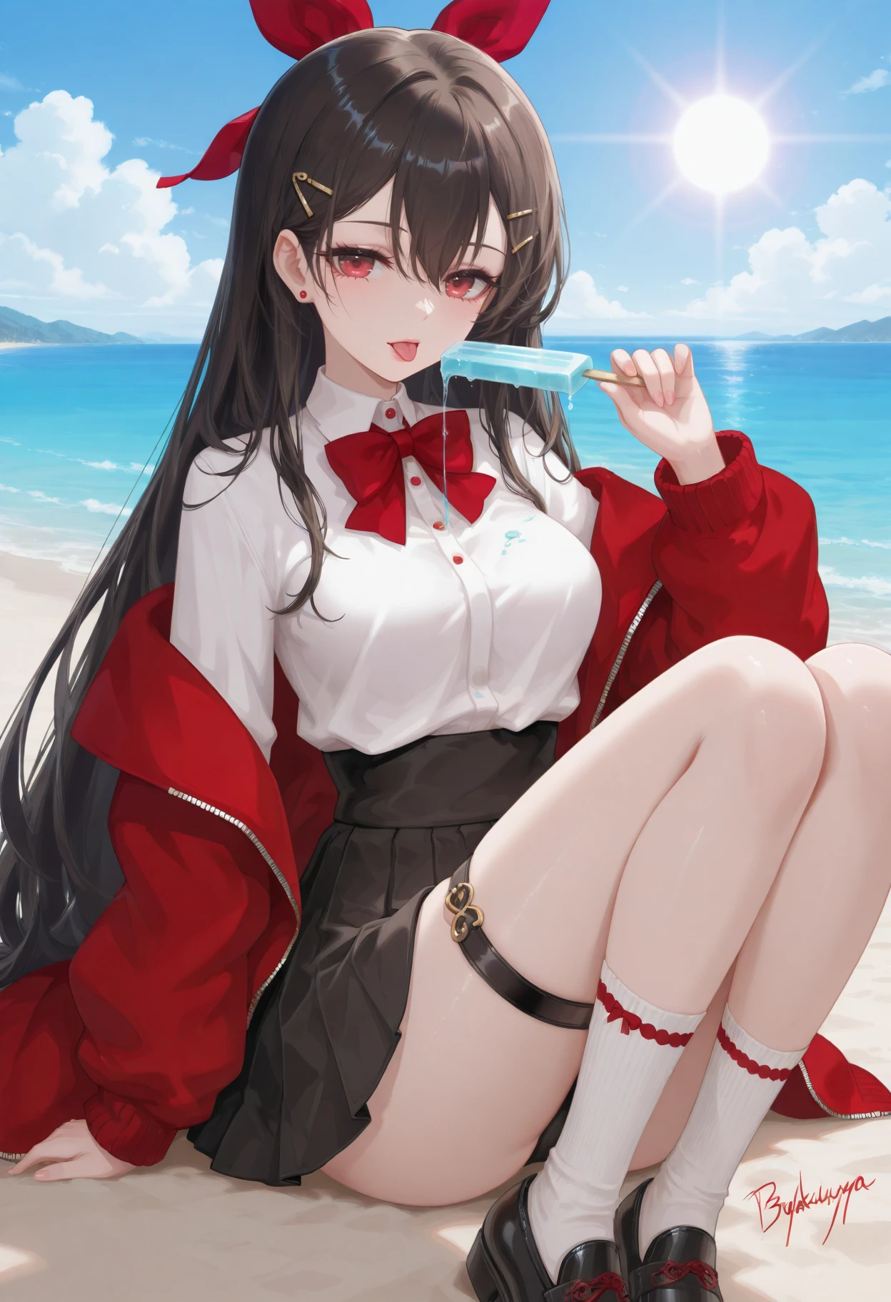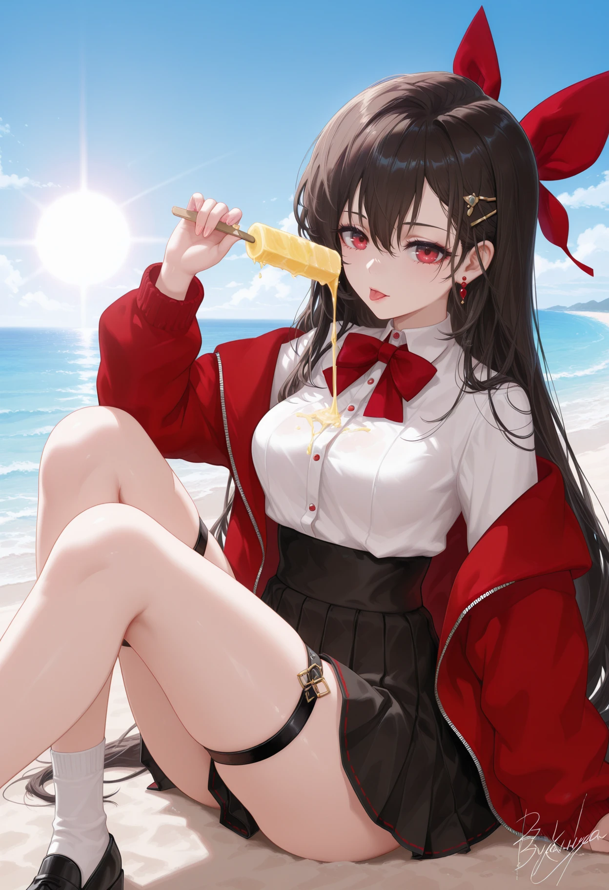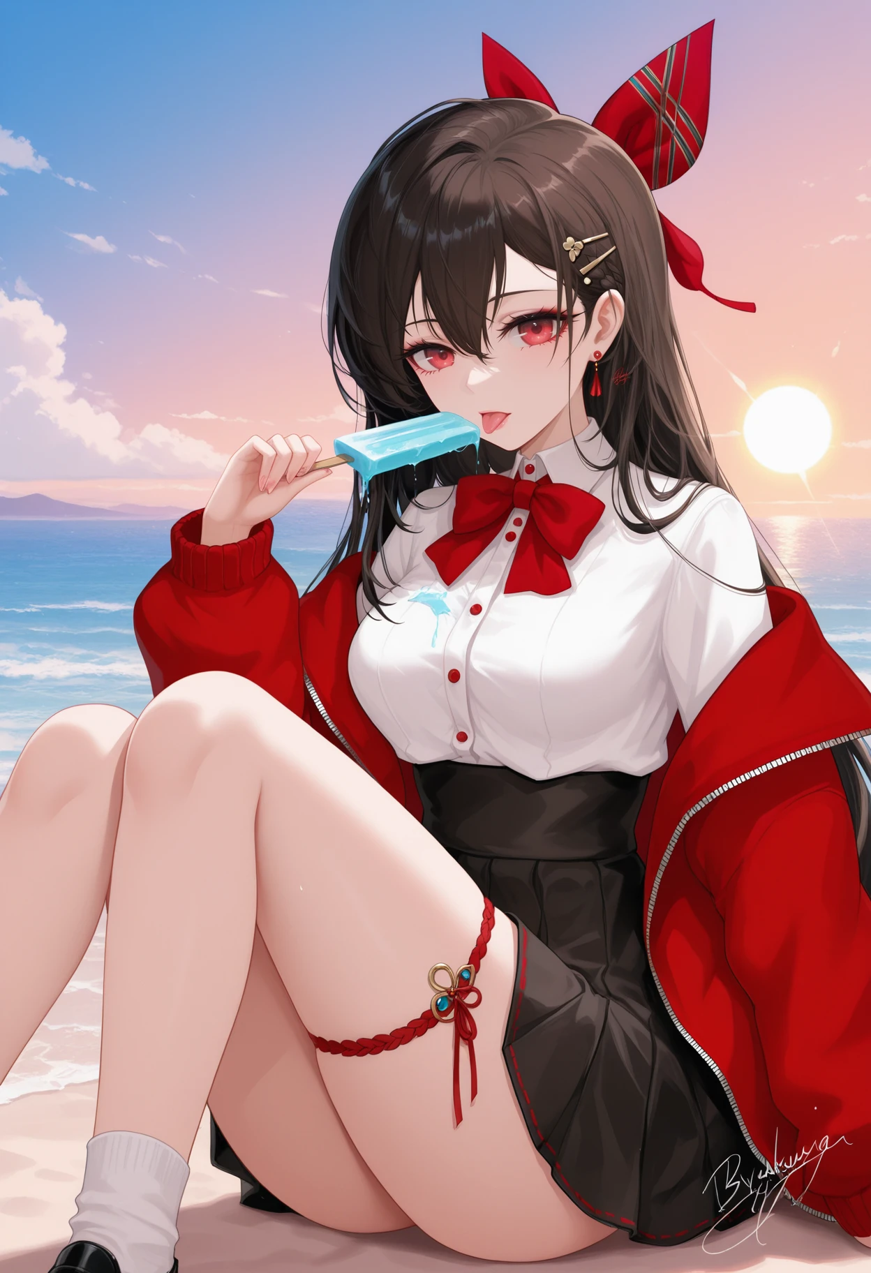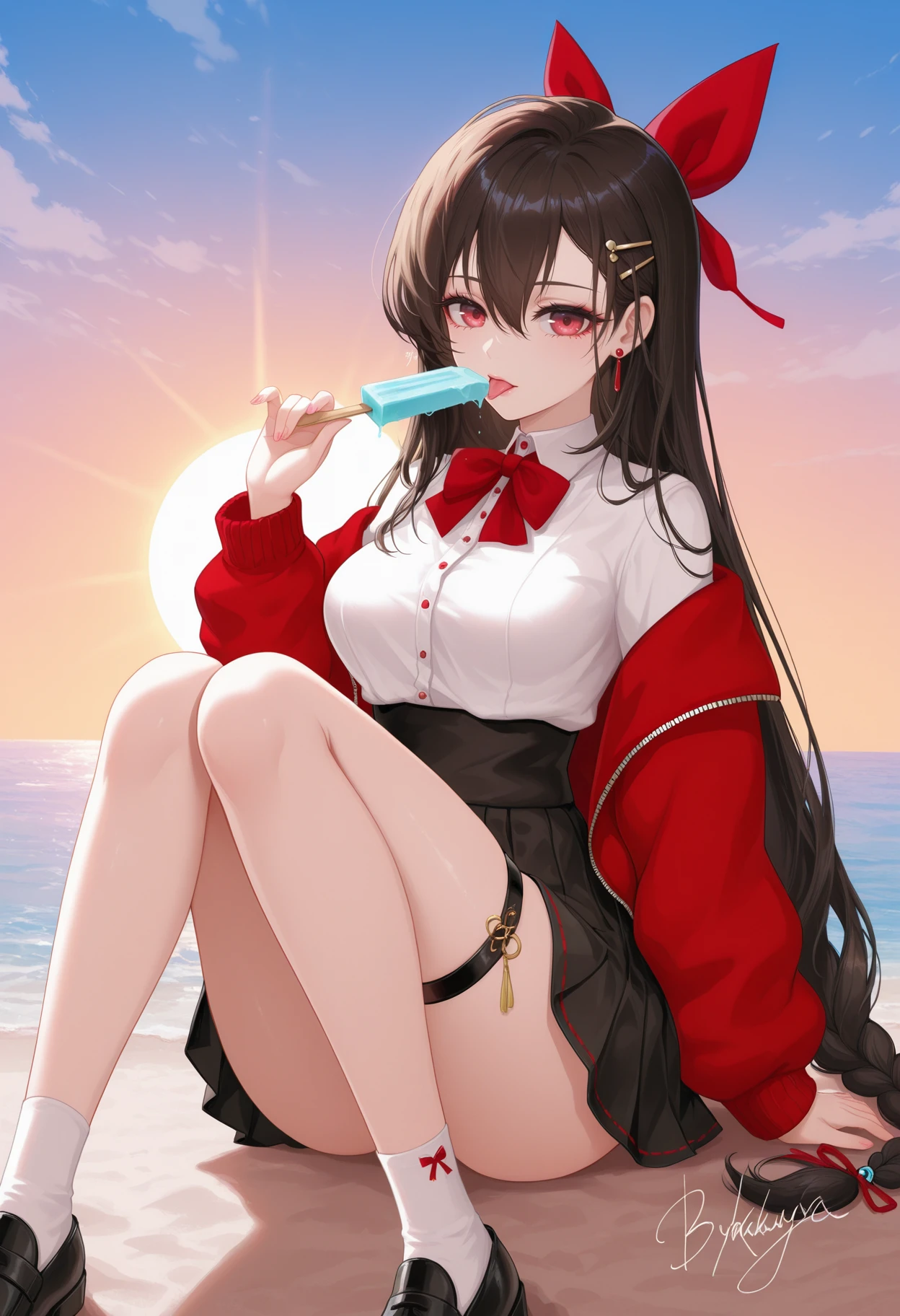 guchengyao,1girl,solo,long hair,bangs,brown hair,black hair,hair ornament,red eyes,hair between eyes,jewelry,hair bow,earrings,hairclip,red bow,hair ribbon,bowtie,breasts,skirt,shirt,long sleeves,bow,ribbon,very long hair,jacket,white shirt,braid,pleated skirt,,collared shirt,black skirt,off shoulder,,red jacket,socks,miniskirt,black footwear,thigh strap,white socks,high-waist skirt,