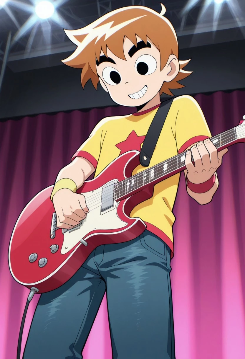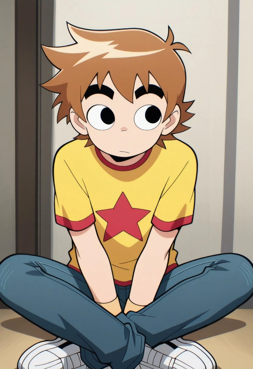 scotpilgr, 1boy, male focus, solo, black eyes, brown hair, short hair, t-shirt, yellow shirt, star (symbol), wristband, jeans, shoes, sneakers,