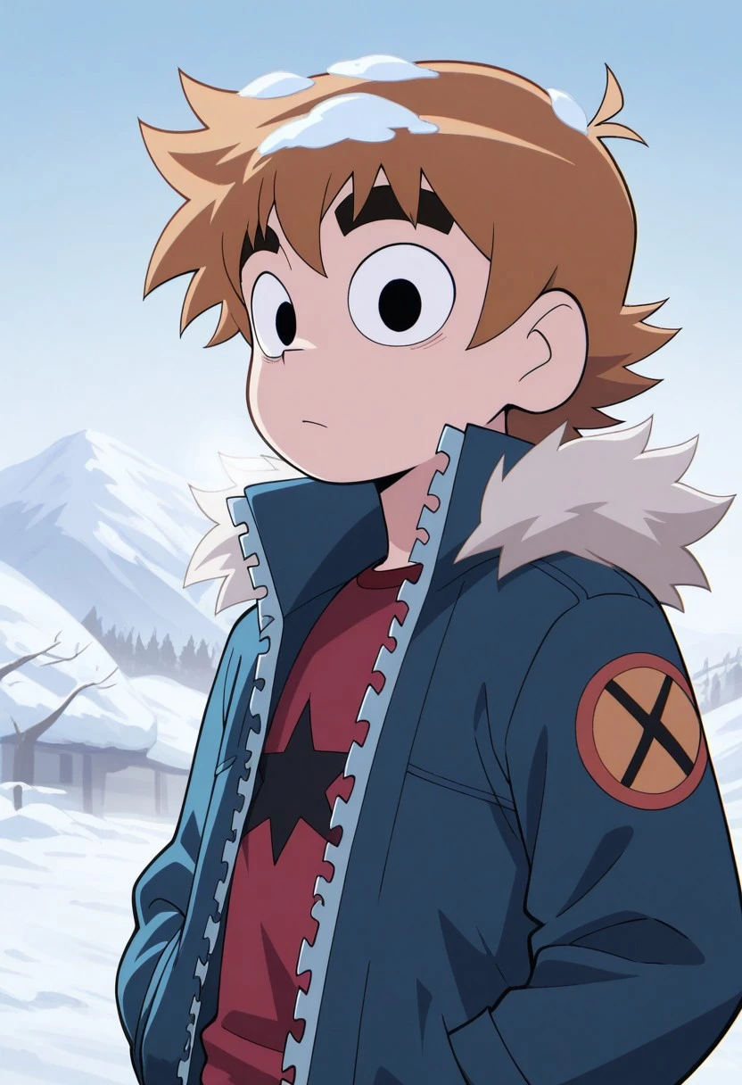 scotpilgr, 1boy, male focus, solo, black eyes, brown hair, short hair, shirt, red shirt, jacket, blue jacket, fur trim, open jacket, jeans, shoes, sneakers