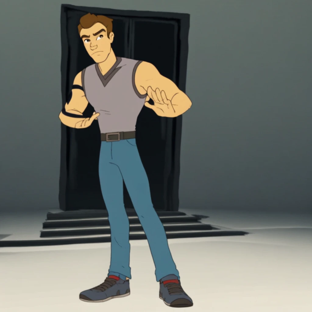 sleeveless, sleeveless shirt, pants, belt, blue pants, shoes,