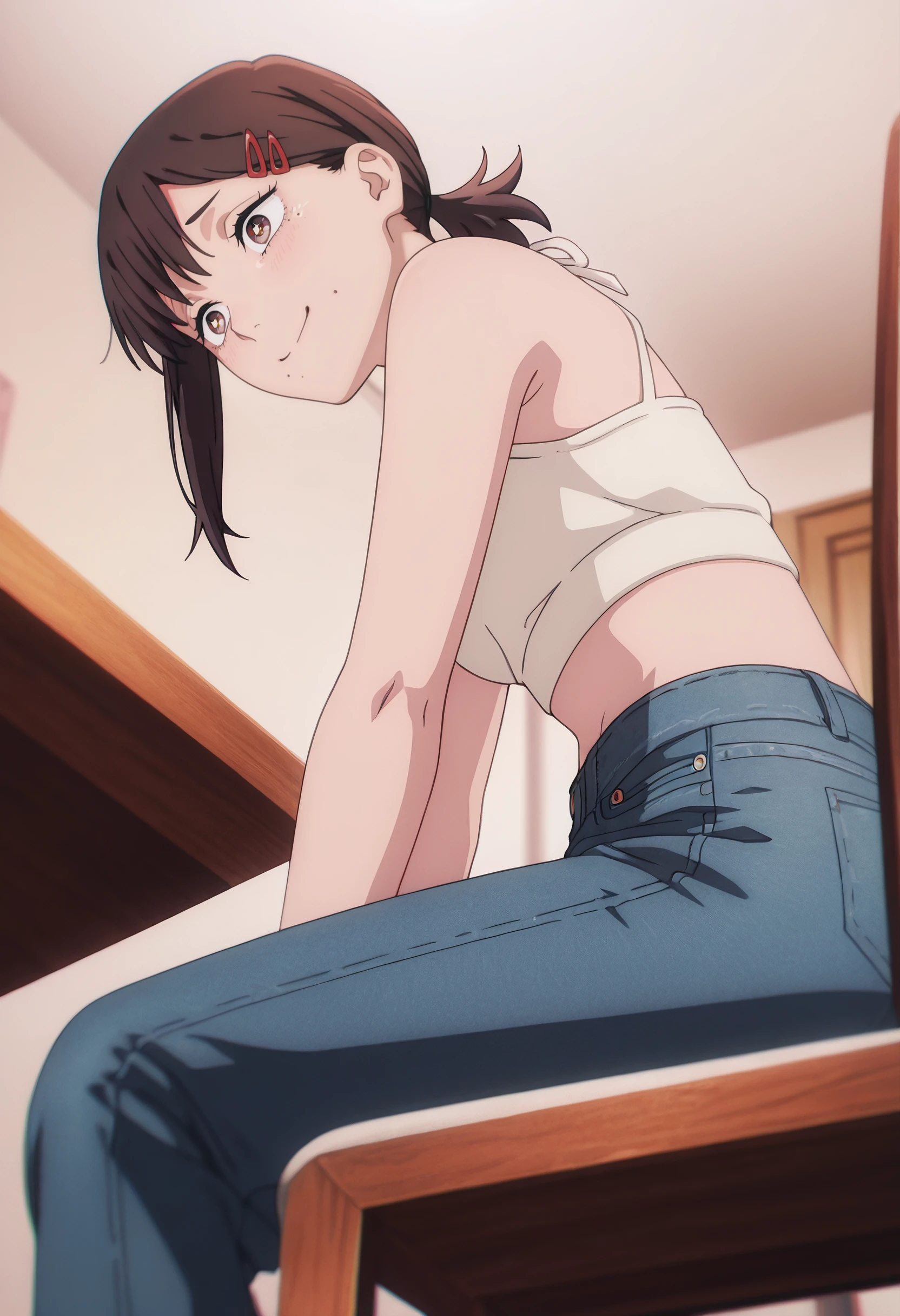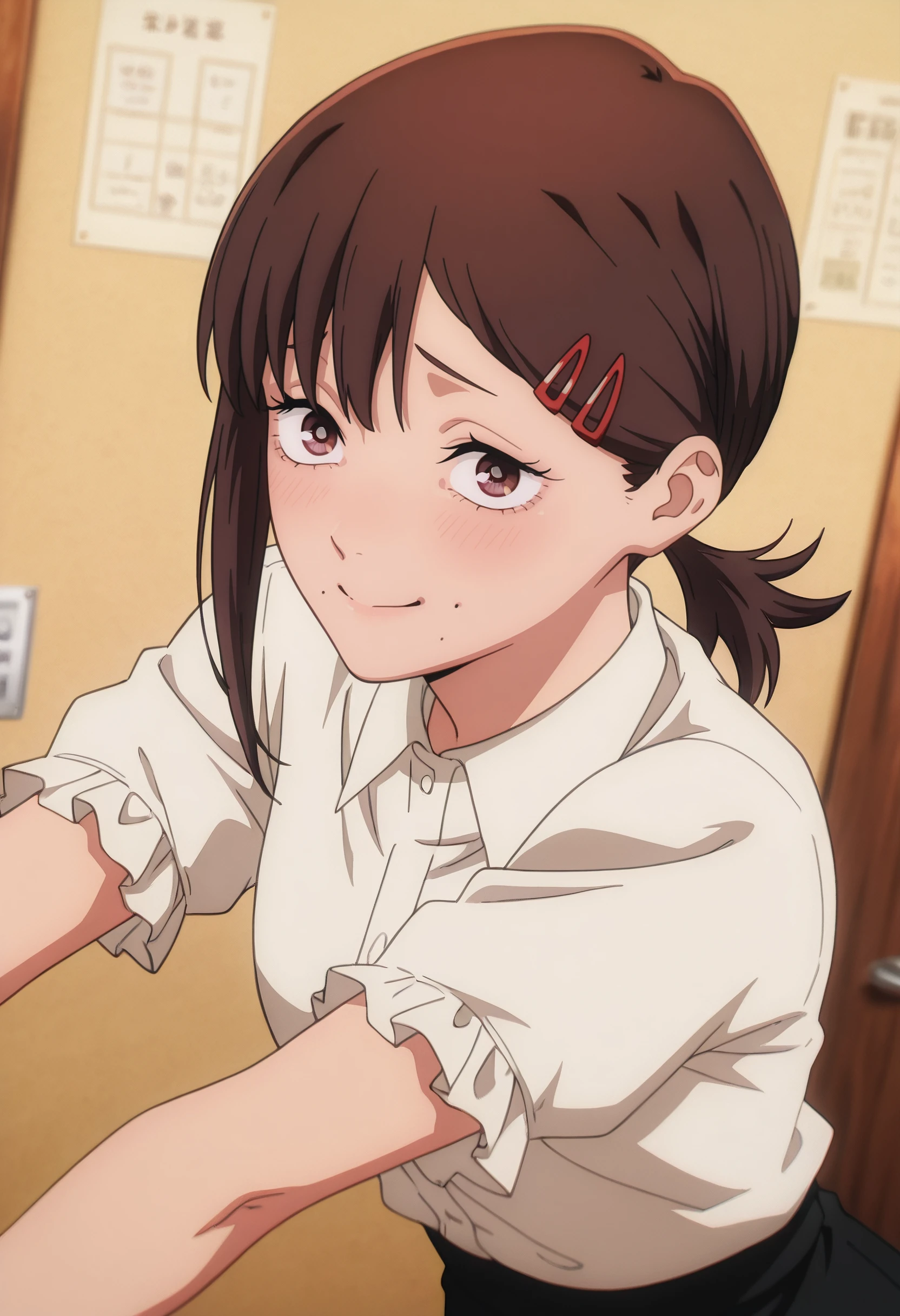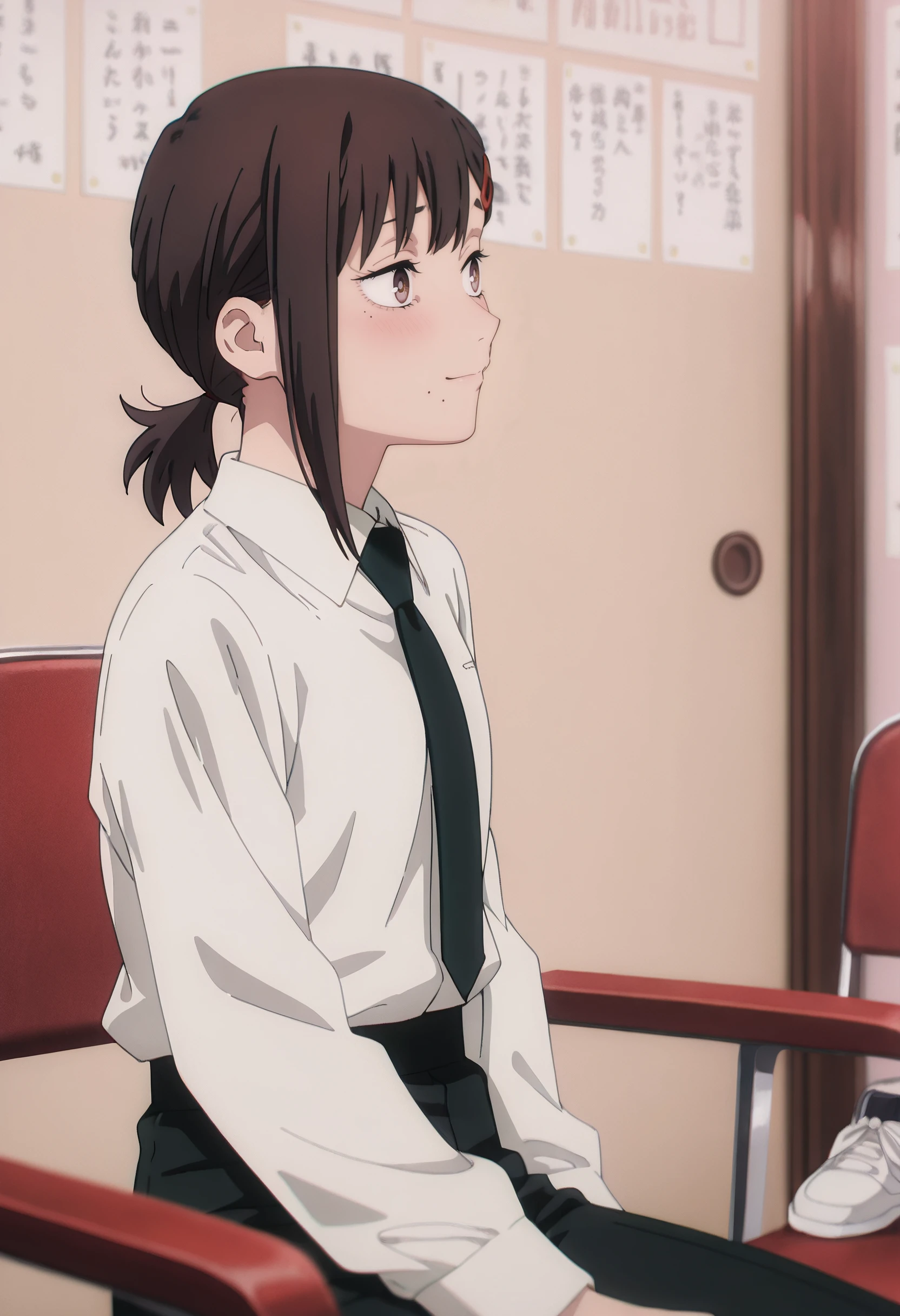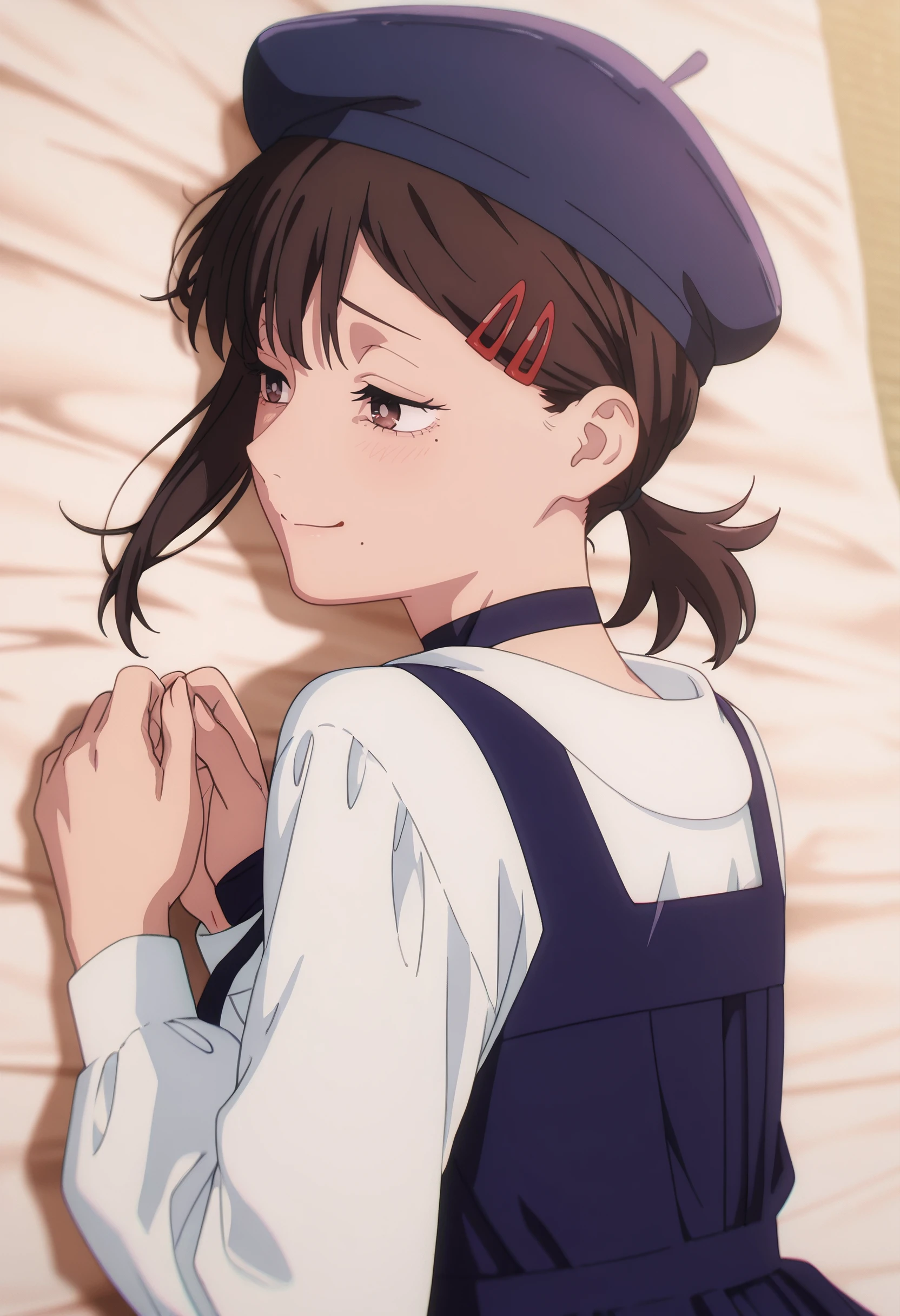 CMaKobeni, black hair, short hair, short ponytail, single sidelock, swept bangs, brown eyes, hair ornament, hairclip, multiple moles, mole under mouth, mole under eye, mole on cheek,