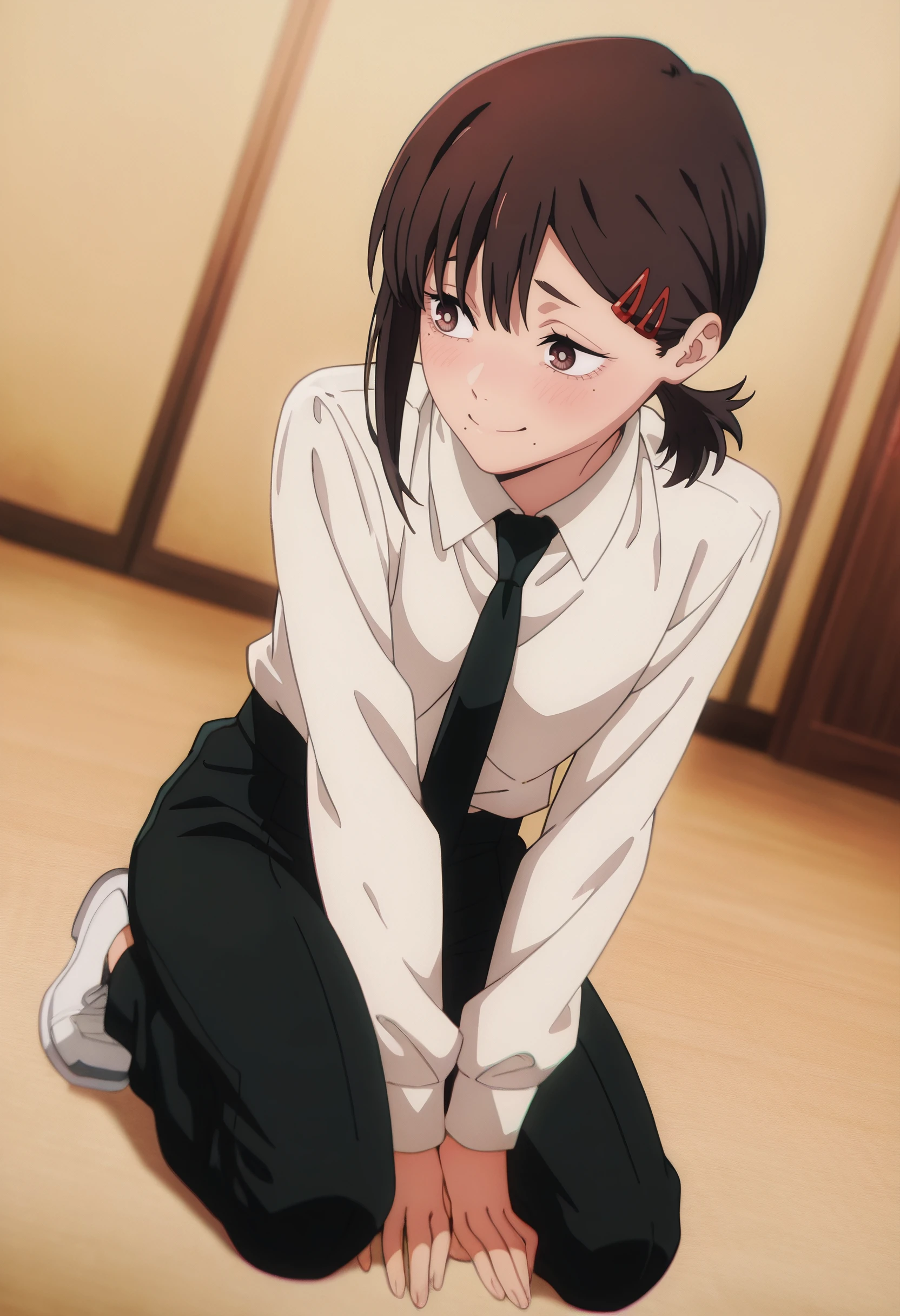 KobeniShirt, white shirt, collared shirt, black pants, black necktie, long sleeves, shirt tucked in, shoes, white footwear,
