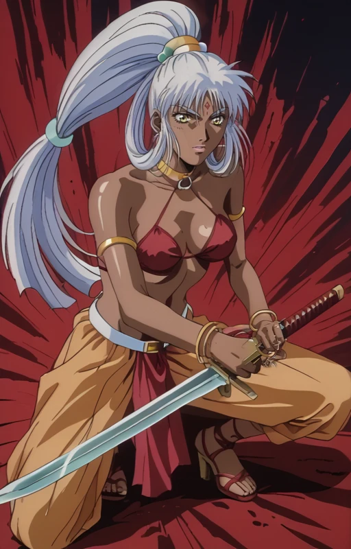 sutra, 1girl, solo, dark skin, dark-skinned female, sutraclothes, long hair, ponytail, white hair, breasts, yellow eyes, retro artstyle, swimsuit, bikini, 1990s (style), jewelry, facial mark, forehead mark, bracelet, bikini top only, very dark skin