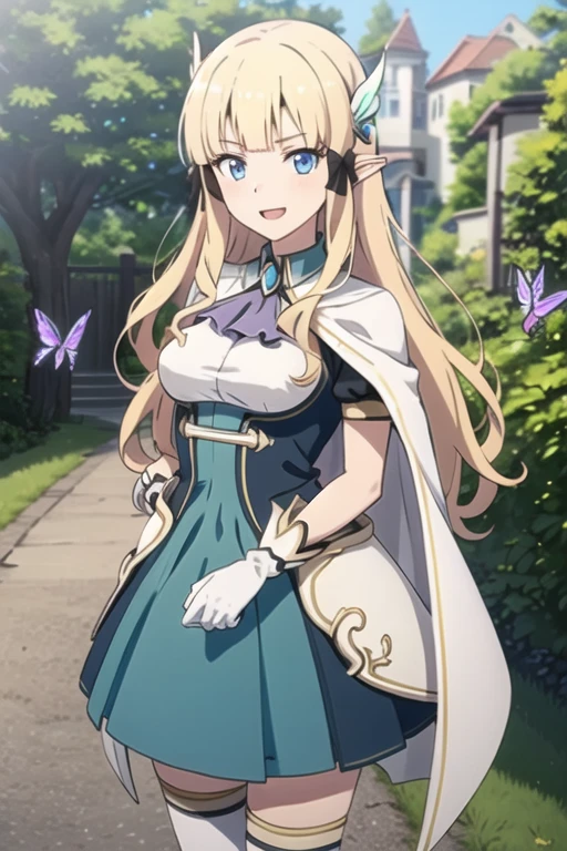 saren (princess connect!), 1girl, solo, long hair, blue eyes, blonde hair, hair ornament, short sleeves, hair bow, pointy ears, white gloves, blunt bangs, cape, white thighhighs