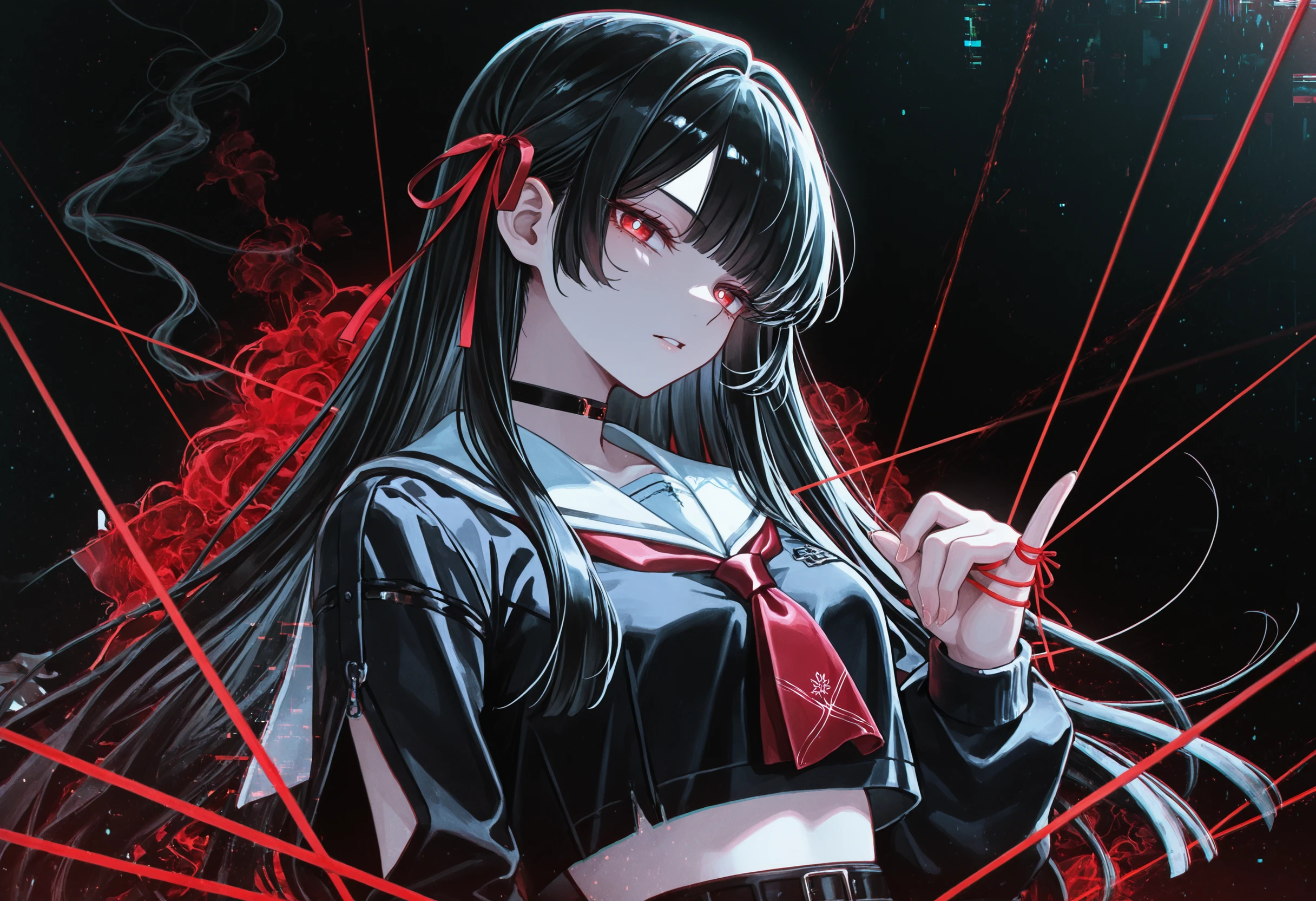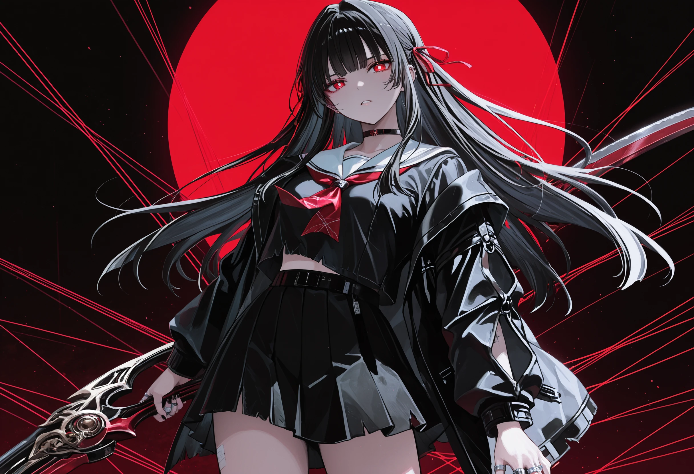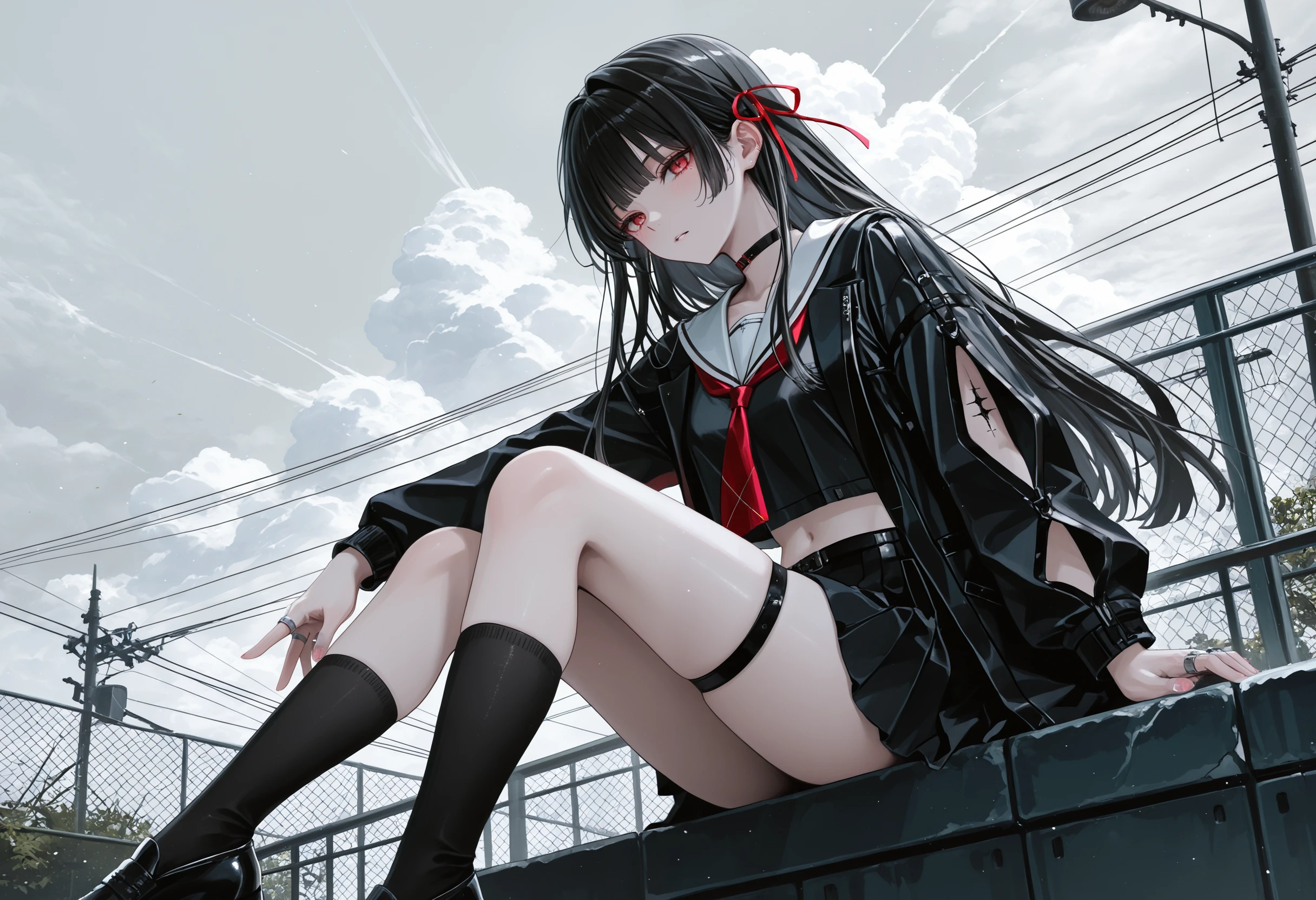 Default outfit: hair ribbon, choker, school uniform, midriff peek, black serafuku, white sailor collar, red neckerchie, jacket, black skirt, pleated skirt, thigh strap, torn clothes, multiple rings, black footwear, black socks