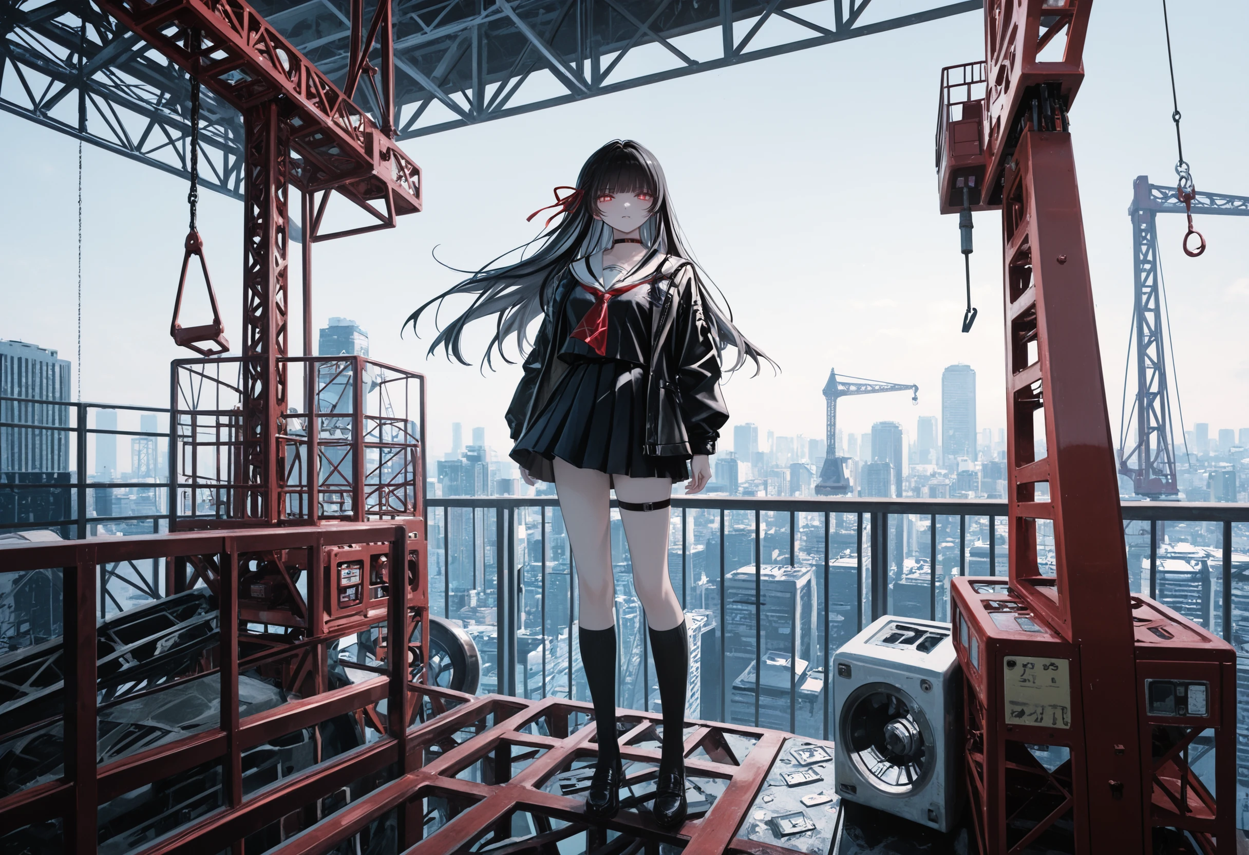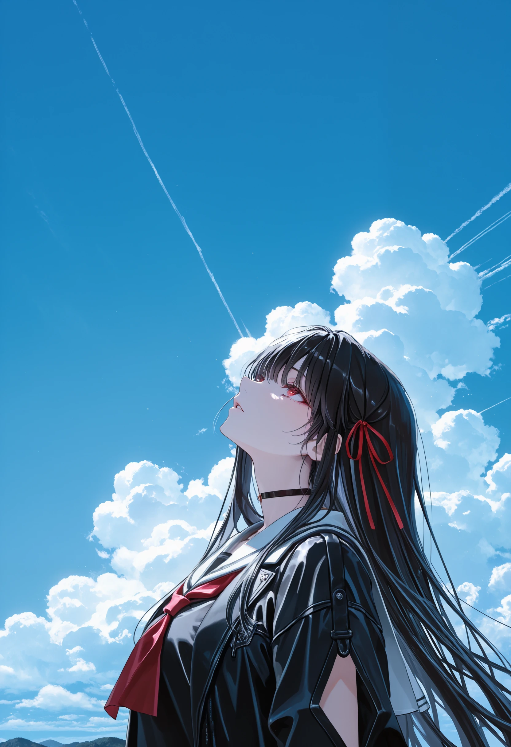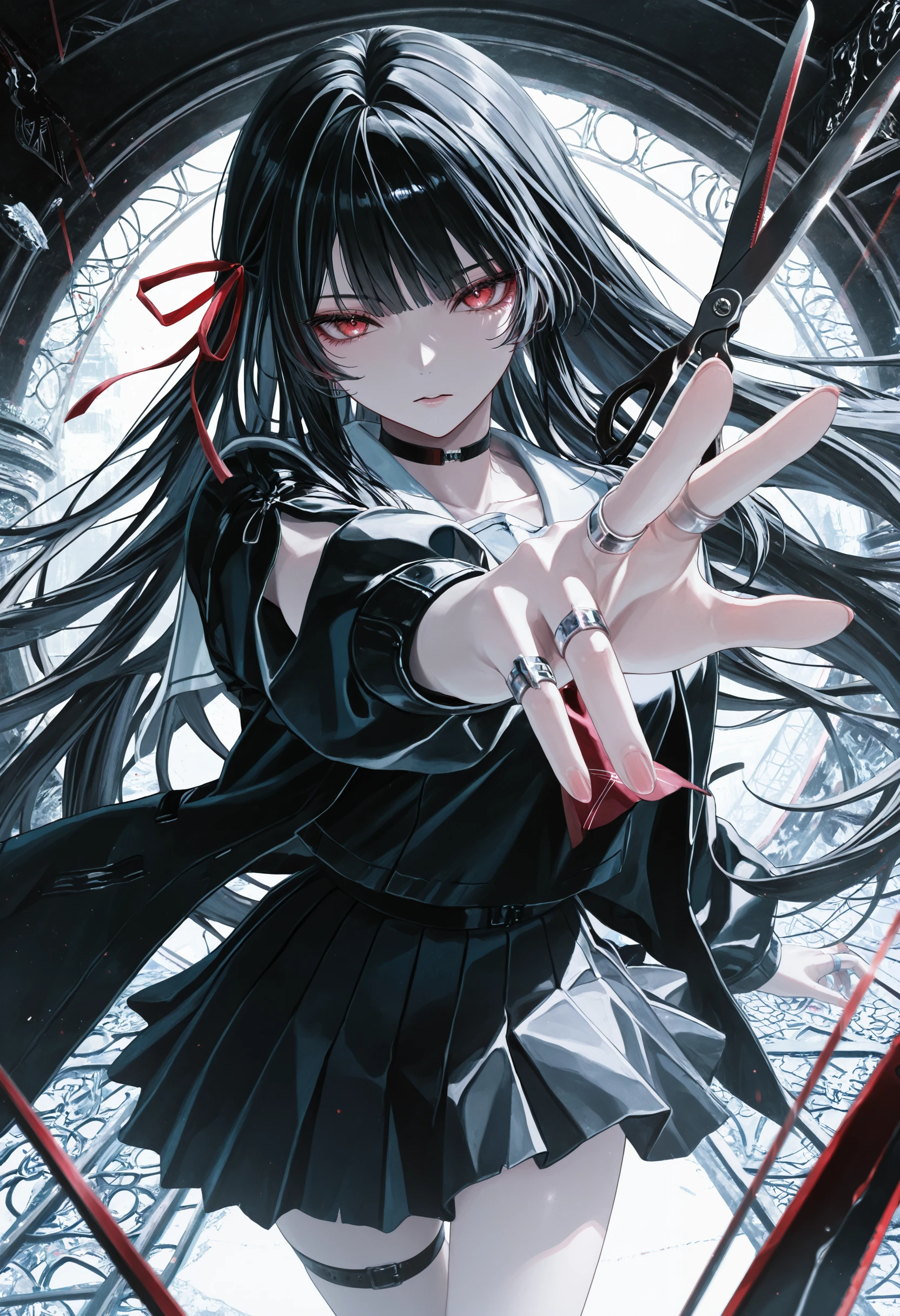 Default outfit: hair ribbon, choker, school uniform, midriff peek, black serafuku, white sailor collar, red neckerchie, jacket, black skirt, pleated skirt, thigh strap, torn clothes, multiple rings, black footwear, black socks