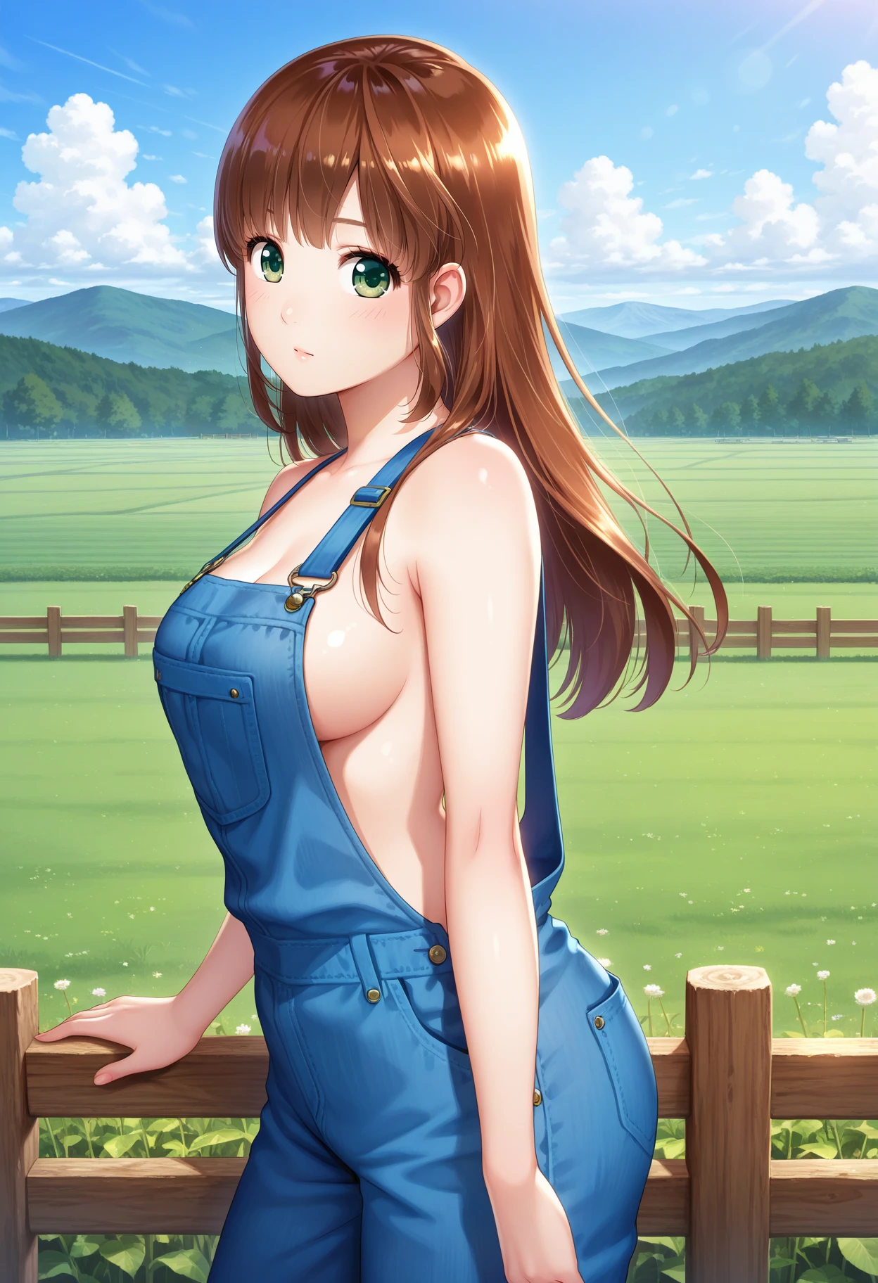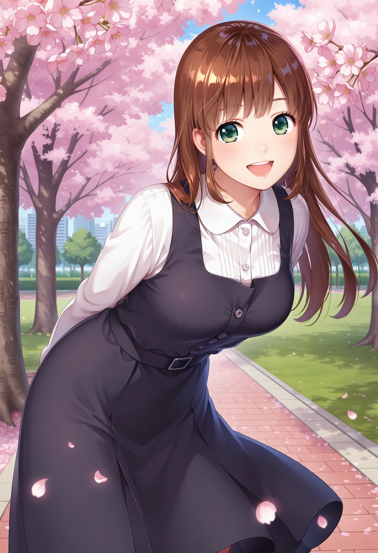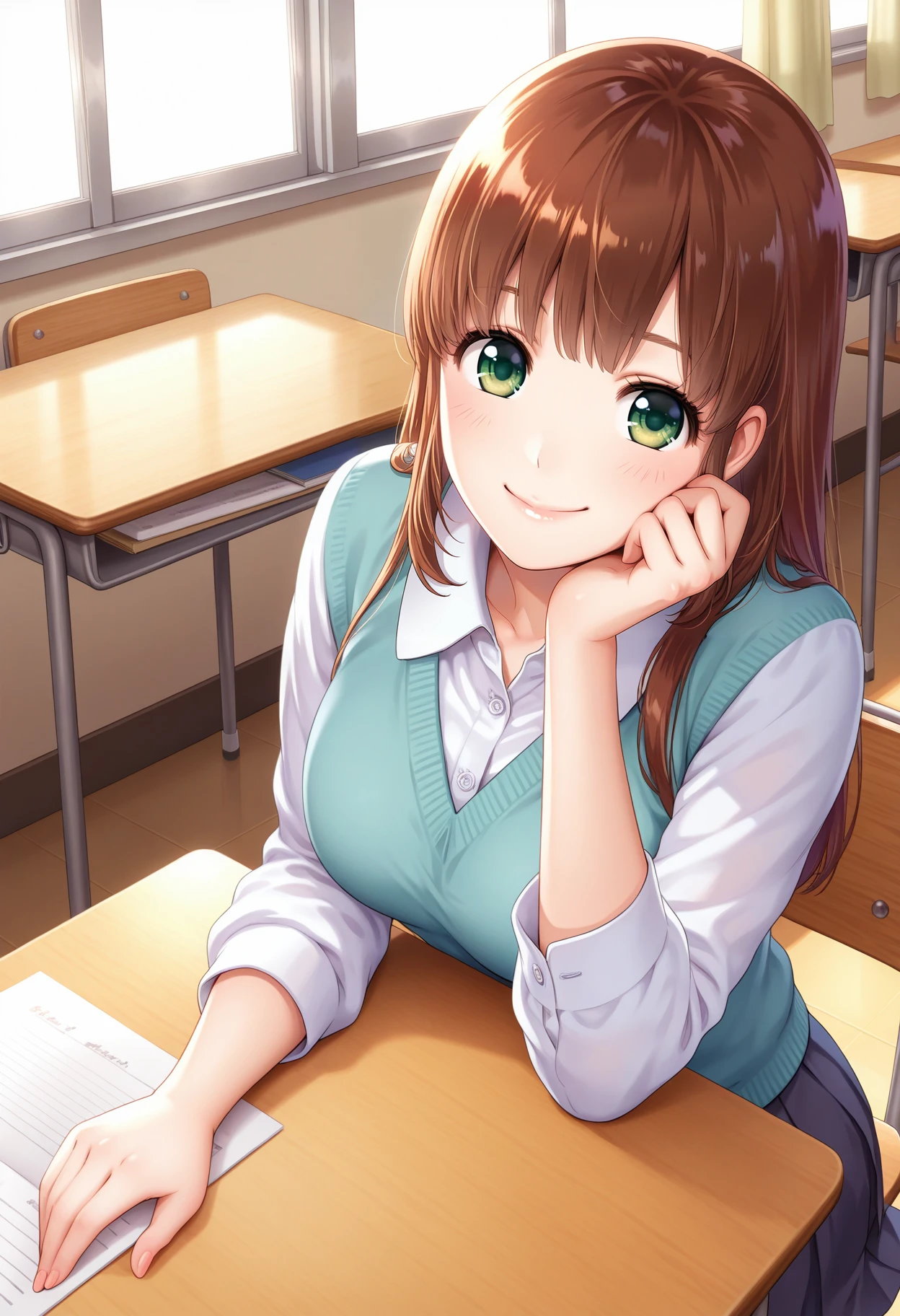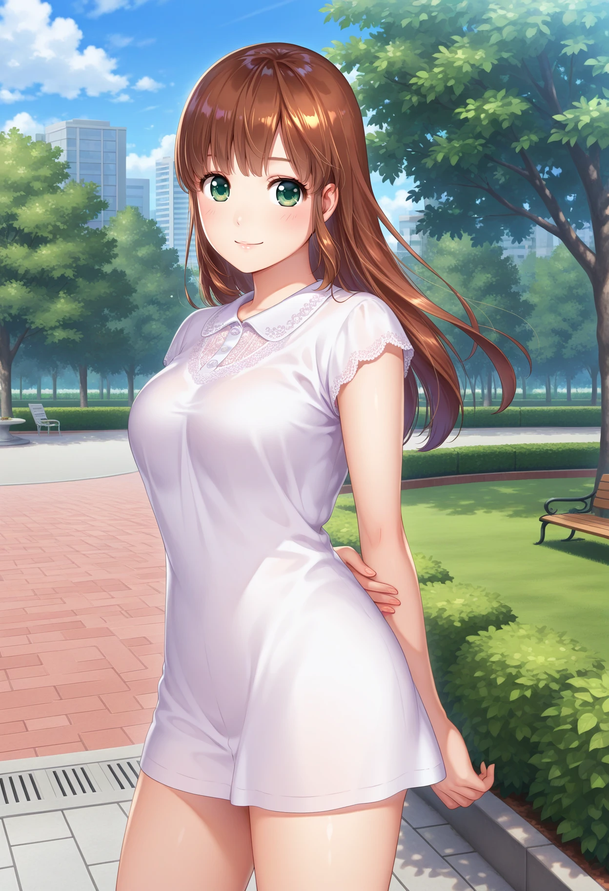 character appearance (anime style)aahina, long hair, brown hair, green eyes, medium breasts, anime coloring