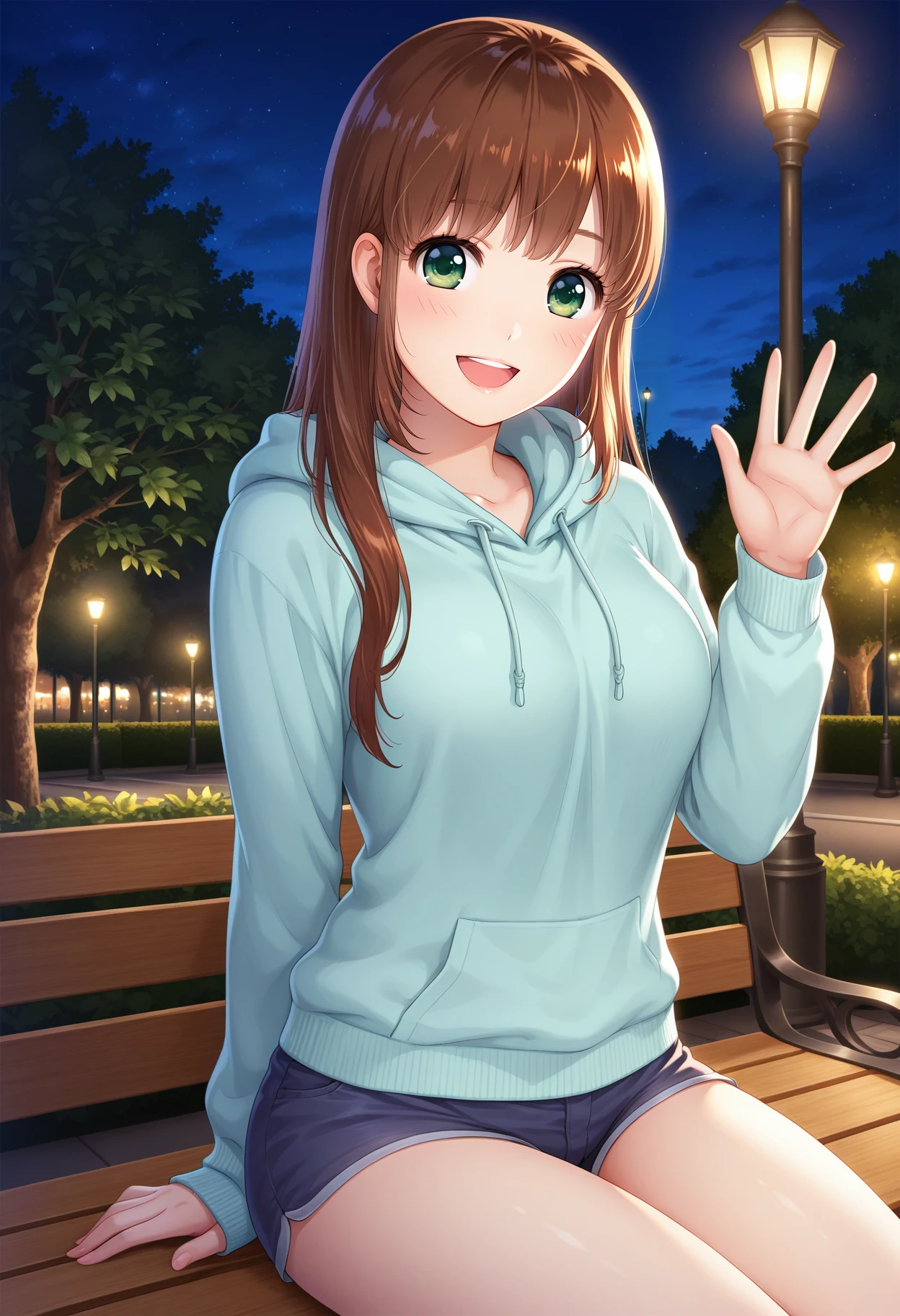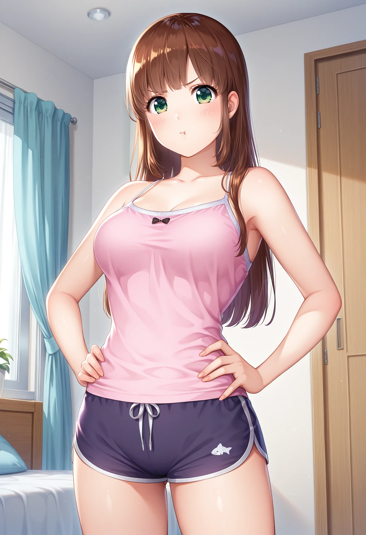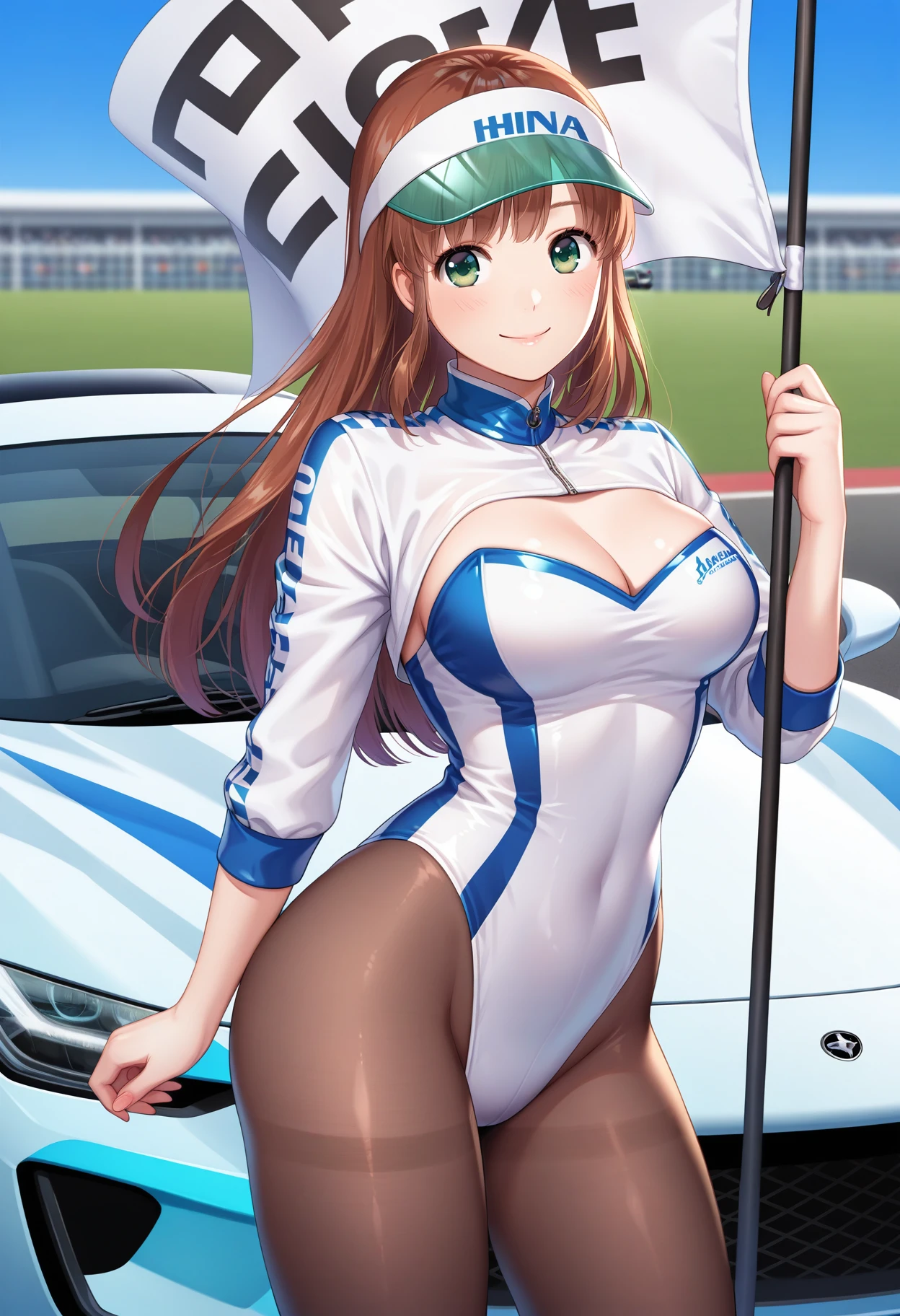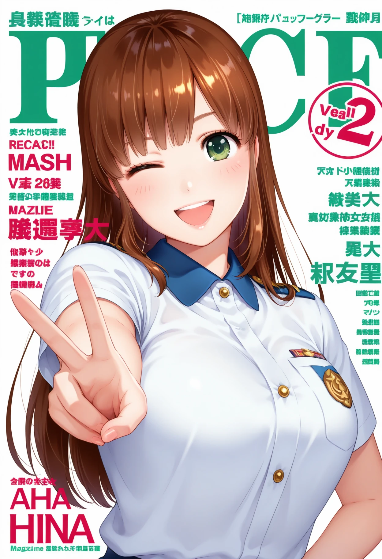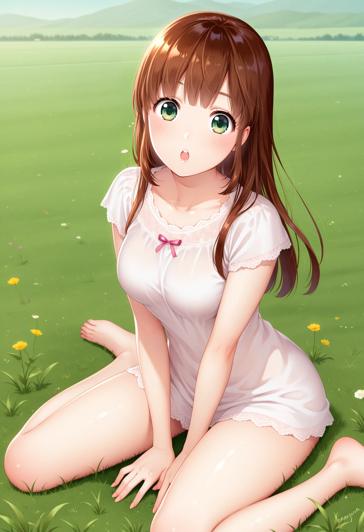 character appearance (anime style)aahina, long hair, brown hair, green eyes, medium breasts, anime coloring
