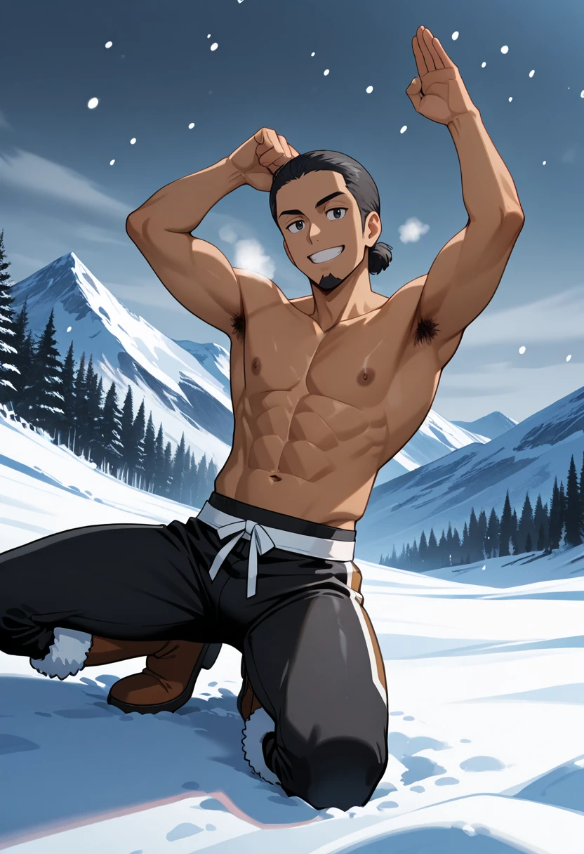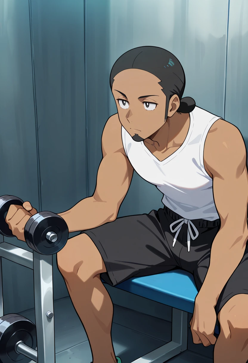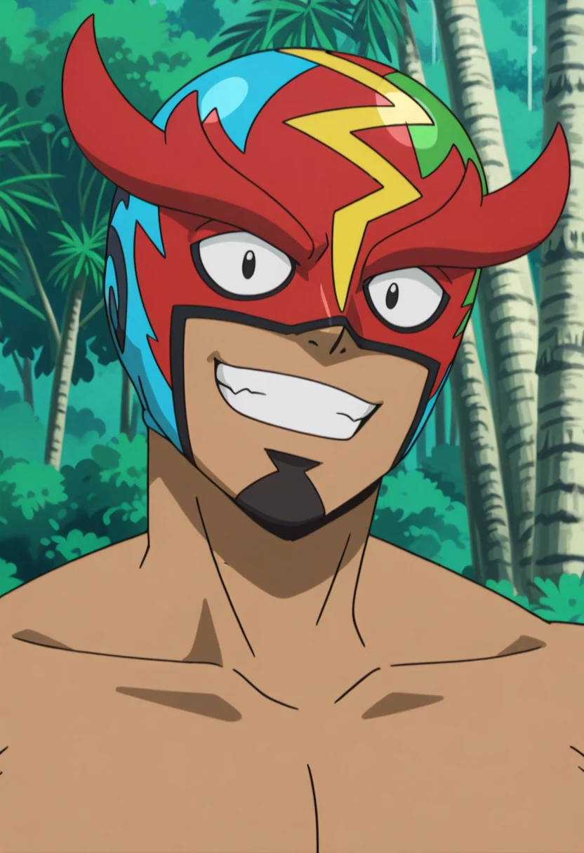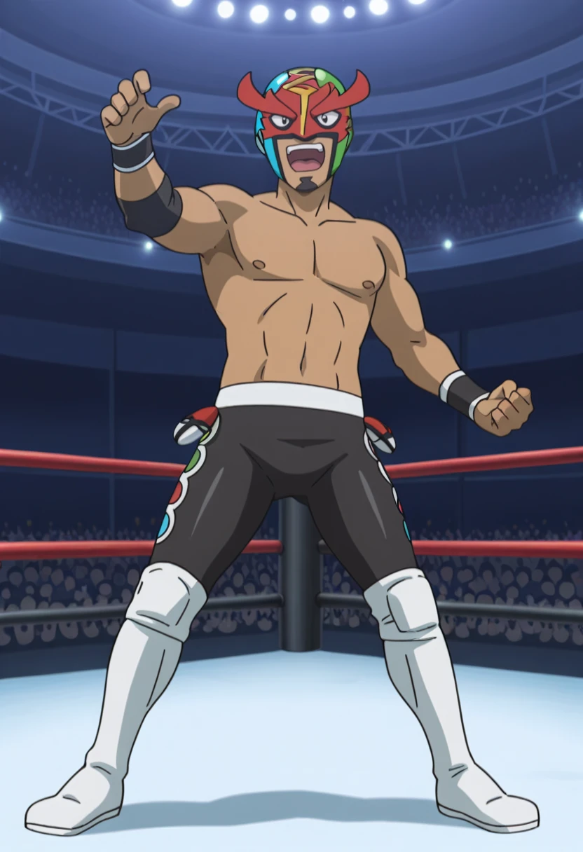 Kukui, MaskedRoyal, 1boy, solo, dark-skinned_male, black_eyes, goatee, luchador_mask, black_armbands, left_arm_bands, right_arm_band, black_wrestling_pants, colorful_circle_pattern, white_boots, anime_screenshot